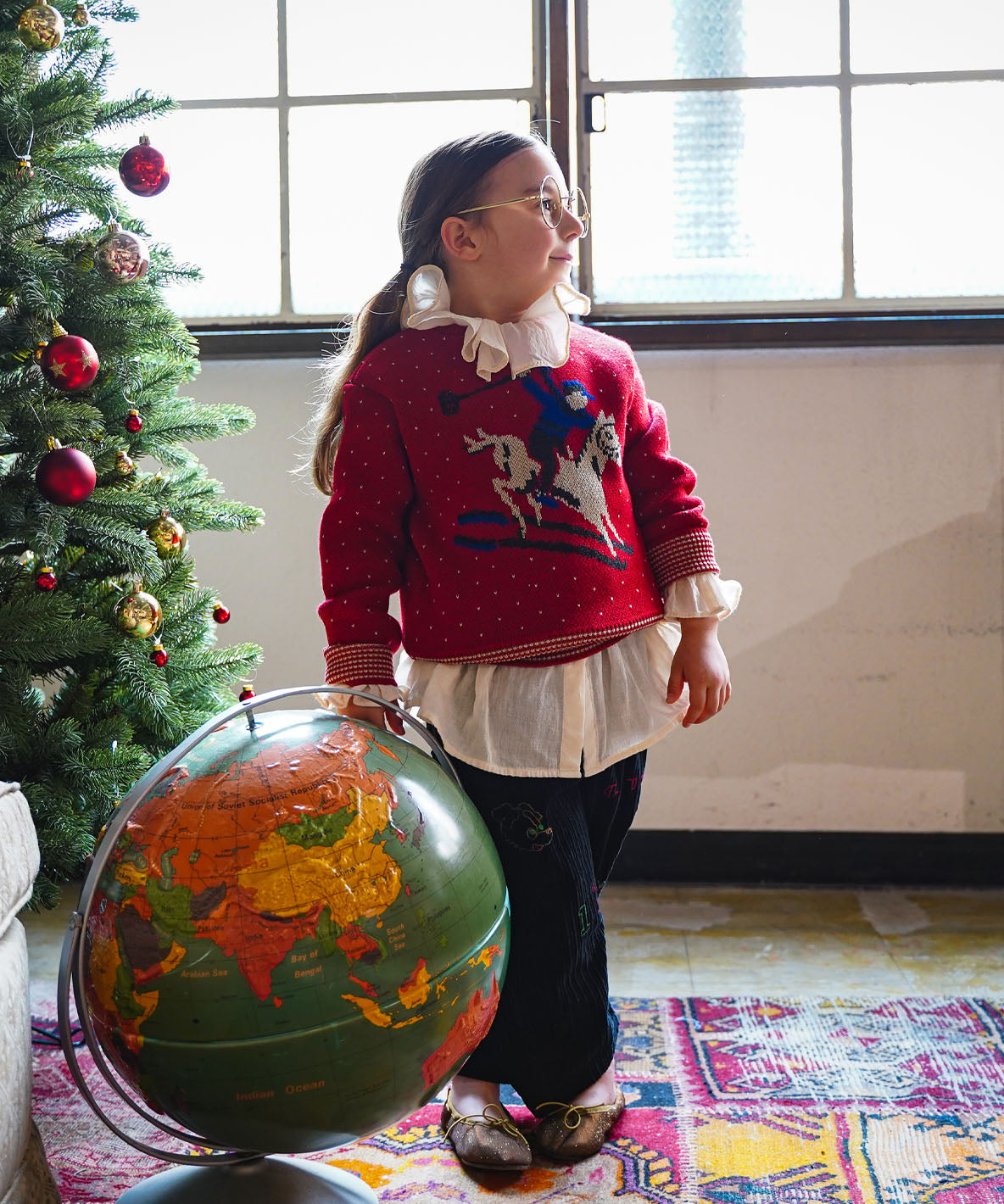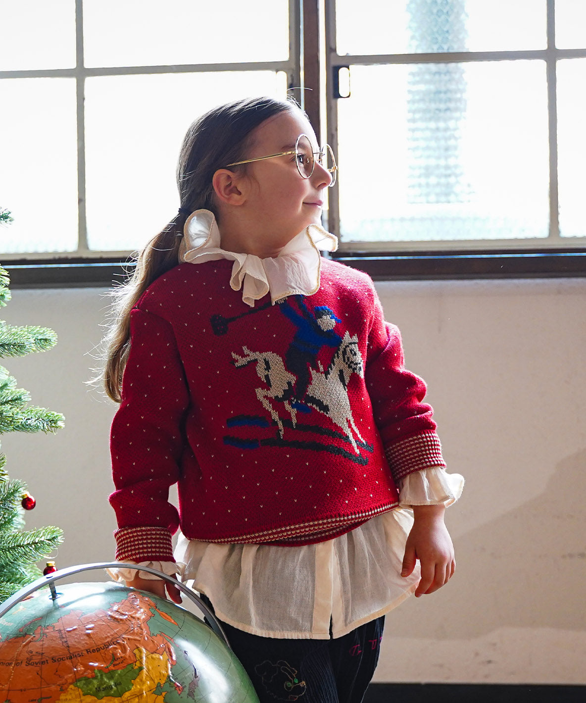 This sweater is completed with thick knit material. Enjoy this humorous design with a horse skiing.