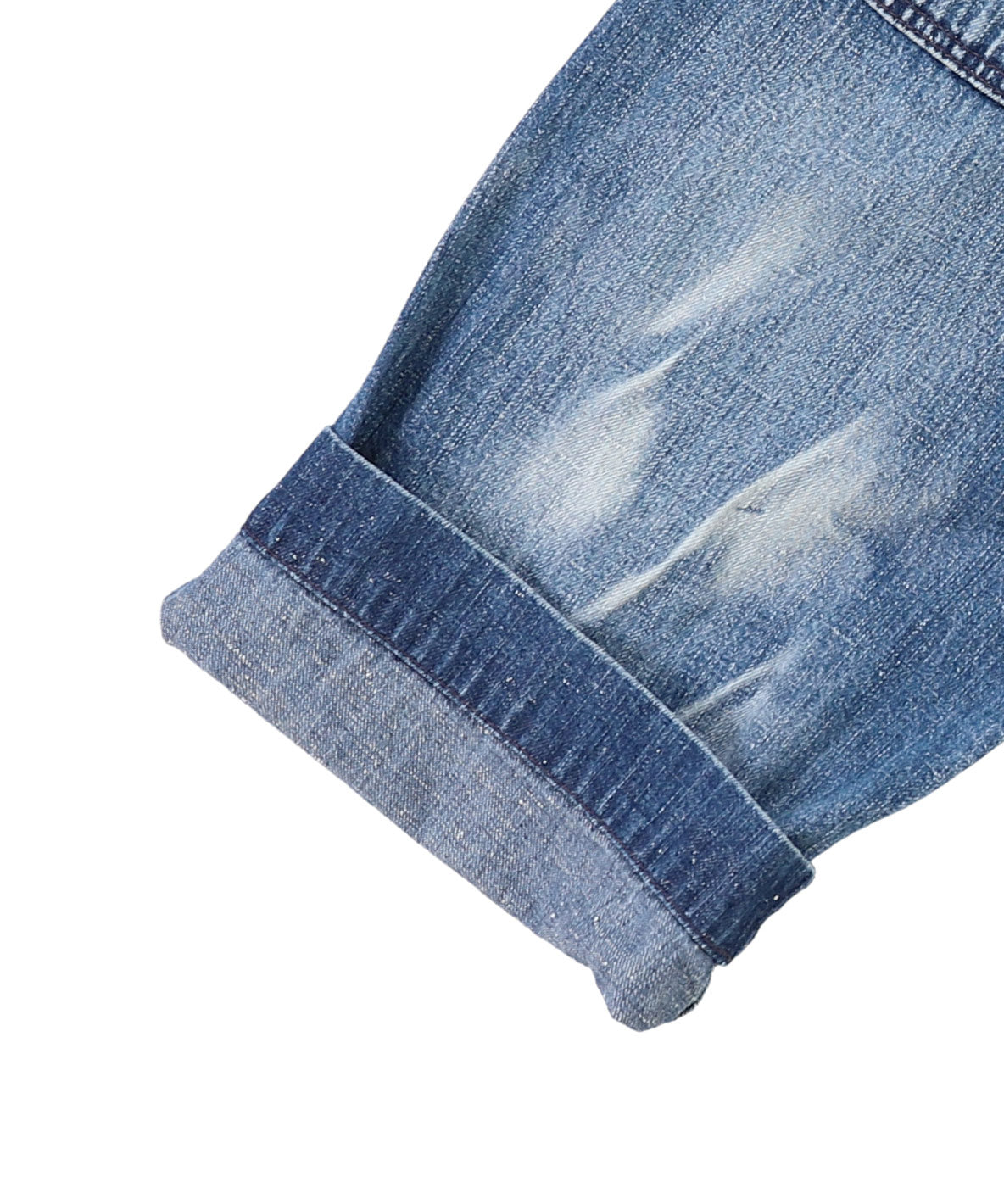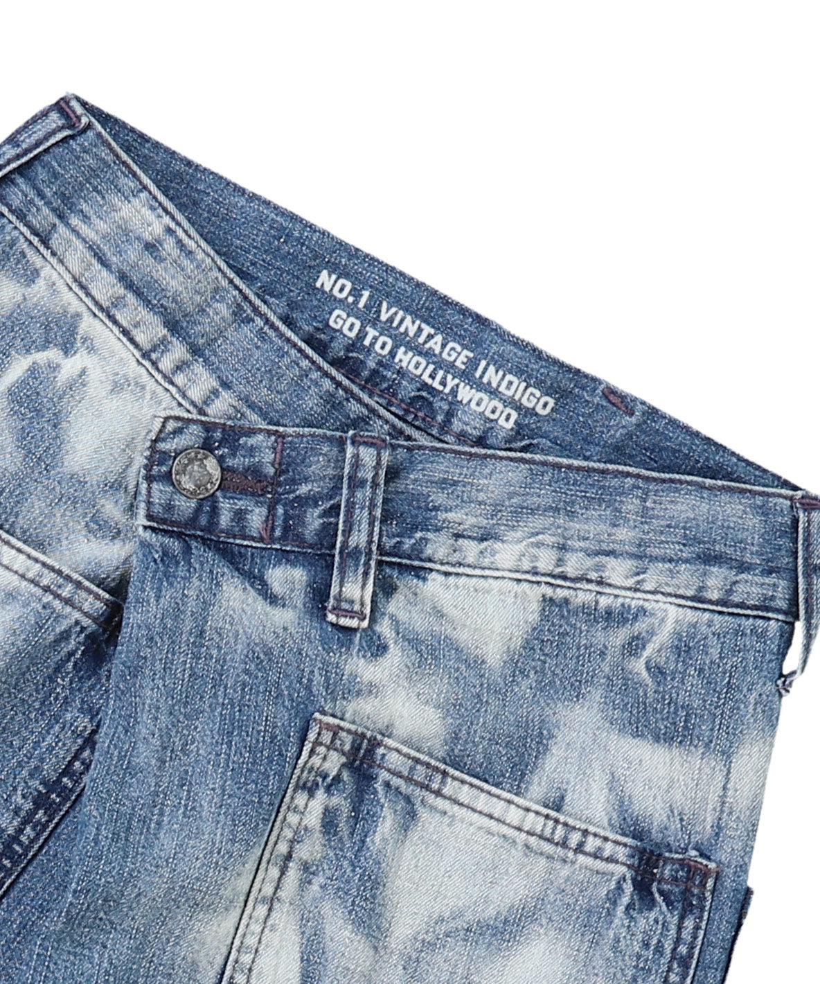 Made in Okayama where is known for the world-class denim producer. These elegant unique texture denim pants: so-called "wrapped pants" are using GTH original light denim. They are completed with indigo as warp and big nep yarn as woof. They are inspired by side-seamless denim pants worn by US NAVY in the 40s. They are designed like wearing big sized pants with tucks on one side.