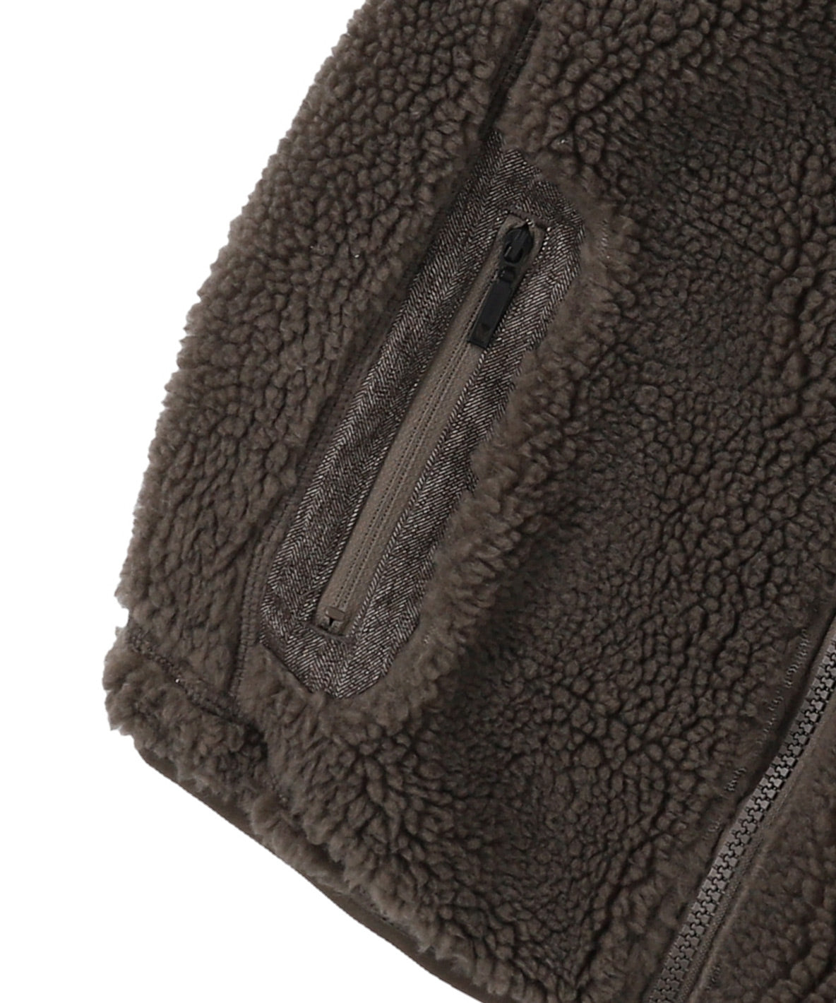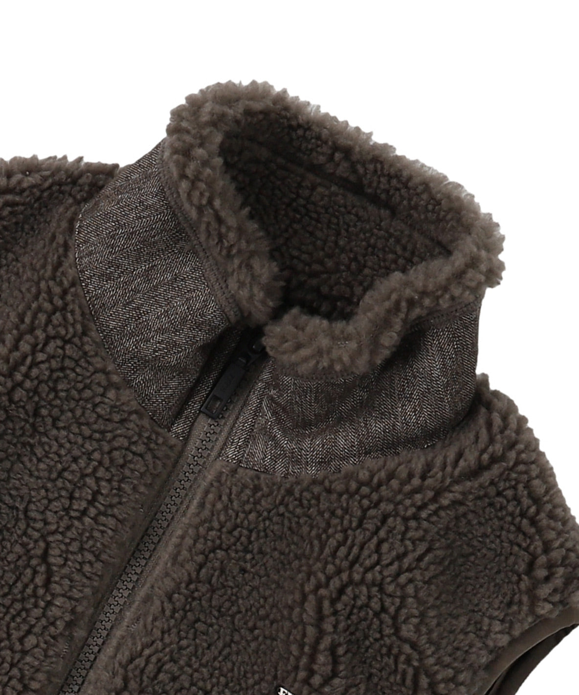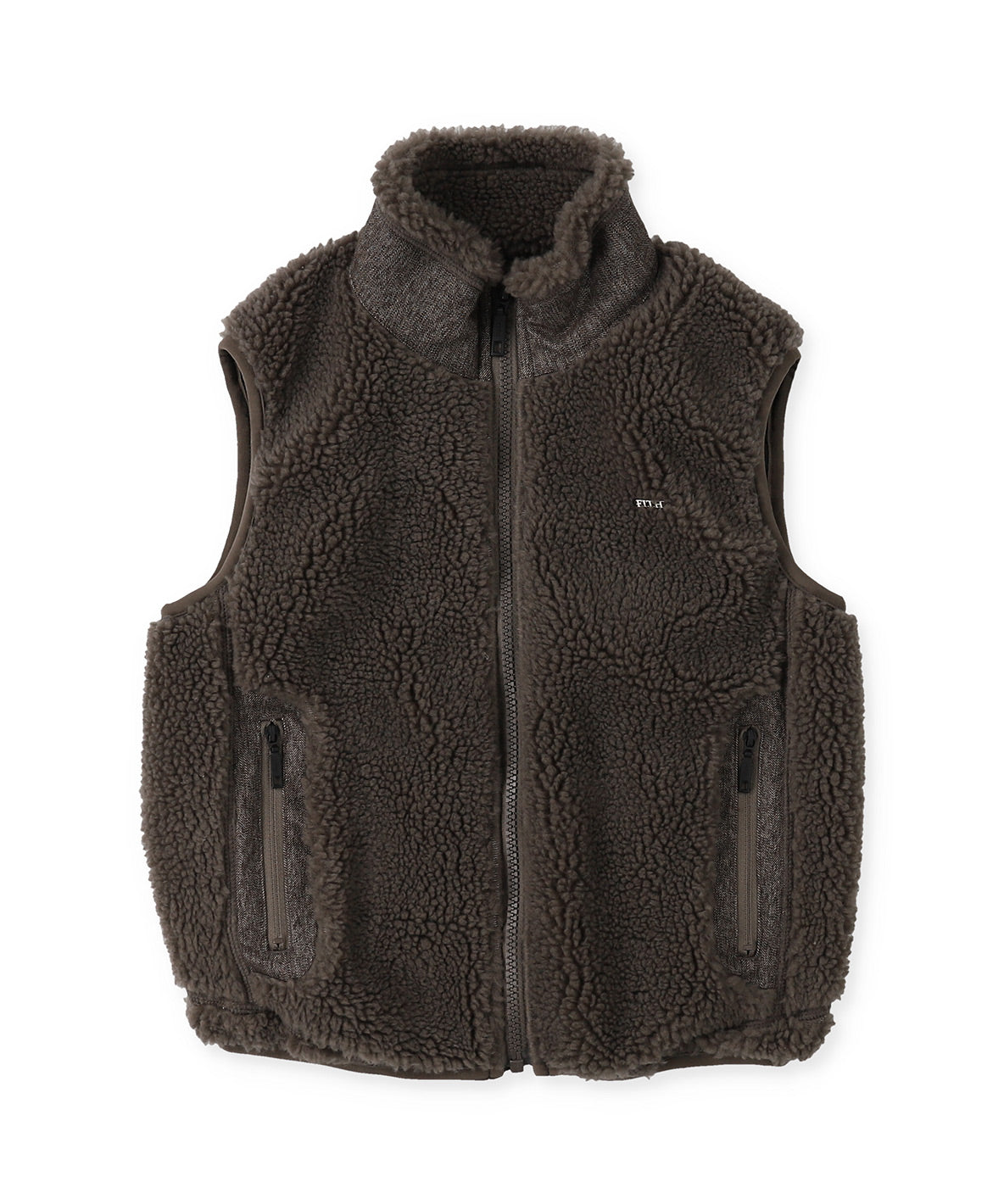 Light boa vest. This voluminous silhouette vest is using recycled polyester yarns from plastic bottles. 14 of plastic bottles can produce a T-shirt. Recycled products can help reduce CO2. Detailed with wide armholes. You can wear a big silhouette shirt or pile inner in layers under this vest. It is using a stretchy mesh with field sensor as lining.
