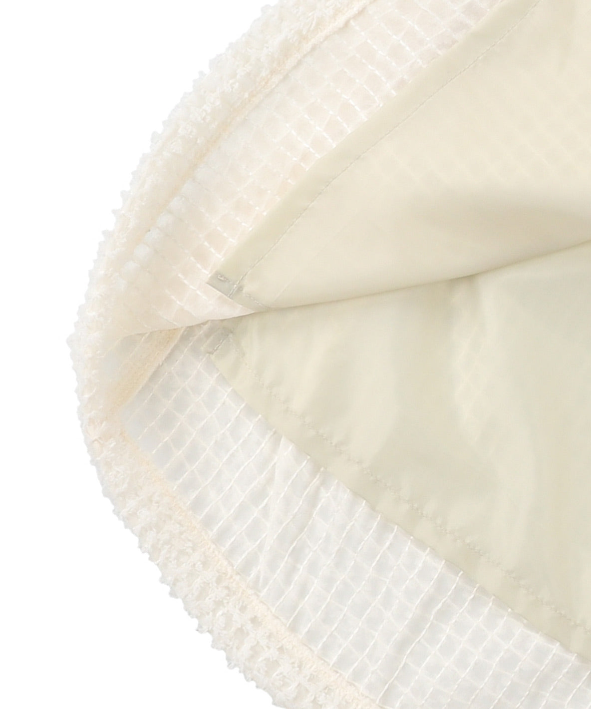 This dress is completed as dropping shoulder design and rounded silhouette with darts on cuffs. Using hollow structured fabric which features in bulky but very light. It has a heat contain funtion by containing the air inside. Completed the skirt part with the feather yarns. It is characterized with embroidery-like finish on the chiffon fabric. 14BL: Detailed with the anti-see-through lining.