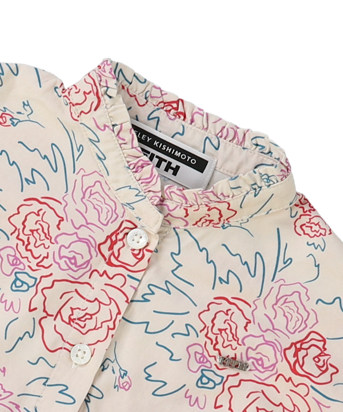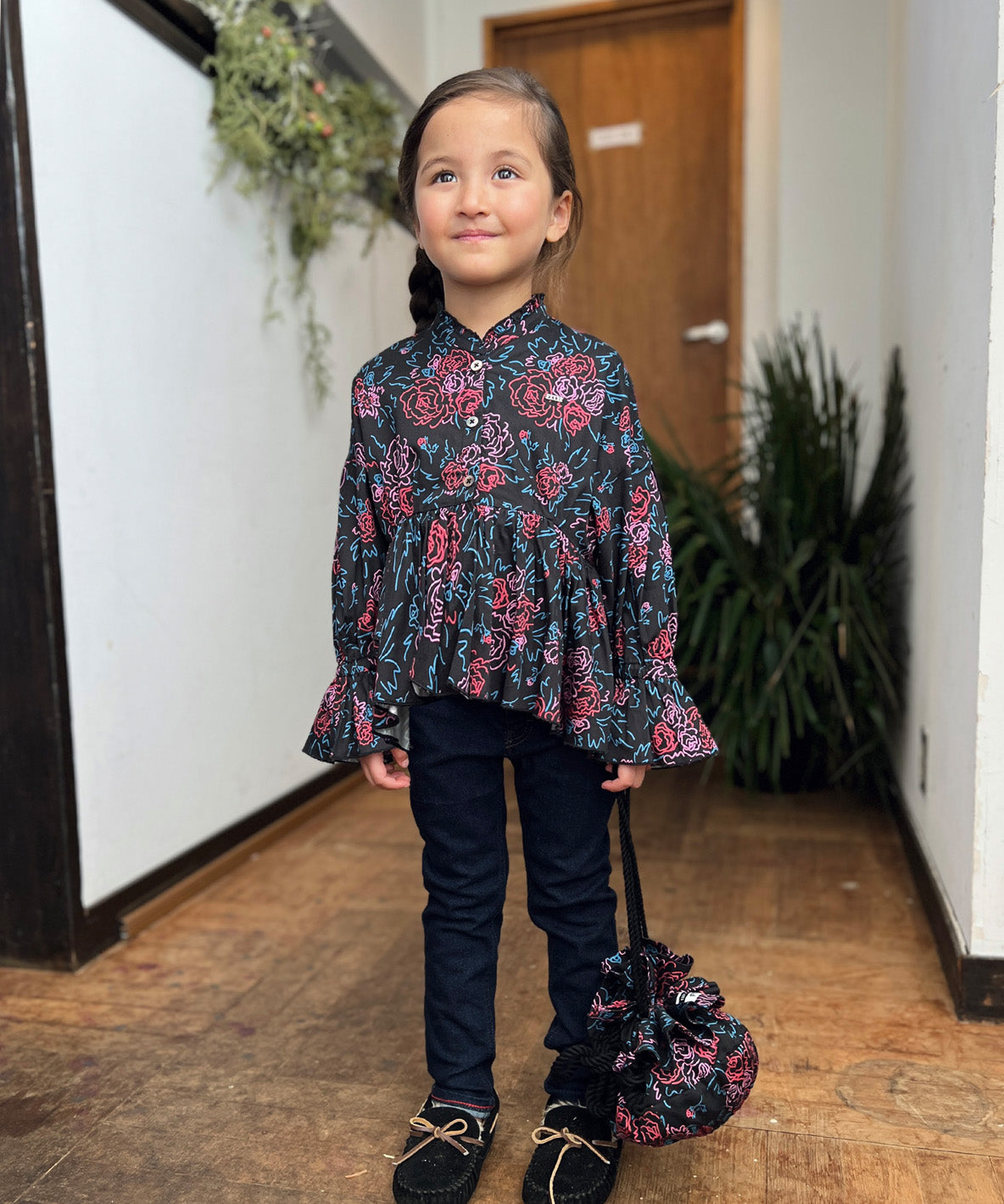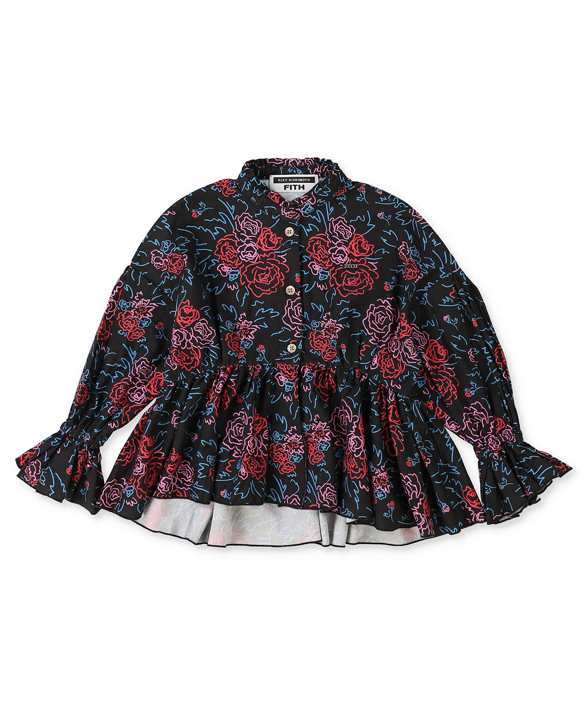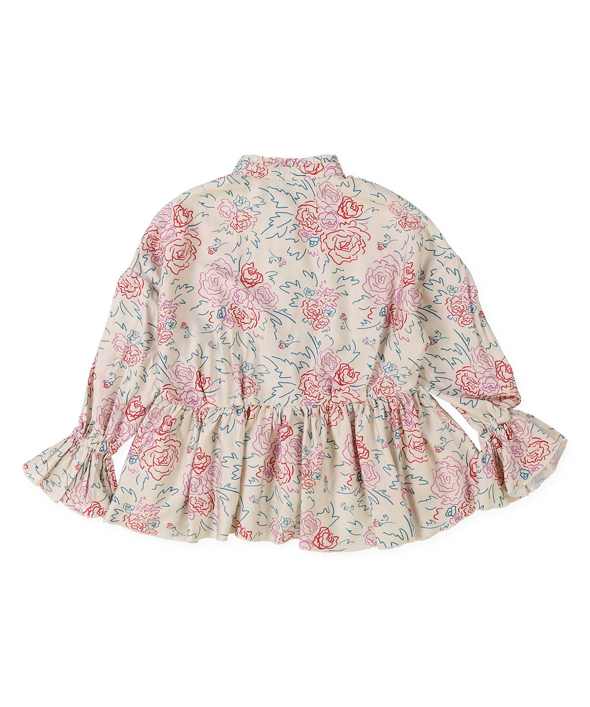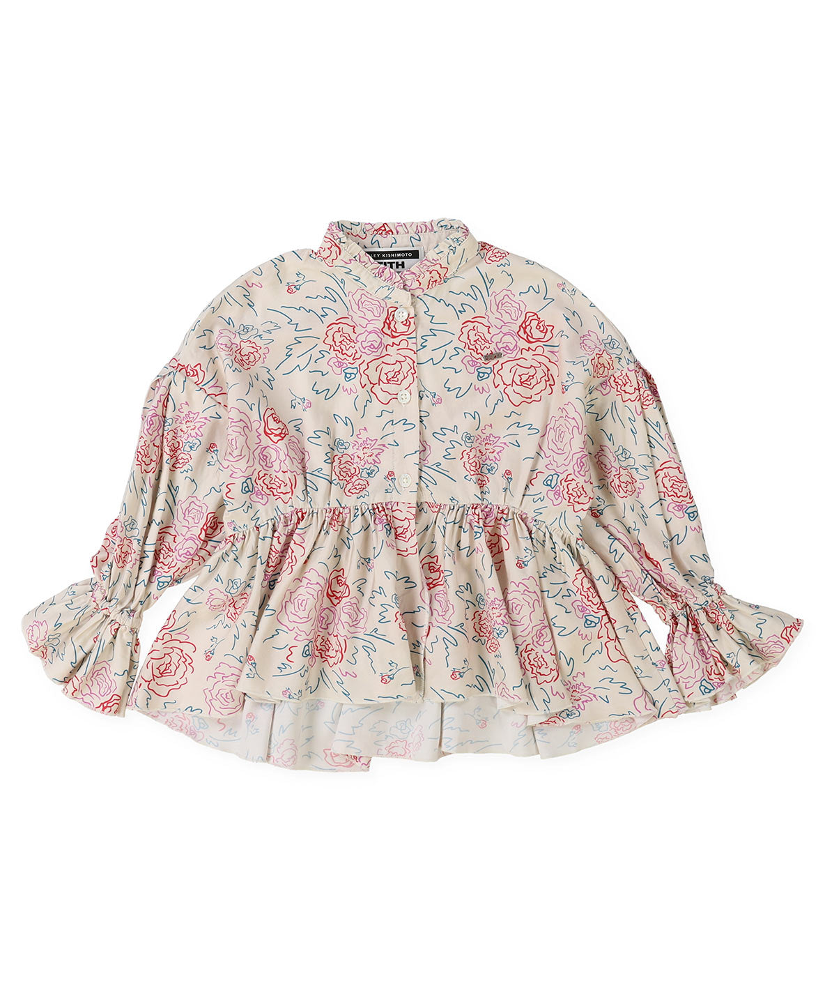 This rounded silhouette is detailed with big tucks on sleeves. This long sleeve blouse is completed with the flared design. Detailed with gathers on waist and the front-opening design. Completed with the textile designed by ELEY KISHIMOTO.