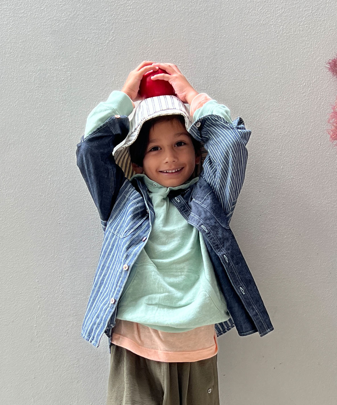 This Indigo chambray shirt is using uneven yarns. Made in Okayama. This fabric will become vintage mood with color fading after repeated wearing. Completed in the switching design with two types of striped pattern and chambray. It matches well in your casual styling.