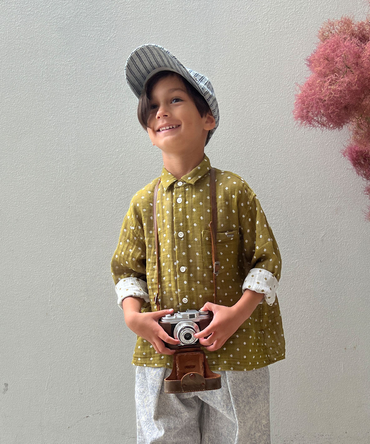 FITH original fabric. This double-weave dot jacquard material is completed with jacquard weave machines. You can find 3D design and luxurious that cannot be expressed with printed fabric. It features unique, soft and light texture that cannot be completed with straight yarns, but slub yarns. Designed in semi-loose silhouette