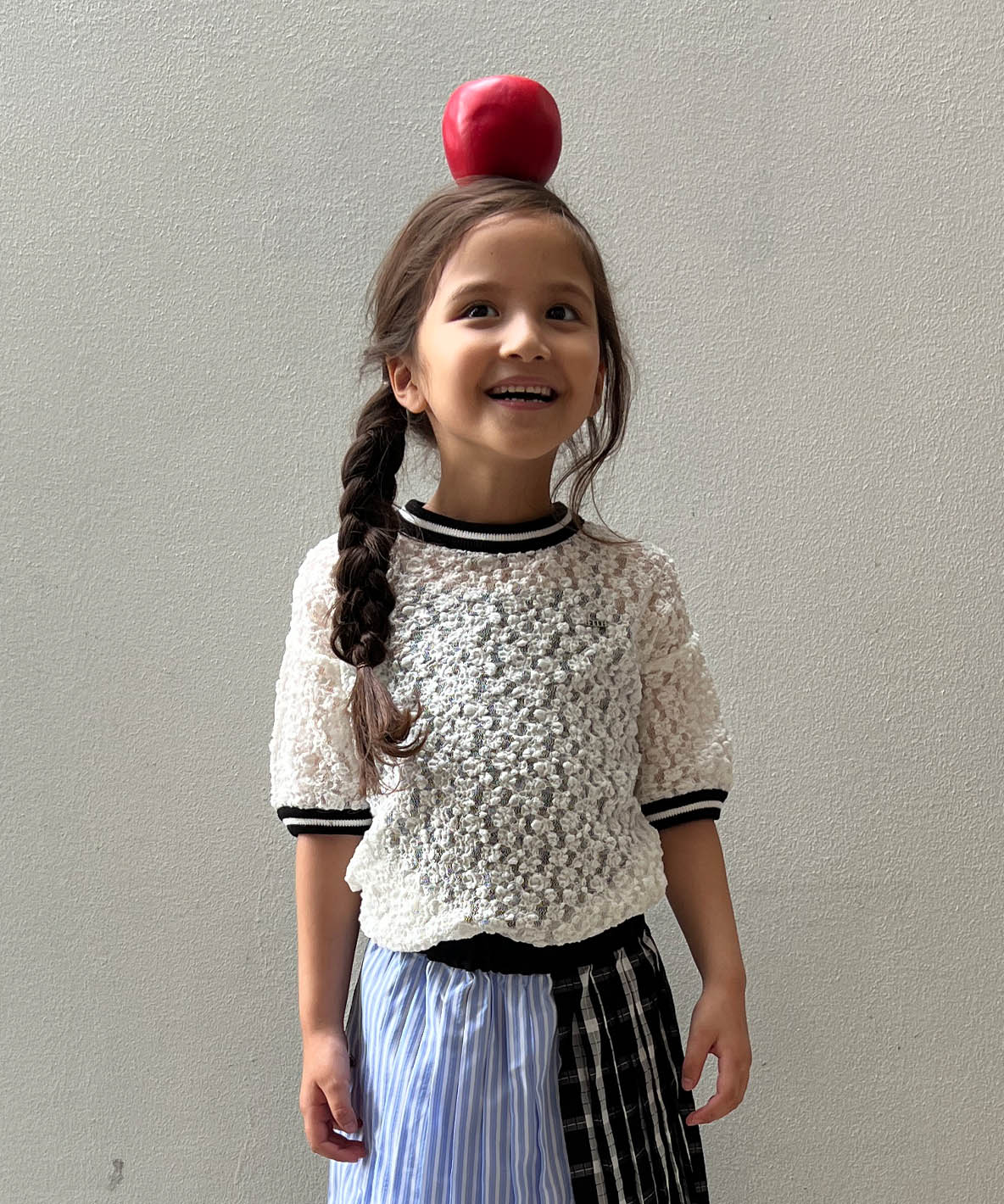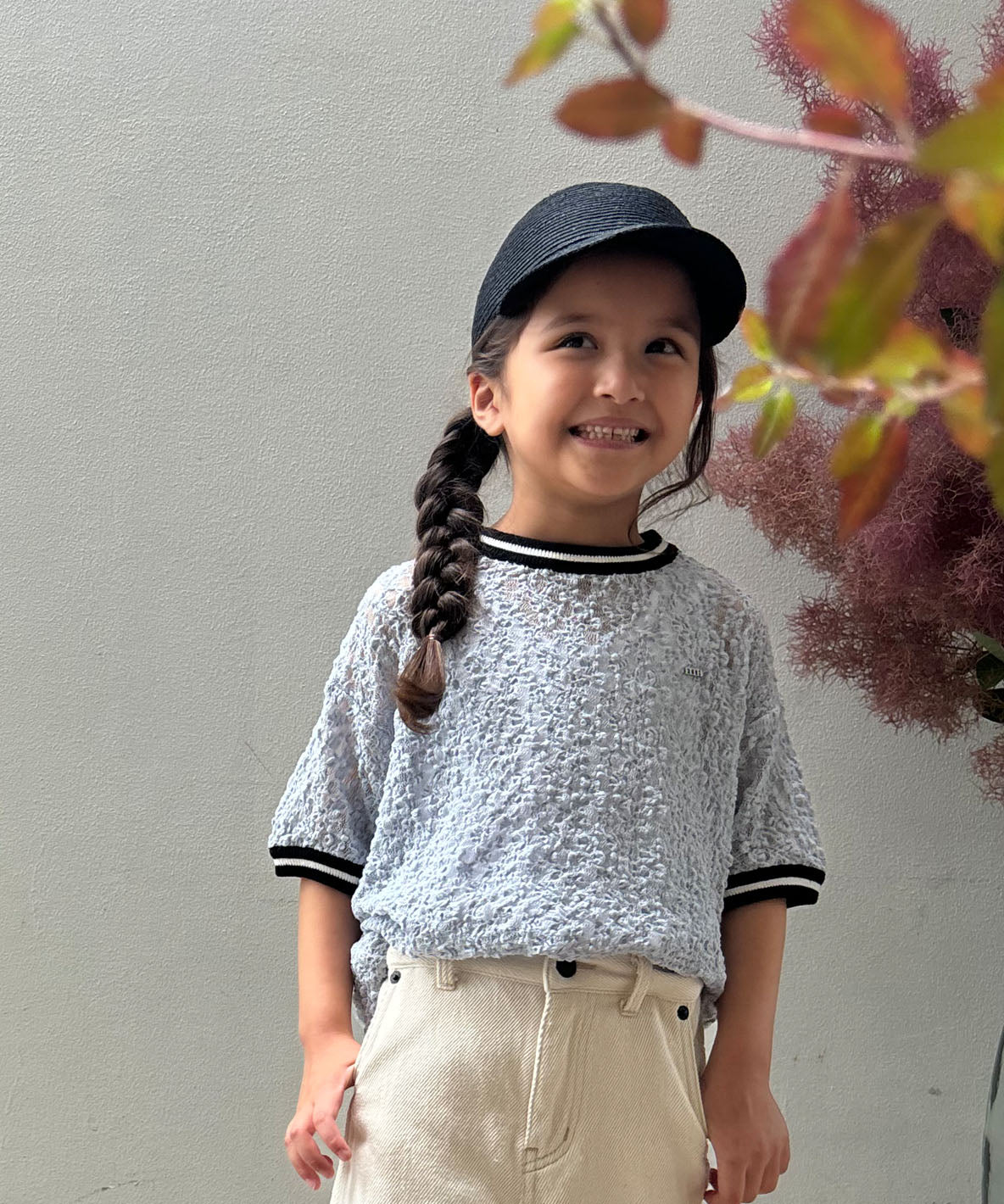 Delicate lace T-shirt. Designed with shrunken lace using organic cotton. Made in Fukushima, Japan. This lacy pattern looks 3D in this fabric by using PU as the edges of pattern. Characterized with unique shrinks and stretches. This T-shirt is stretchy, effortless and light to wear. Features knitted ribs with line on cuffs and neckline. Completed with the semi-sheer fabric. Recommended for the layered outfit with a sleeveless topwear or camisole dress.