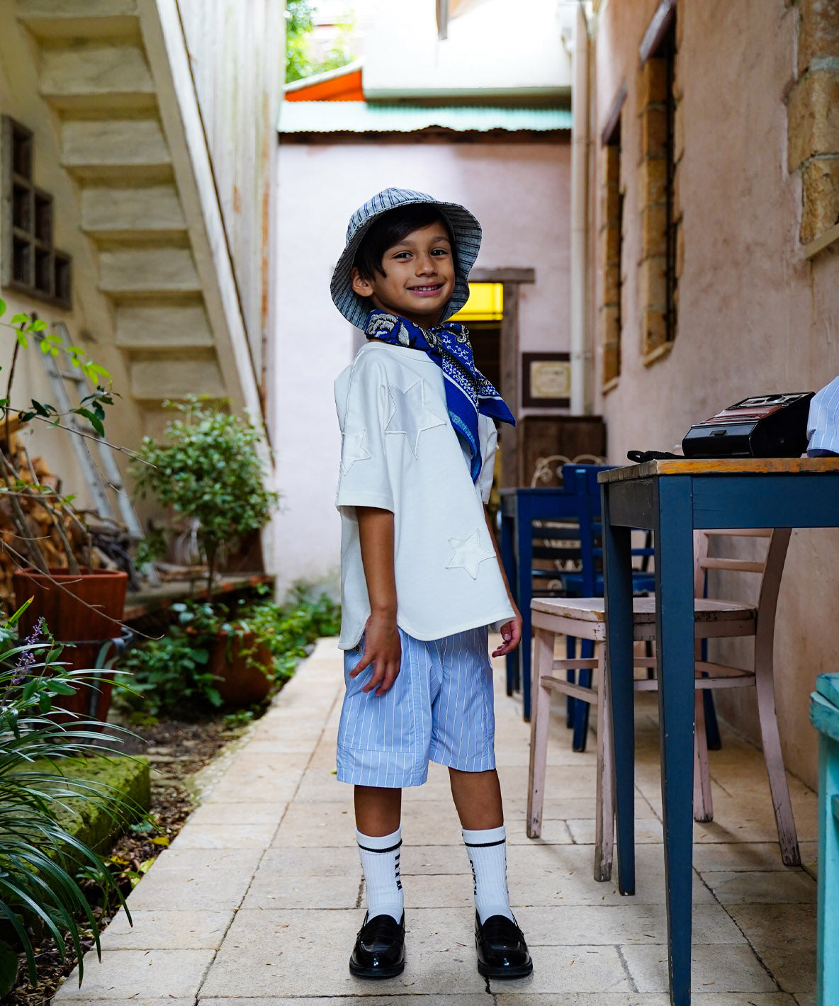 Decorated with star appliques. FITH original cotton jersey woven with no. 32 double yarns. Double yarns are twisted yarns of single yarn. It features less fluffing and tough material by using double yarns. Characterized with smooth texture and shiny cotton like silk by mercerization. Mercerization can strengthen fiber and make fabric less wrinkles. It may show a strong durability after repeated laundry by using premium yarn.