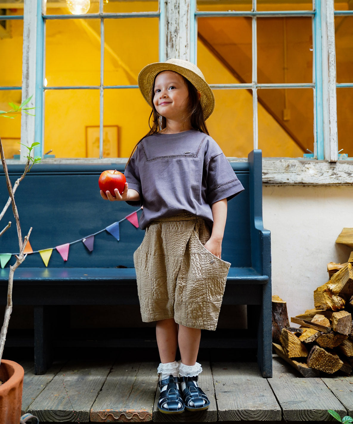 These half length pants are using seersucker fabrics which have different waves. Completed with random patchwork design woven vertically and horizontally. These patchworks are completed by hand and woven each cloth one by one. This quality is only completed by handicraft, not by machine. They are easy to wear with elasticated waist. Accented design with side pockets. Wrapped and asymmetry design.
