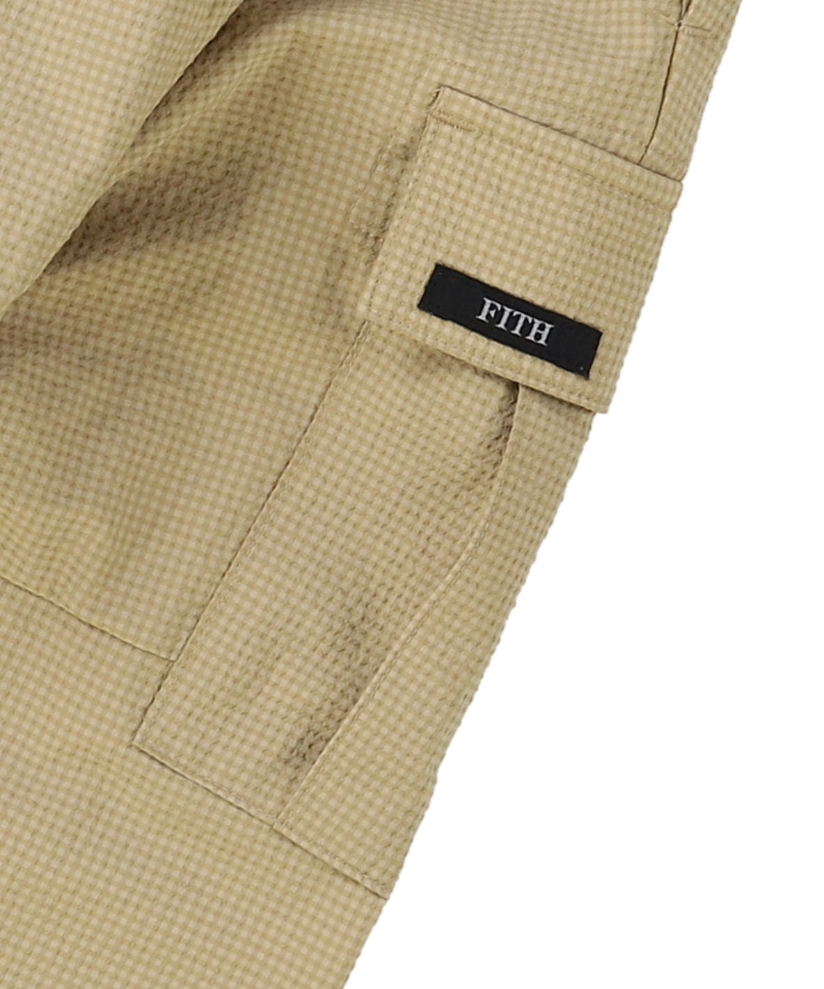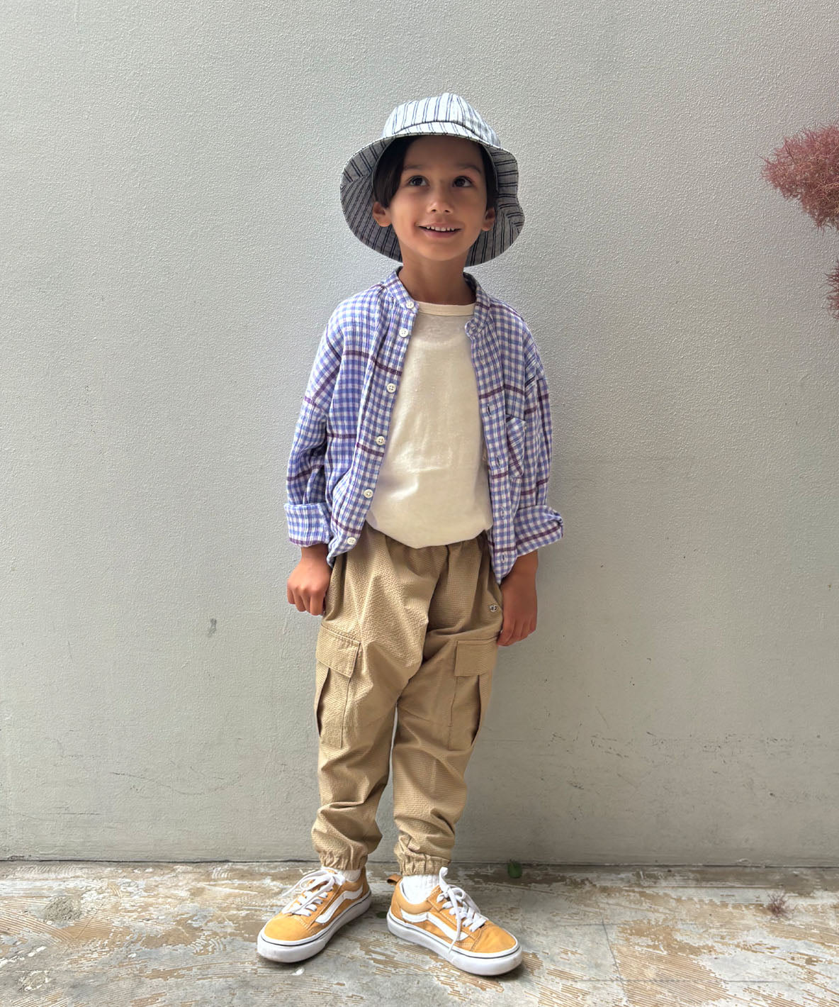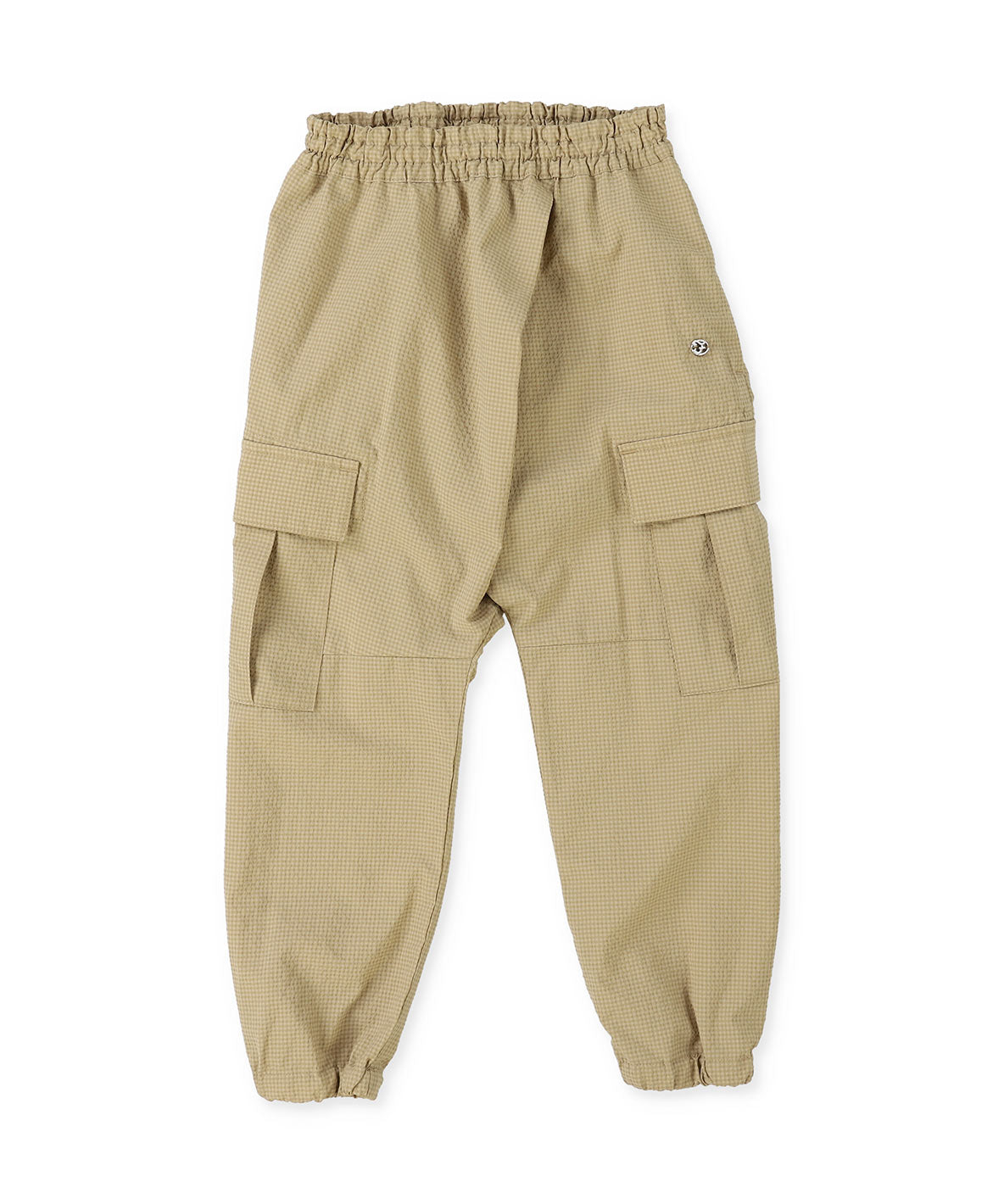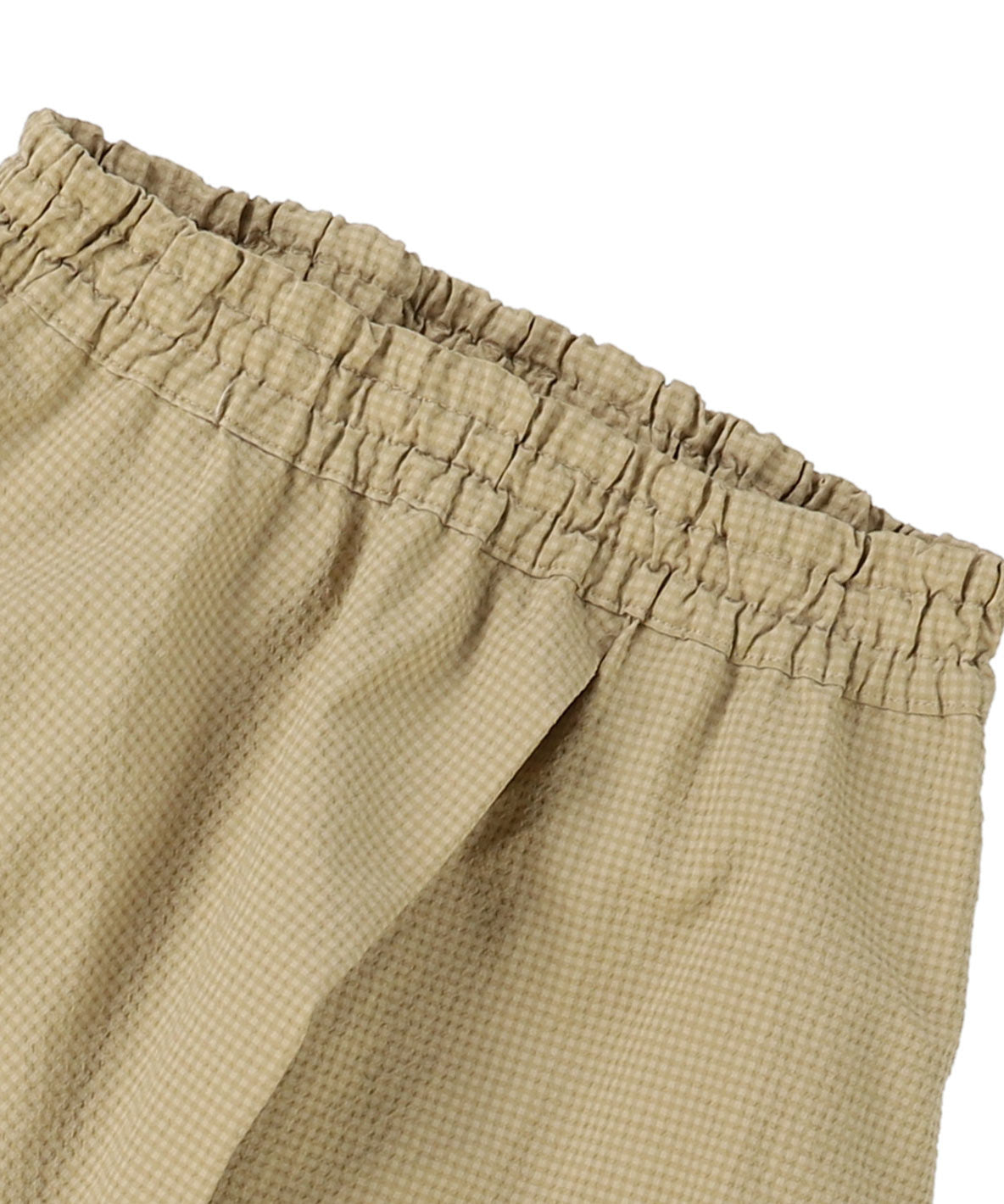 Asymmetry cargo pants in slim silhouette. Using SOLOTEX with supple elasticity. It stretches vertically and horizontally. It looks refreshing with unique nubby texture which seersucker fabric original has.
