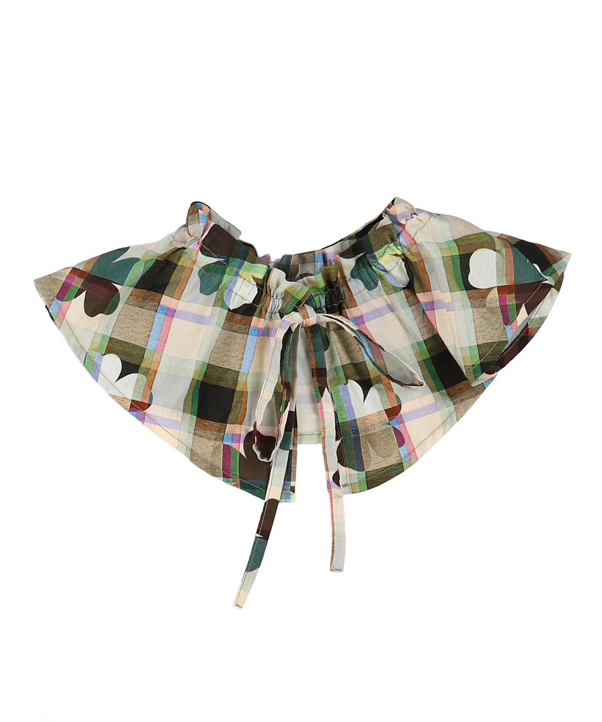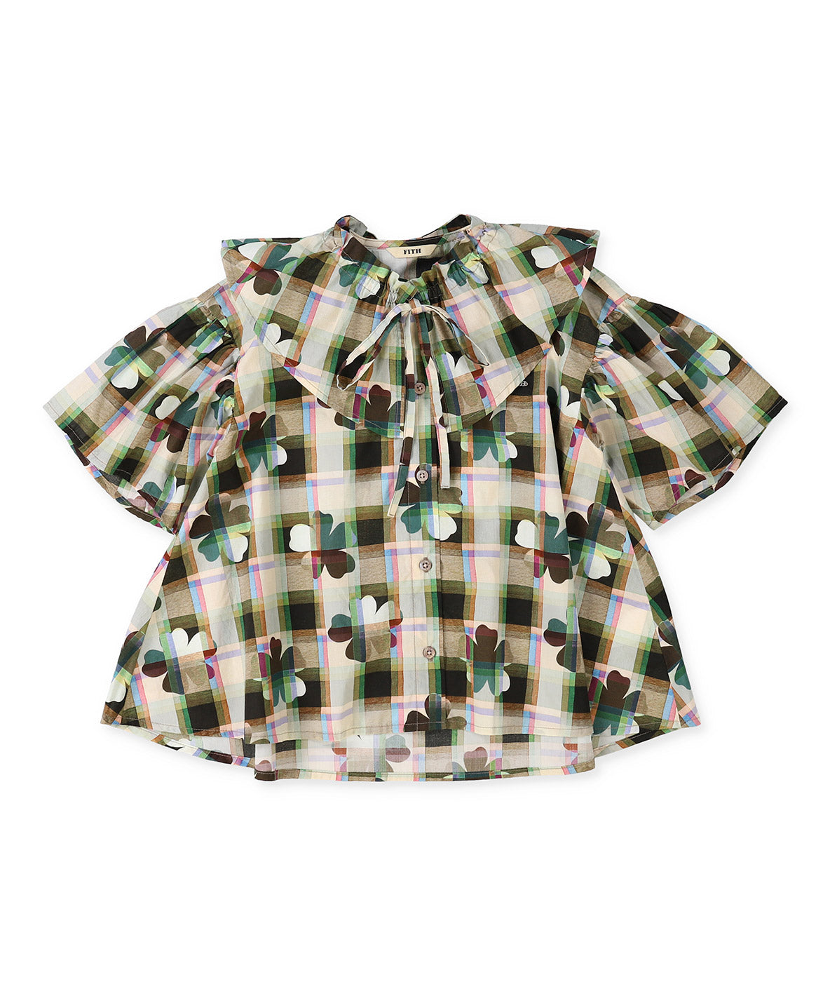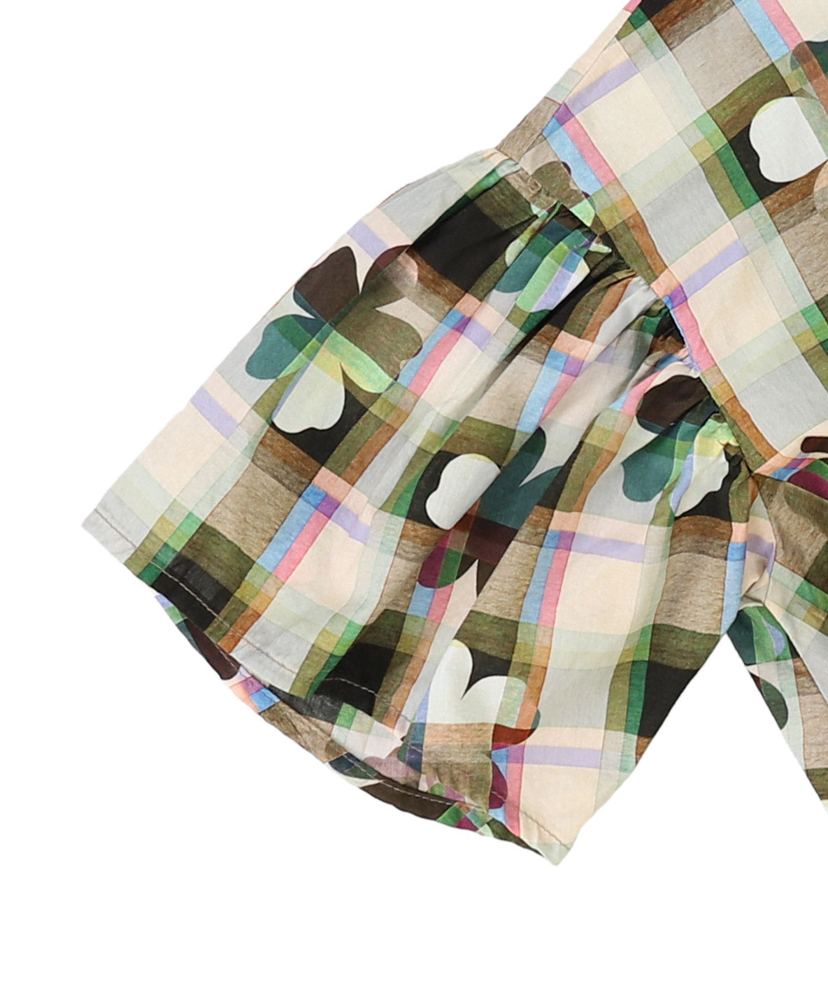 Collaboration with LIBERTY. 100% cotton fabric developed by LIBERTY to aim less-wrinkles and smooth fabric like silk. This pattern is named "TUDOR PETALS". This pattern is inspired by woody and handcrafted tudor roses decorating LIBERTY's stores. It is designed as a modern homage to a historic building that has been loved for a century and a half. Completed with visually impressive floral prism. This pattern is layering briar rose silhouette + shadowy striped pattern which is drawn in watercolor and matched by digital process. Designed with a detachable collar and clean silhouette blouse without collar. It looks adorable and girly with gathered and airy sleeves.