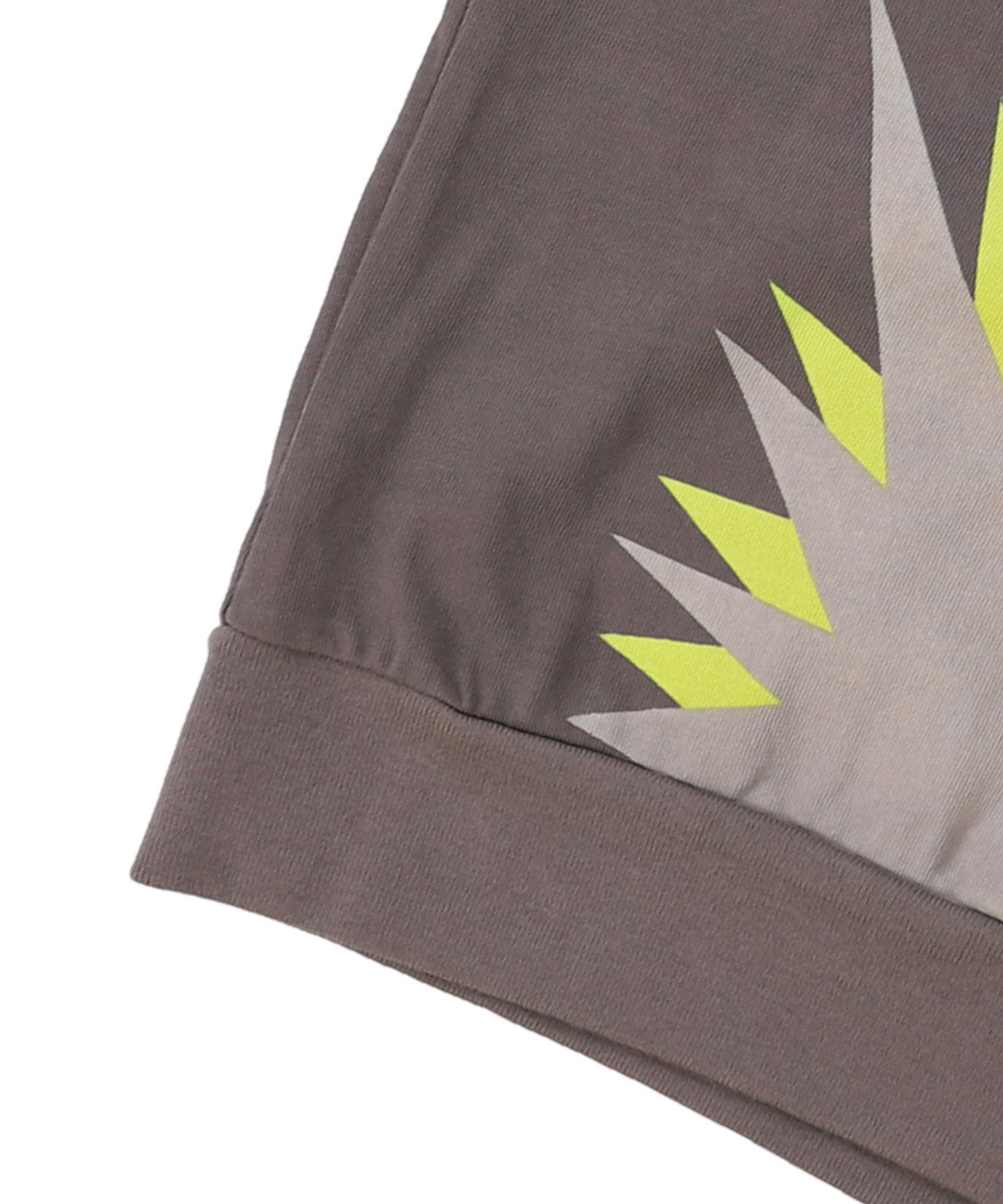 Collaboration of ELEY KISHIMOTO and FITH. S/S T-shirt with ELEY KISHIMOTO's graphic design. Completed in impactful visual and playful feeling with a tiger that appears to be coming out of a geometrically patterned jungle. Using FITH original cotton jersey woven with no. 32 double yarns. Double yarns are twisted yarns of single yarn. It features less fluffing, smooth texture and tough material by using double yarns. It looks shiny cotton like silk by mercerization. Mercerization can strengthen fiber and make fabric less wrinkles. It may keep shape after repeated laundry by using premium yarn.
