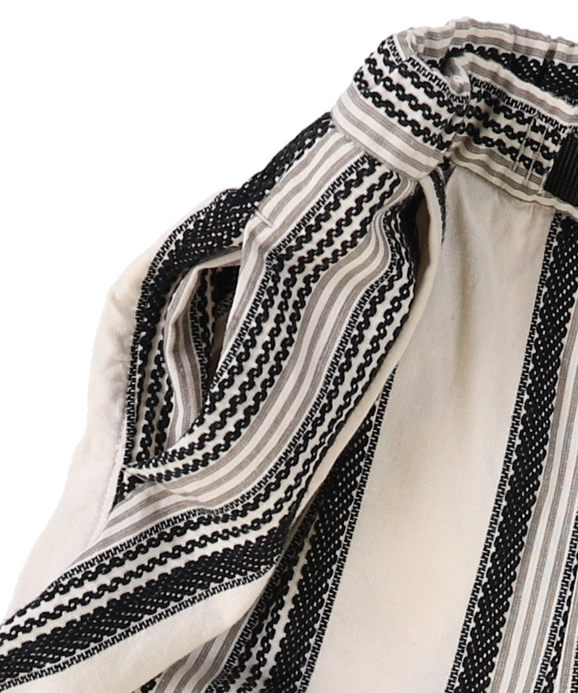 These semi high rise pants are detailed with double tucks and slightly tapered design. These pants are completed with dobby striped pattern woven by dobby weave machine. This pattern is using two kinds of yarns: no.10 and no.21 for warp. Dobby weave machine is known for unique weaving machine which can be particular about the number of yarns or thickness. This material features smooth and comfortable texture. It is perfect material for children with softness and lightness. Easy to wear. FITH original and iconic buckle has luxury FITH logo on.