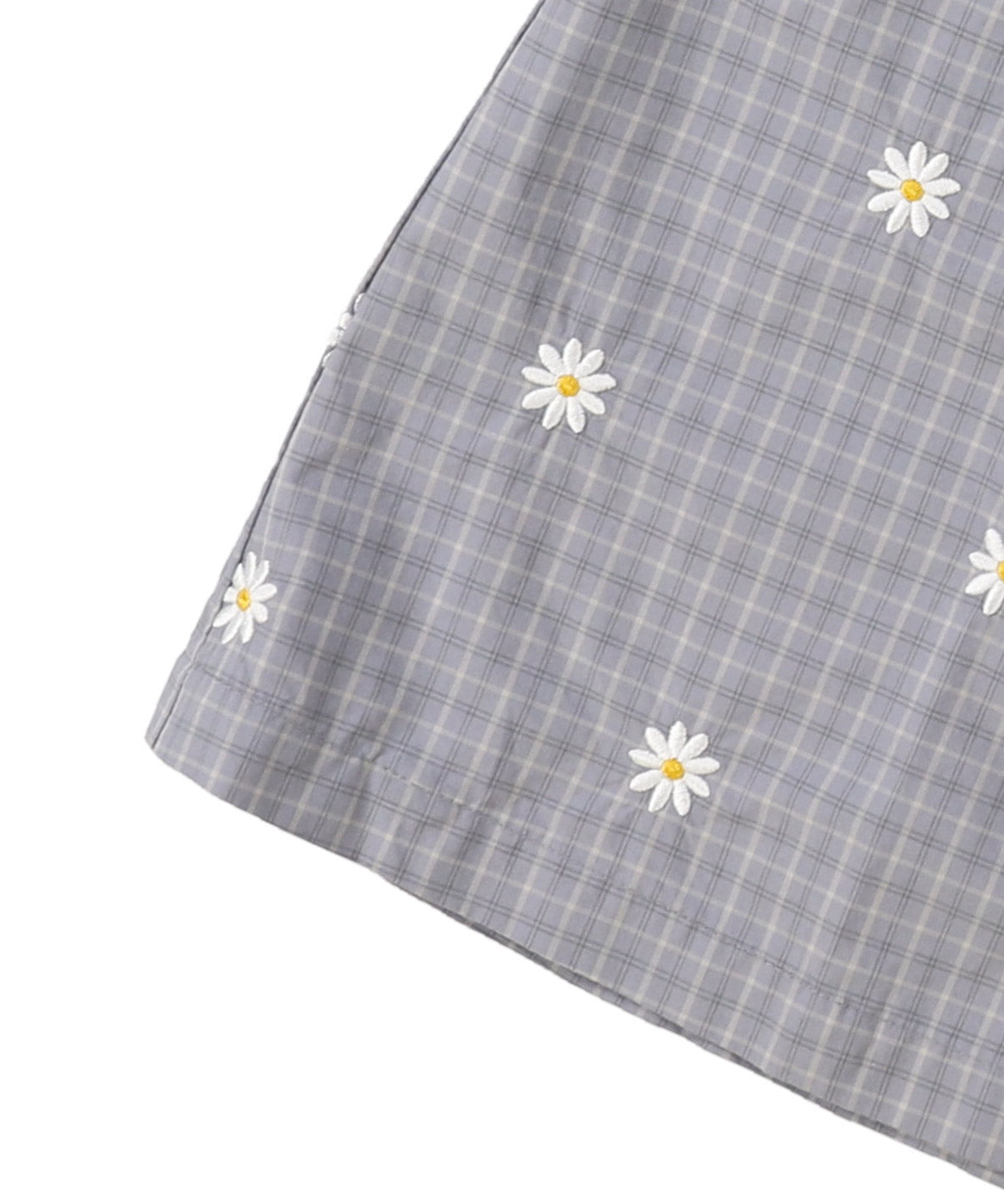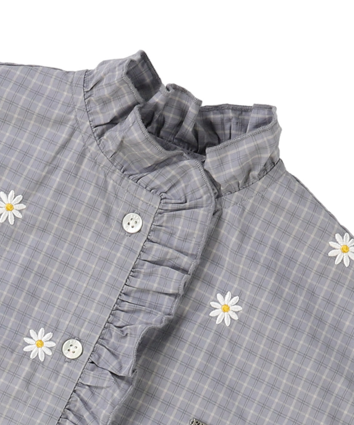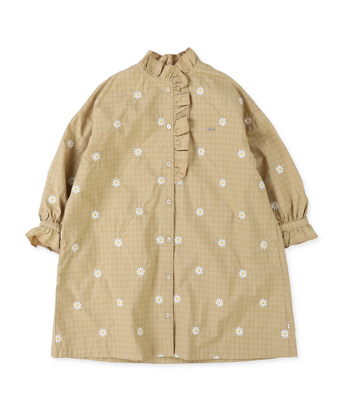 This shirt dress looks sophisticated with ruffles. It is using cotton 40/1 yarns for both warp and woof. This plaid pattern is completed with plain weave using more yarns than the general material. Woven in high density. It features lovely margaret embroideries and looks like completed with natural washing finish.