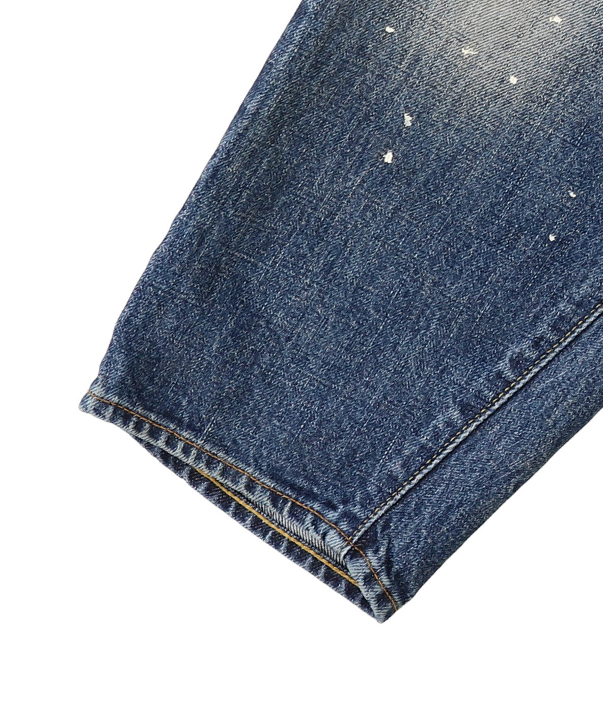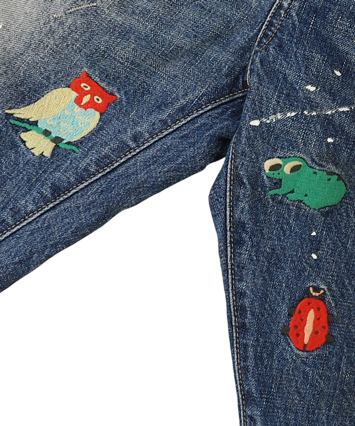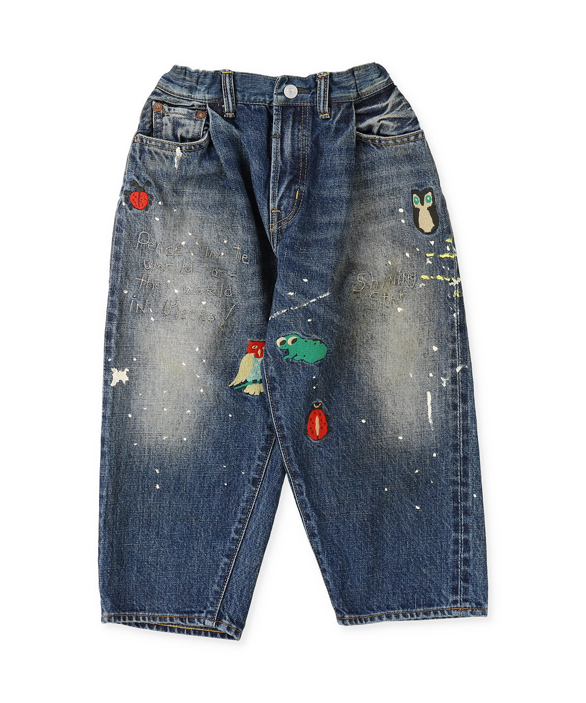 Adult-like and wide silhouette denim pants with side selvedges. Using DENIM DUNGREE original denim. Completed with soft denim for children to wear them. They are easy to wear with the elasticated waist. Designed with remake-like tucks on the waist and natural finish like pants worn repeatedly. You can show side selvedges by folding hem. They feature cute embroideries that they are completed like by the manual sewing machine.