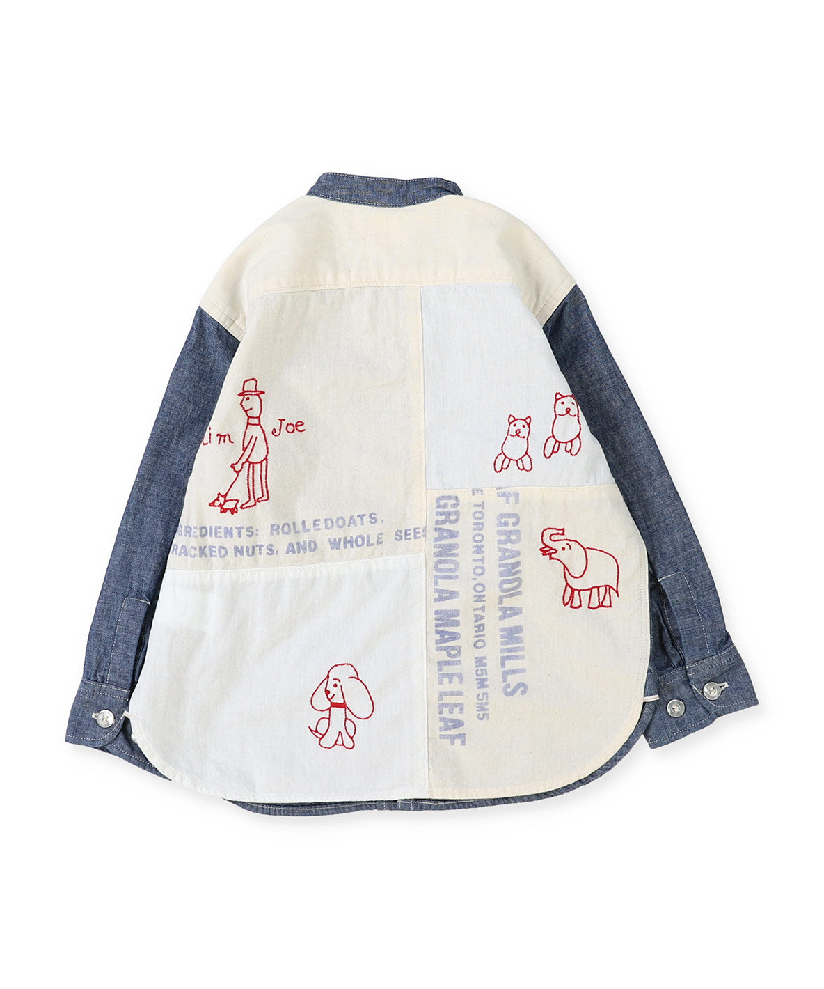 This collarless shirt is designed with playful back style. Designed like remaking the bag of an imaginary Canadian food company and embroidering over. This shirt features goofy but cute embroidering favorite items of the owner: slim neighborhood JOE and his lovely dog. It looks lovely with red of embroideries and tricolor of navy printing.