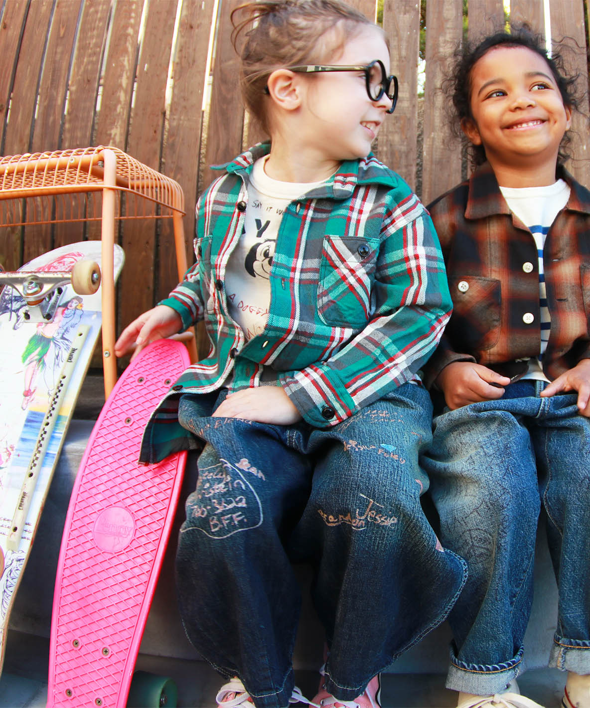 These wide silhouette pants look cute with the front scribbles. They are using cotton from Zimbabwe. You will never get tired of these denim pants with the natural color fading and slight luster.