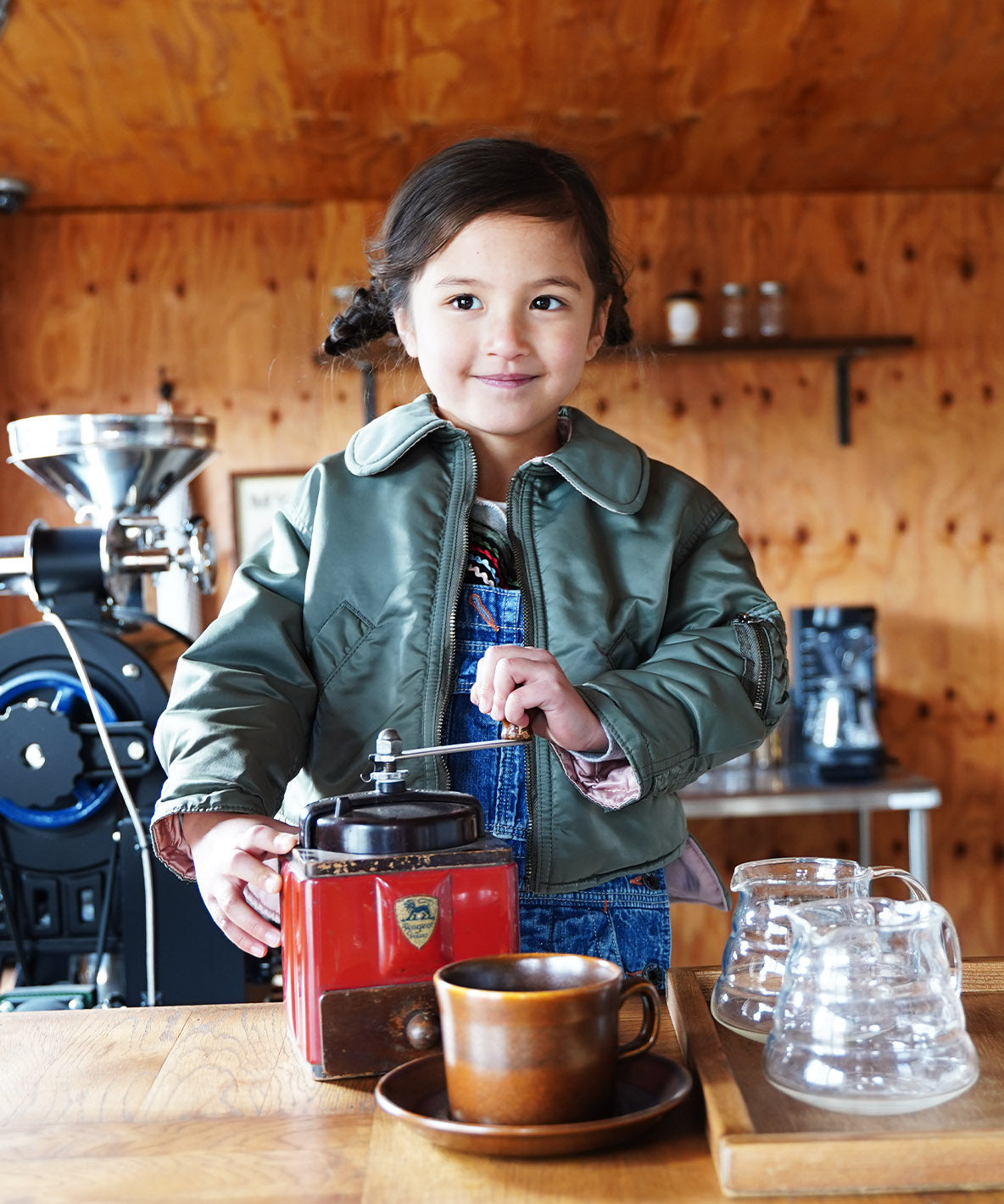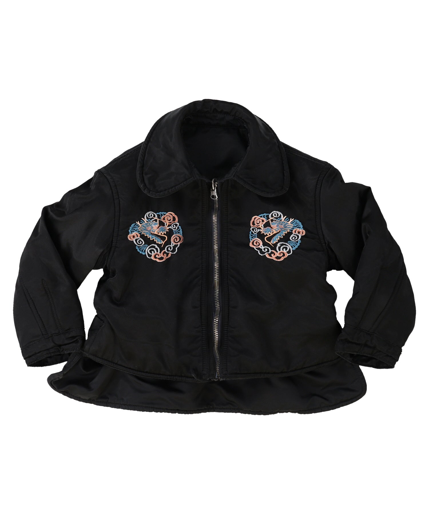 Designed like a remake jacket of AIRFORCE uniform which is the top-and-bottom set outfit for American pilots in the 50s-60s. It is redesigned to wear as the daily outfit. Using the flight cloth woven with nylon filament yarns in very high density for the front side. This souvenir jacket has the dragon's embroideries when turning inside out. Using tough motifs but looks girly with this color and silhouette.