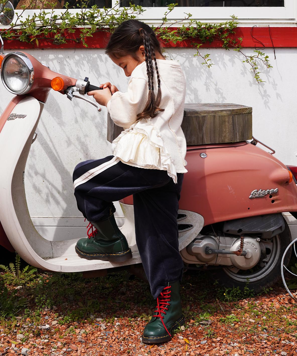 Elegant and polished look. Using cotton velour. Characterized with a luxurious feel. This pile structure has strong durability by using a specialized plating stitch machine. The back side is also complted with beautiful stitch. Made in Japan. You may look sophisticated with the way of using pastels + neutrals colors and frills. The frills can be separated from the pants. Pair it with a matching track pants ref no.32480205.