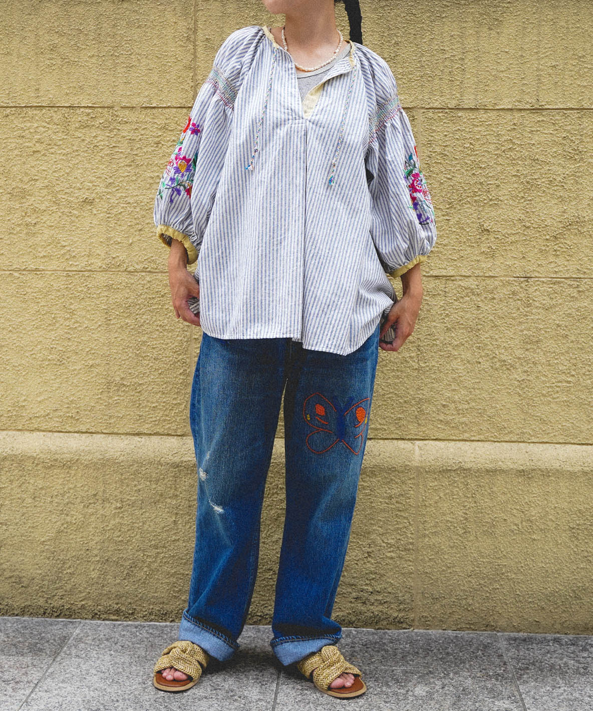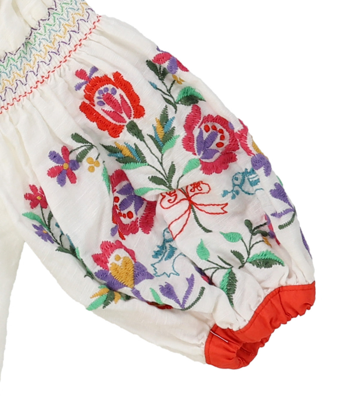Designed like a folklore blouse worn for a summer solstice festival in an imaginary summer resort called "Frostbaden". This embroidery is inspired by Scandinavian Kalocsa embroidery. Colorful embroidery. Voluminous smocking sleeve design. It features soft and airy texture. You can wear it by only itself with well thickness.