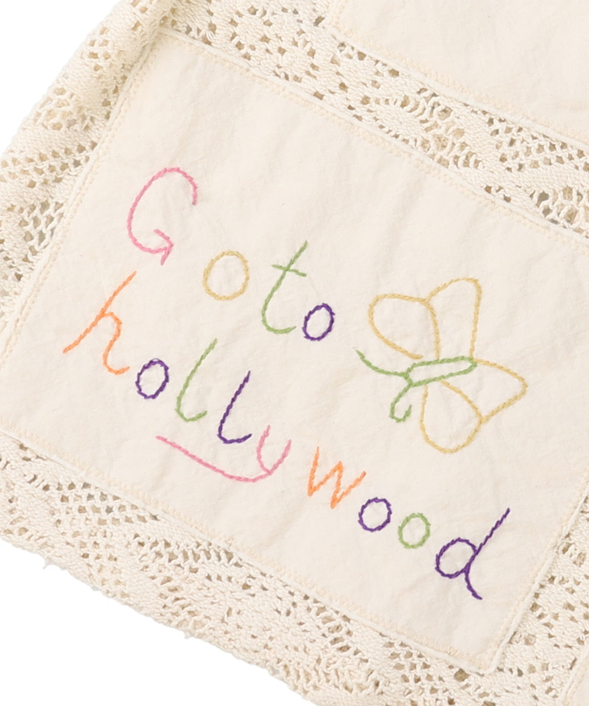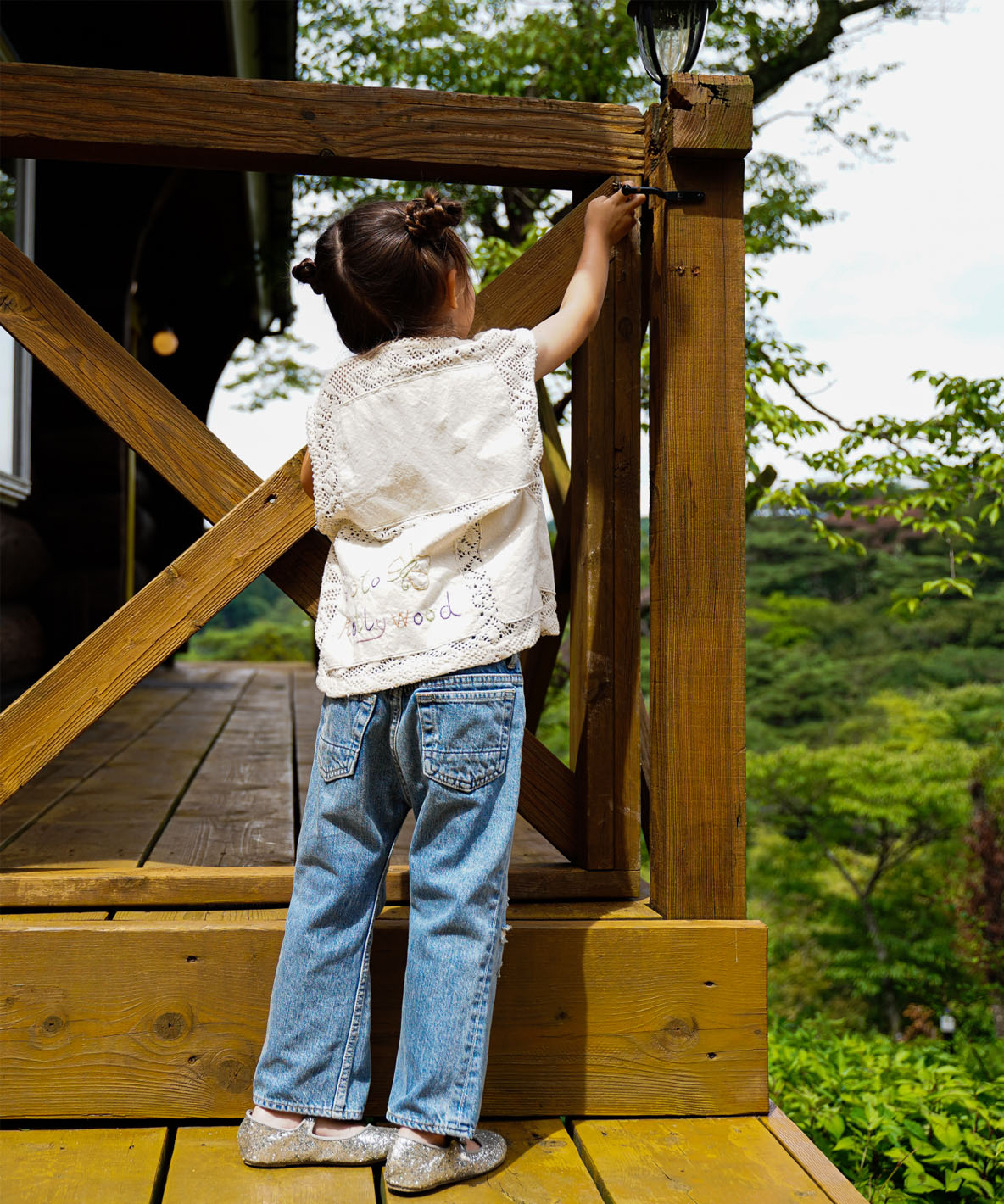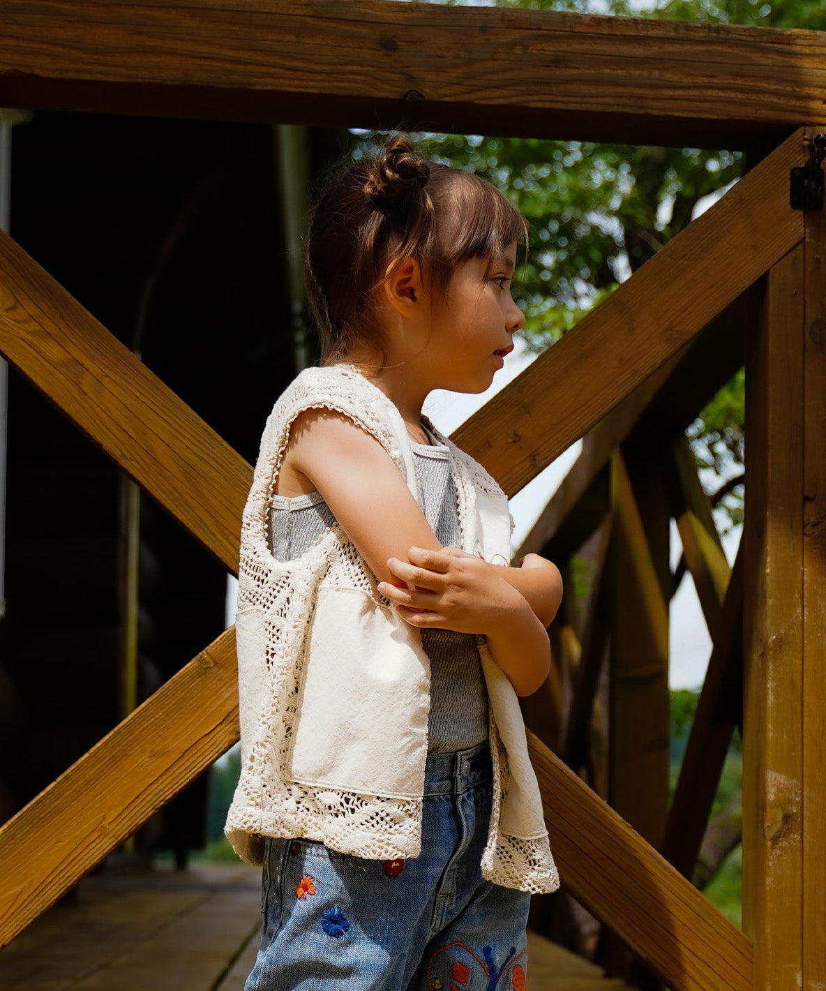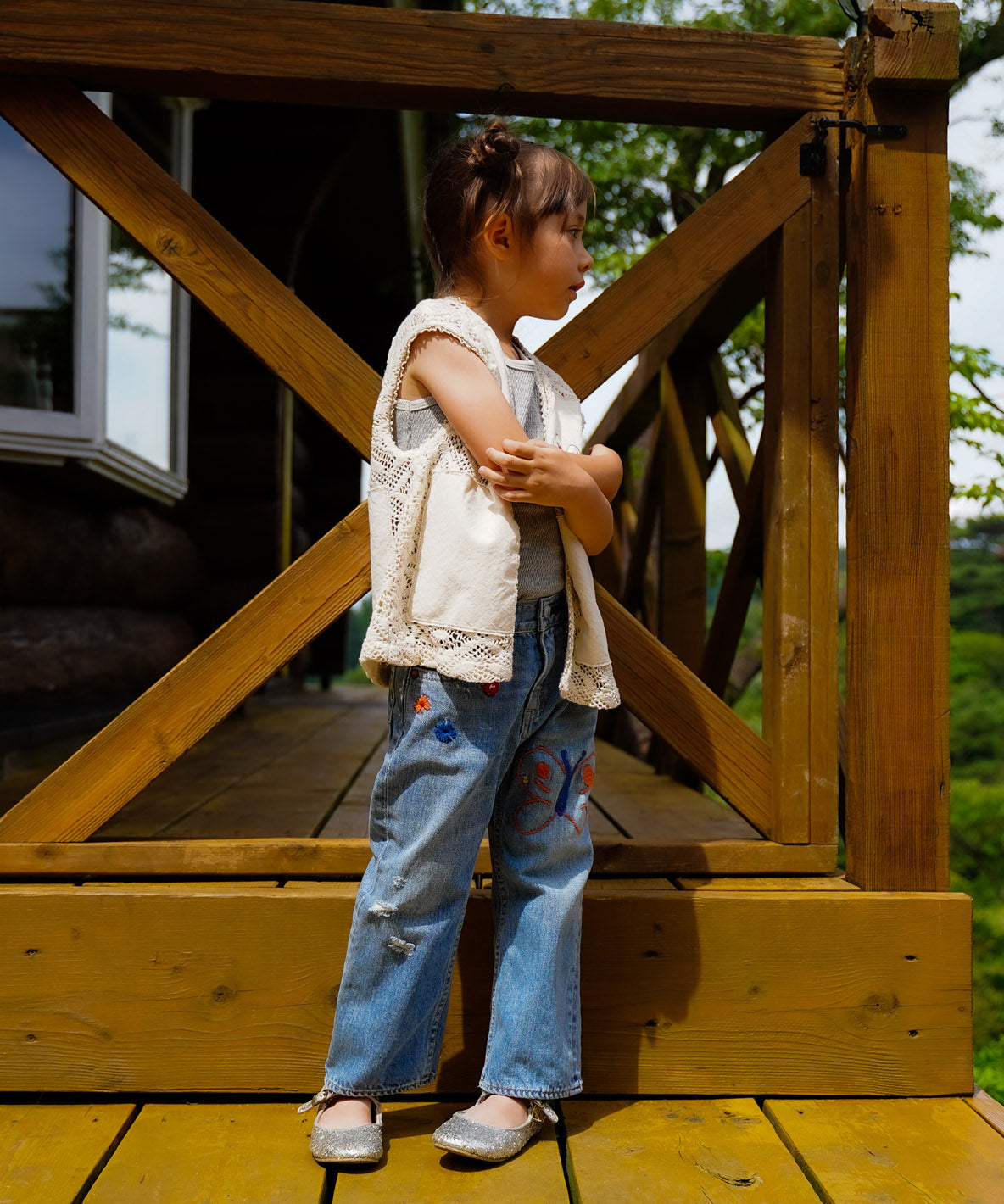 In some regions, they say that there was a custom of embroidering a handkerchief with a needle and thread to embroider the feelings for a loved one and giving them as a gift. Designed like attaching those kinds of handkerchieves to a crochet vest. Looks super cute when pairing it with denim pants.