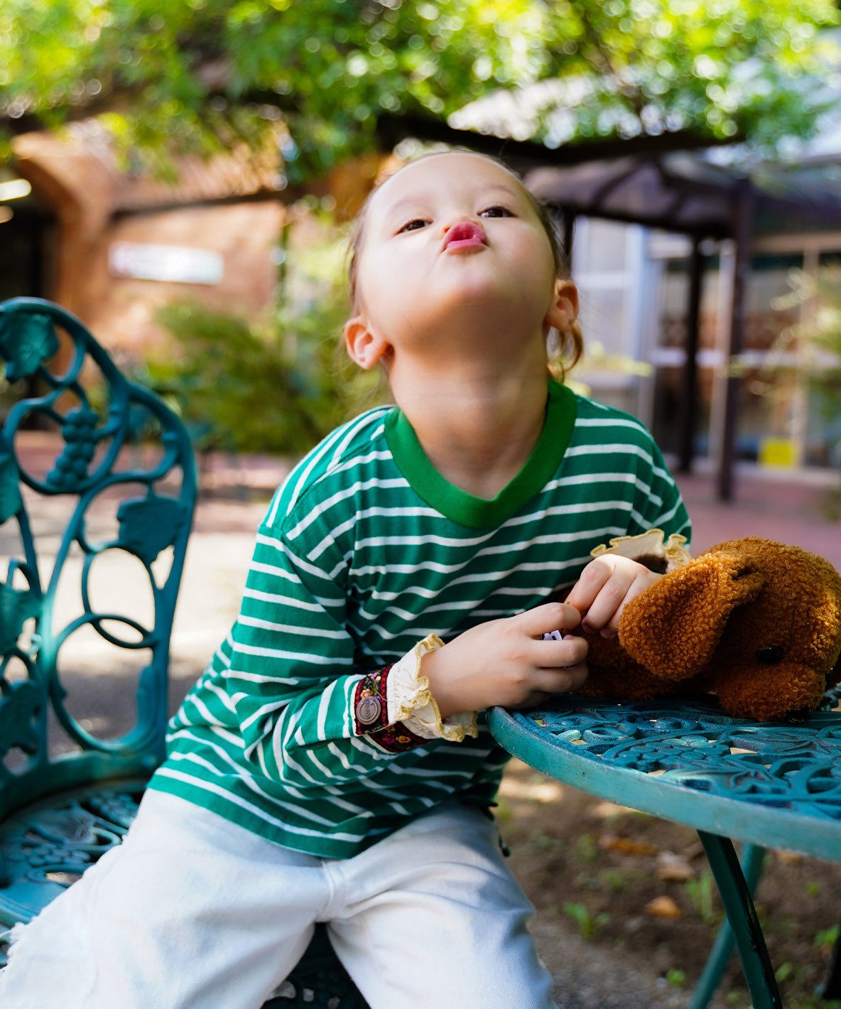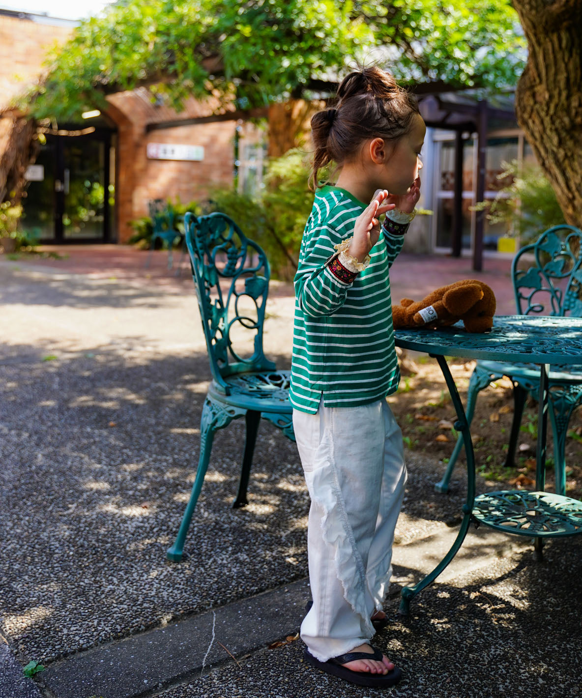 G2H's basic striped L/S T-shirt. It is using smooth texture and well thick fabric. Designed like layering blouses worn in a summer solstice festival in an imaginary summer resort called "Frostbaden". Features docking design with tyrolean tape and frills on cuffs. Simple striped T-shirt but looks romantic with decorated design on cuffs and has a great presence.