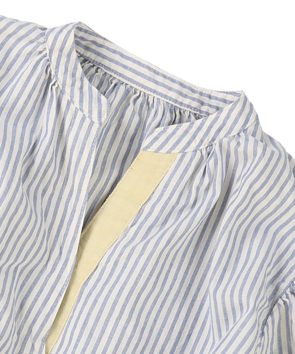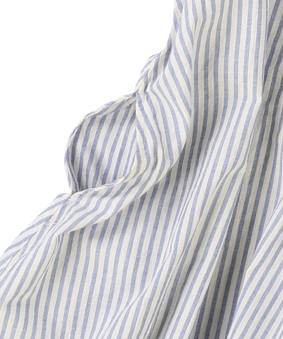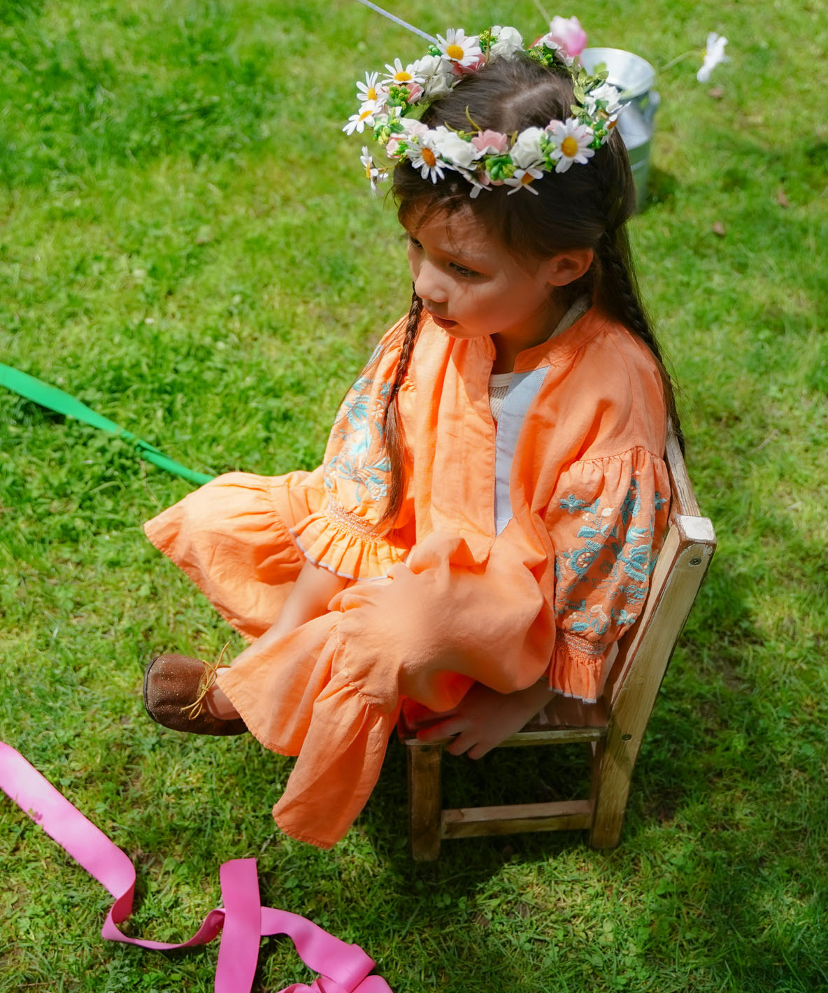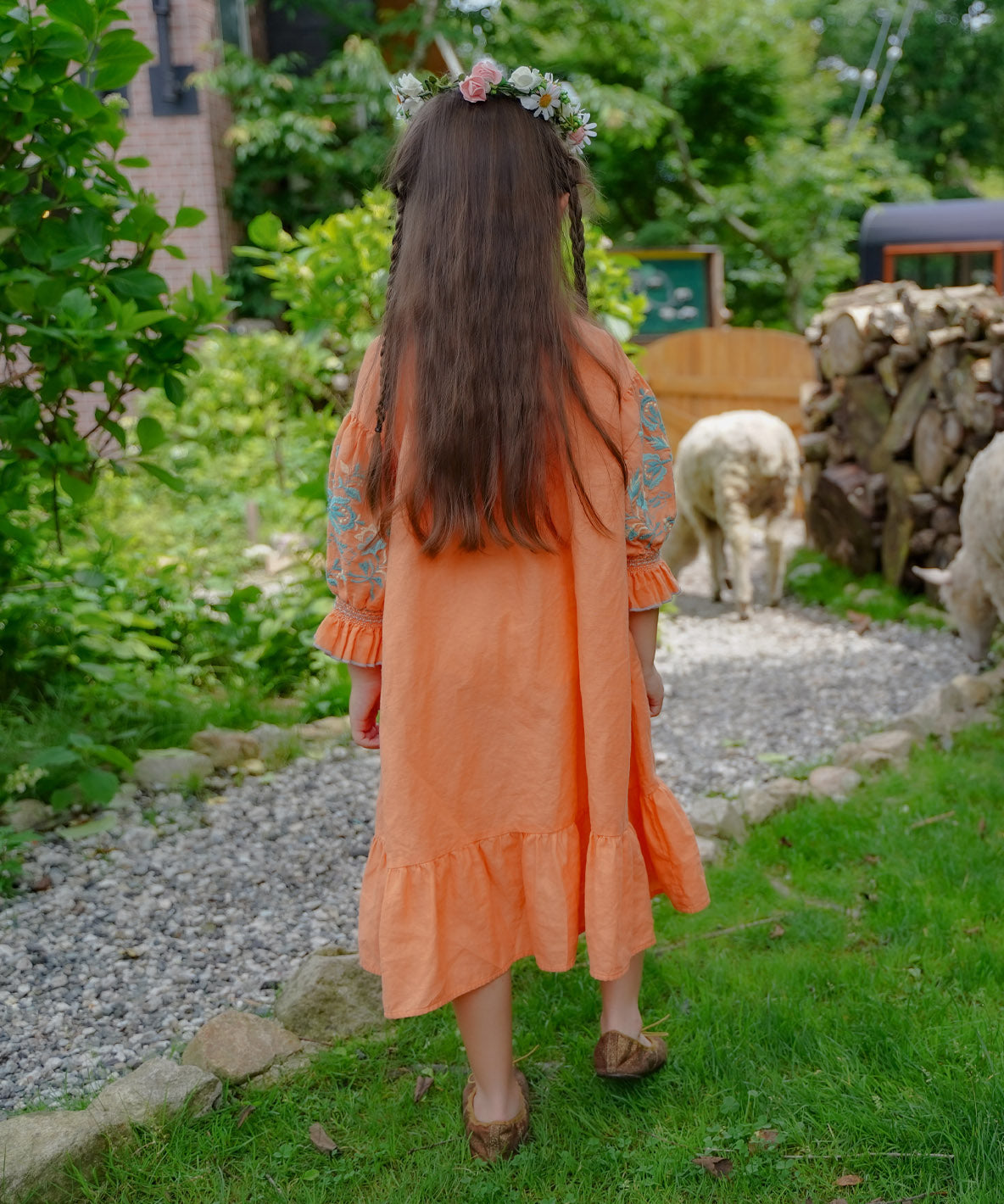 Designed like a folklore dress worn for a summer solstice festival in an imaginary summer resort called "Frostbaden". This embroidery is inspired by Scandinavian Kalocsa embroidery. It features colorful embroidery and voluminous smocking sleeve design. Luxurious volume with flare hem. It is characterized with soft and airy texture. You can wear it by only itself with well thickness.