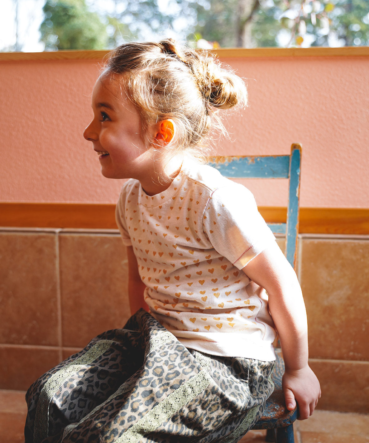 This T-shirt is designed in impactful with sparkle glitter hearts. Each product has different glitter design completed by the product dyeing. This tasteful design is cute and heart-melting.