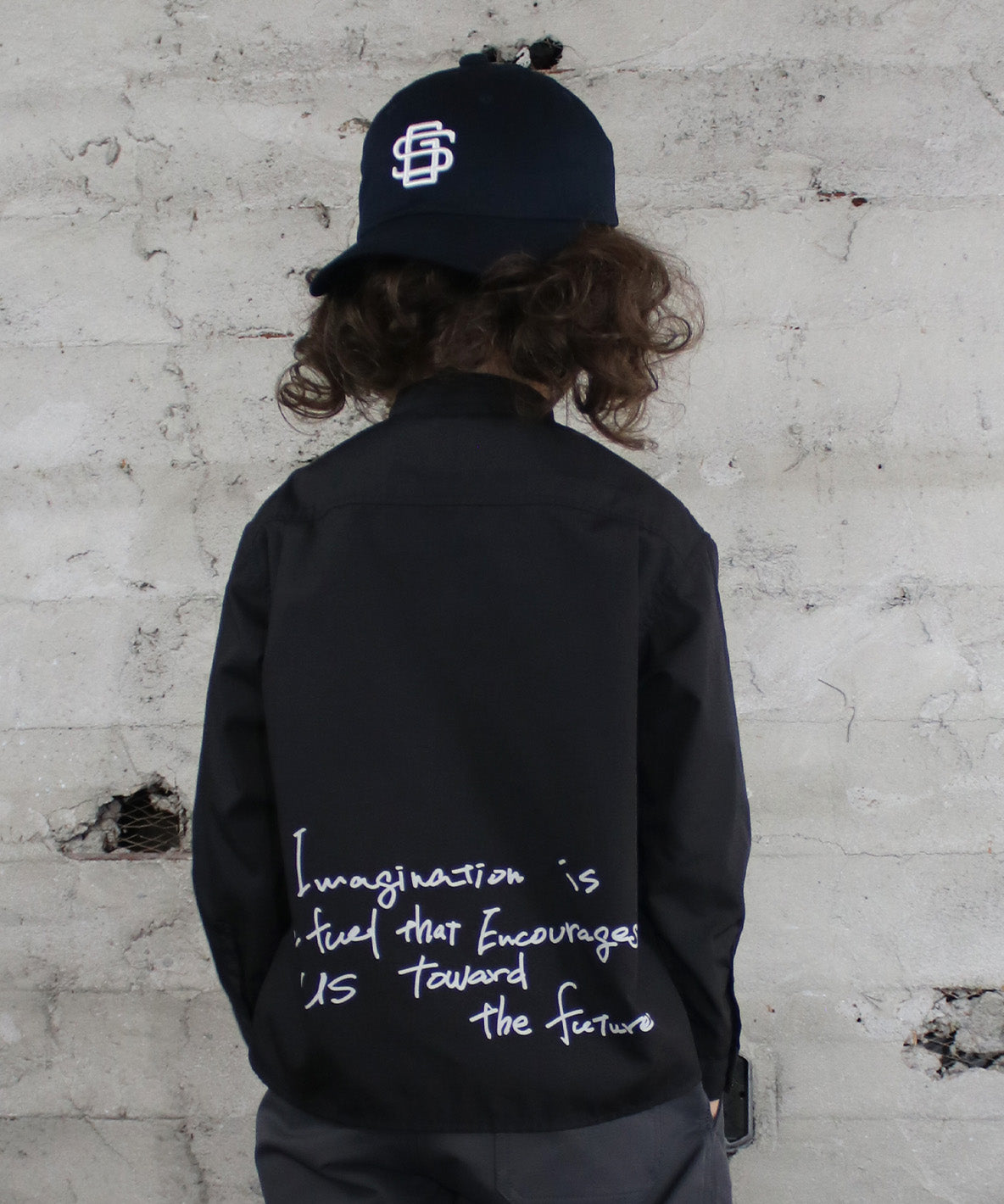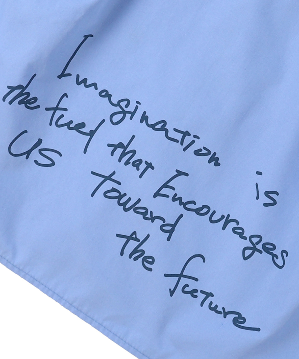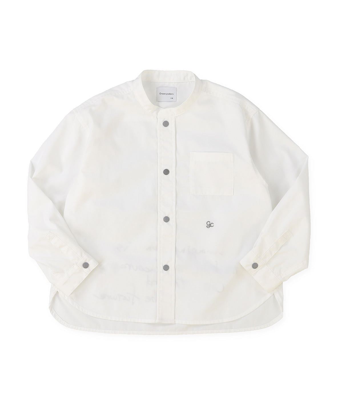 Band-collar shirt. Using thin but firm TC (65/ 35) broadcloth. This fabric is characterized with smooth texture and may get less wrinkles. Embroidering gc on the front. Graffiti printing is designed on the back with a message for children to grow up their power of imagination. This shirt is easy to wear with dot buttons. Recommended for the formal style with ref no. 42520201 and 42520601. It features sophisticated and casual look when pairing it with shorts or denim