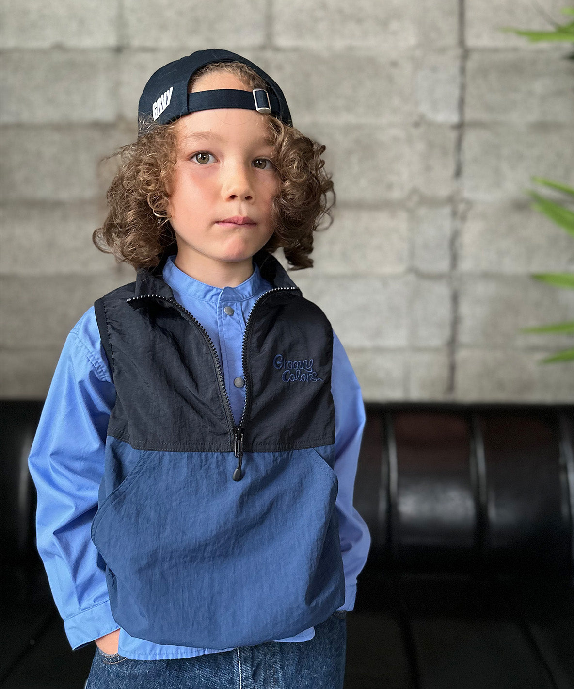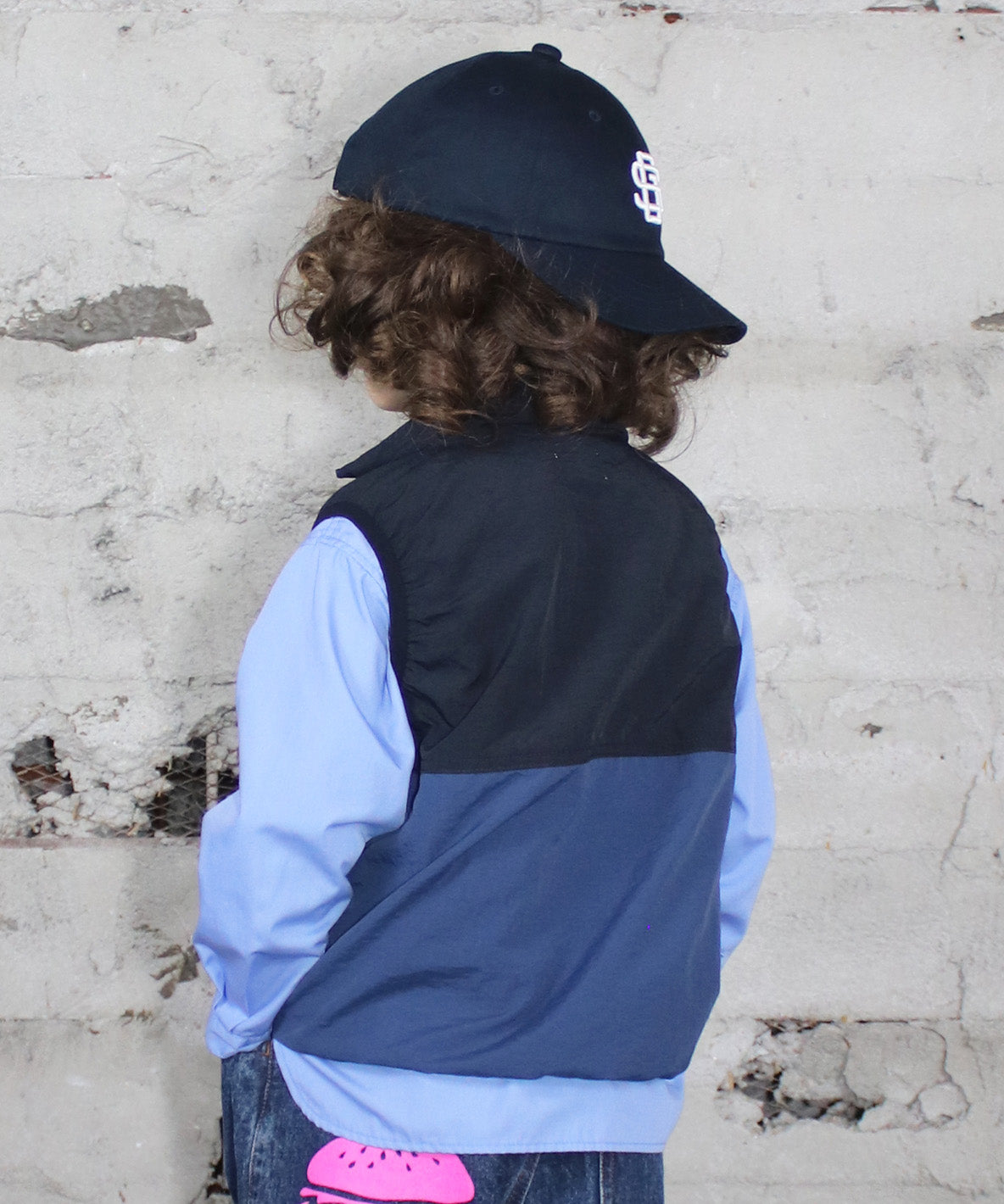 Pullover design vest in two tone colors. Using nylon taslan taffeta fabric which is light but firm. This vest features mat coloring and cotton-like texture. Brand logo embroidery is completed on the left chest. It goes well with T-shirts. It gives a dash of spice to your simple outfit in spring and summer.