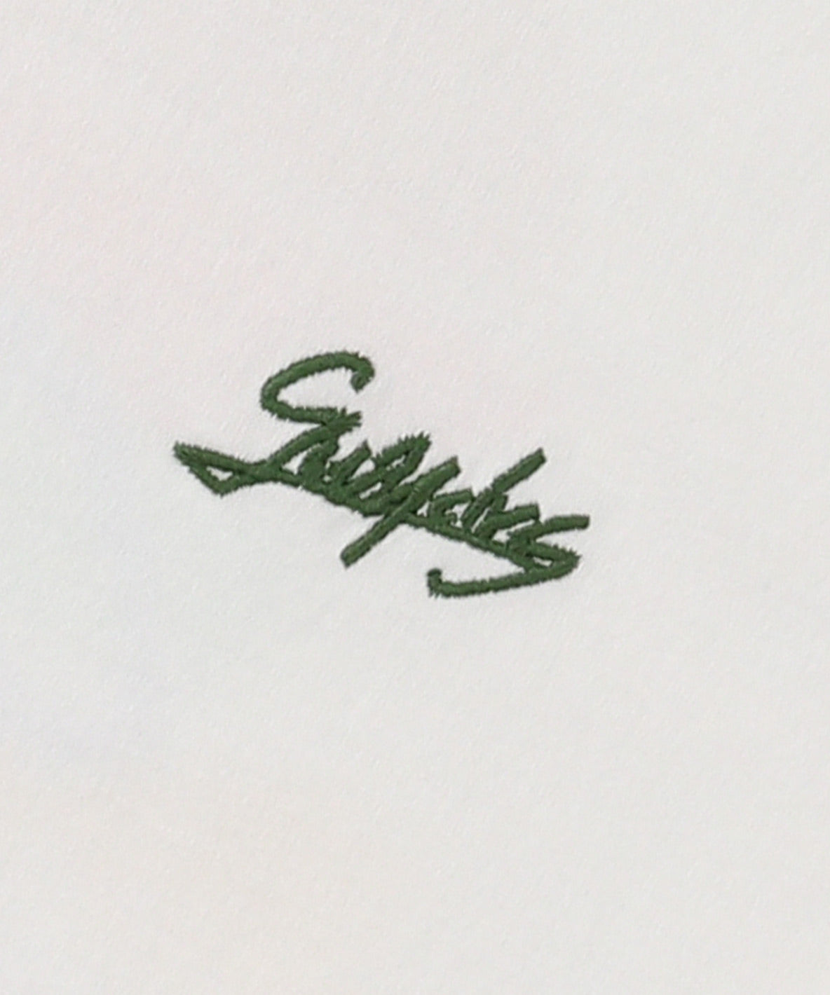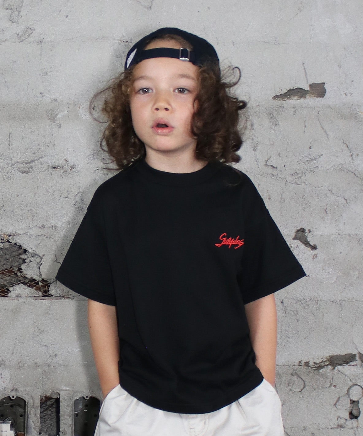 GROOVY's basic semi-loose silhouette T-shirt. It is using 40/2 cotton jersey fabric. This graffiti is in the motif of our deformed brand logo and embroidered on the left chest. Designed with the impactful hamburger graphic inspired by street art on the back.