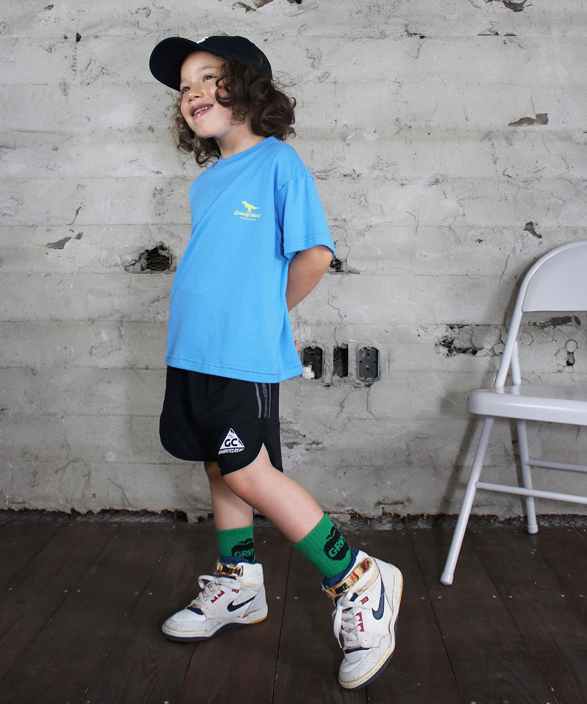 GROOVY's basic semi-loose silhouette T-shirt. It is using 40/2 cotton jersey fabric. Designed with street-like graphic which is matching boys' favorite dinosaurs and graffiti logo on the back. Printing "DINOSAUR" and brand logo smally on the left chest. Not only cute but also cool dinosaur TEE.