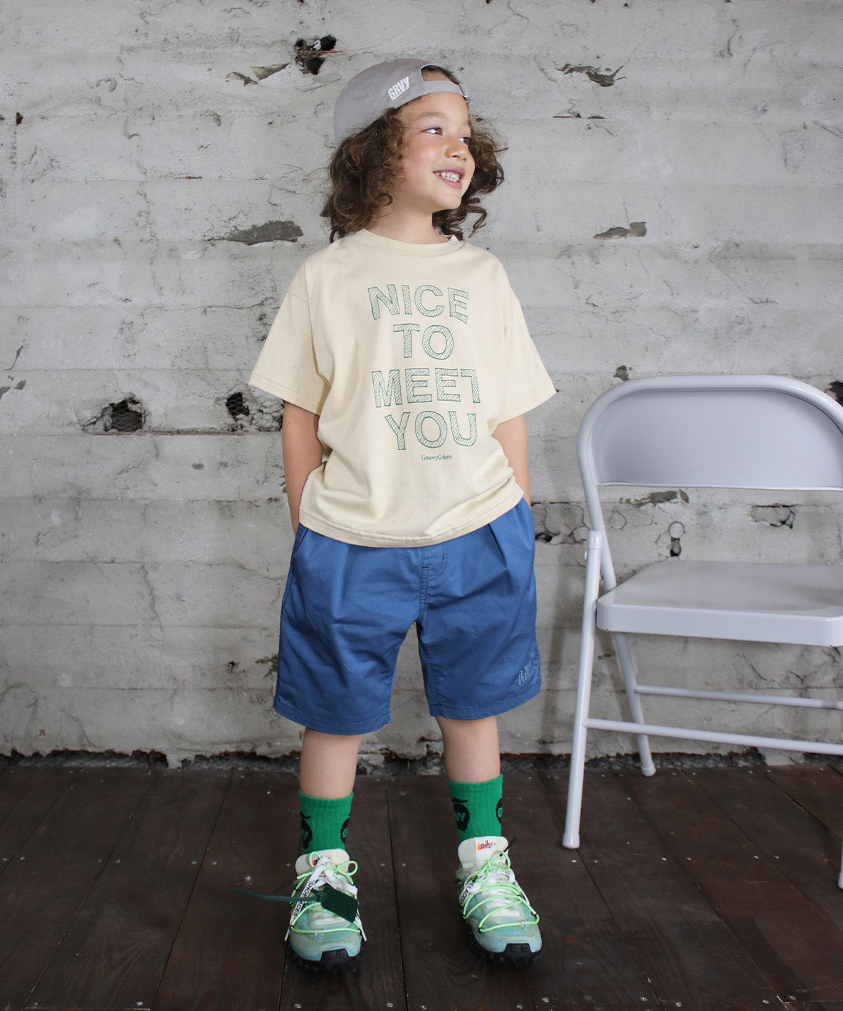 GROOVY's basic semi-loose silhouette T-shirt. It is using 40/2 cotton jersey fabric. Designed with handwritten graphic logo "NICE TO MEET YOU" on the front. A skating dog and small "bye" near the back collar. This T-shirt is detailed with greetings of encounter and farewell on the front and back.