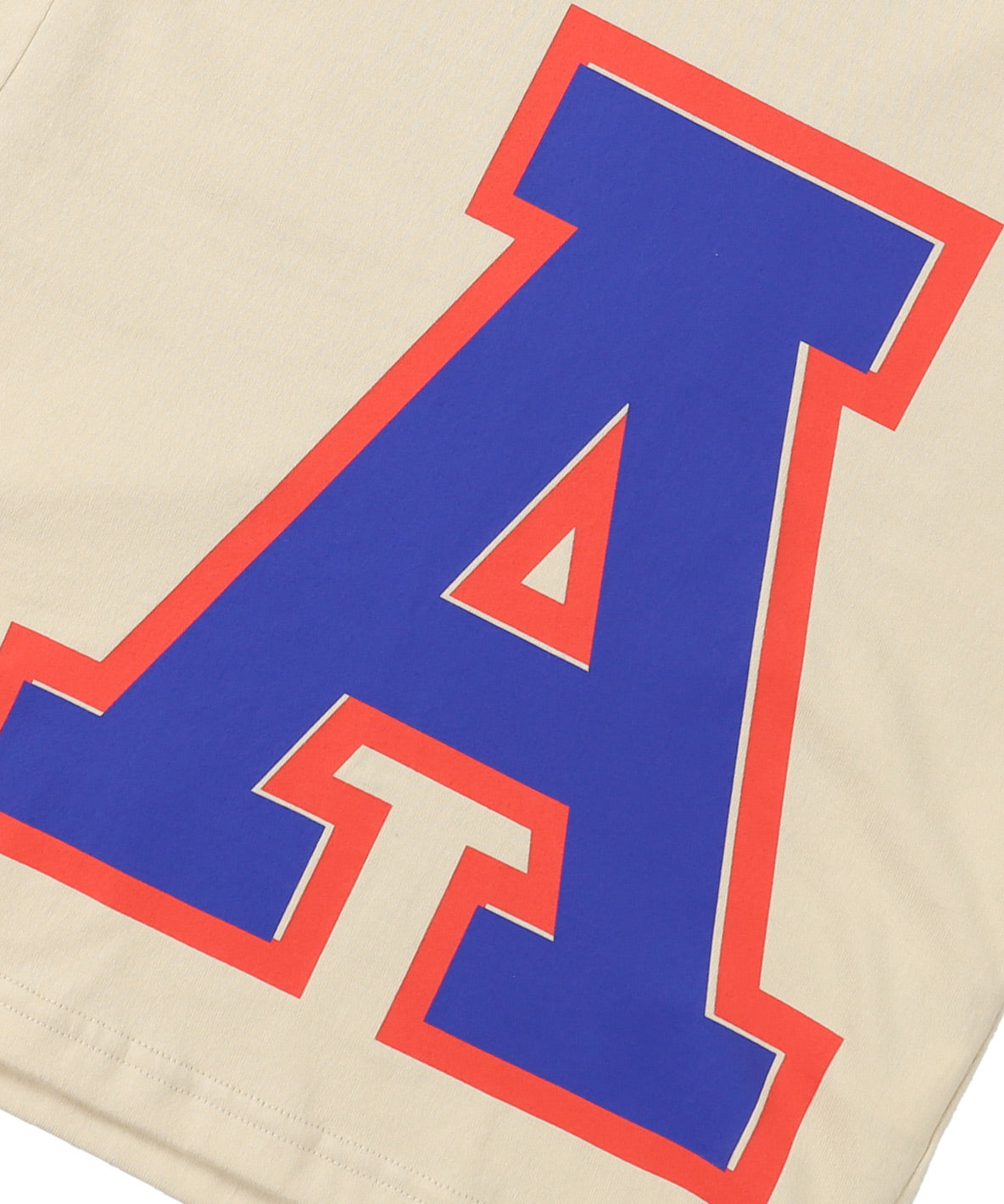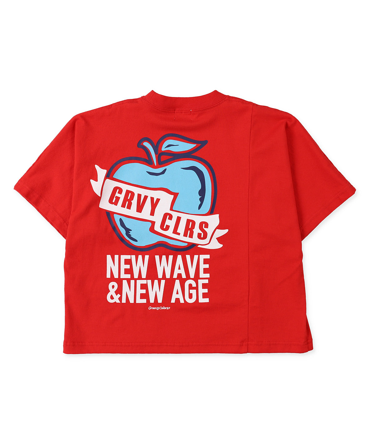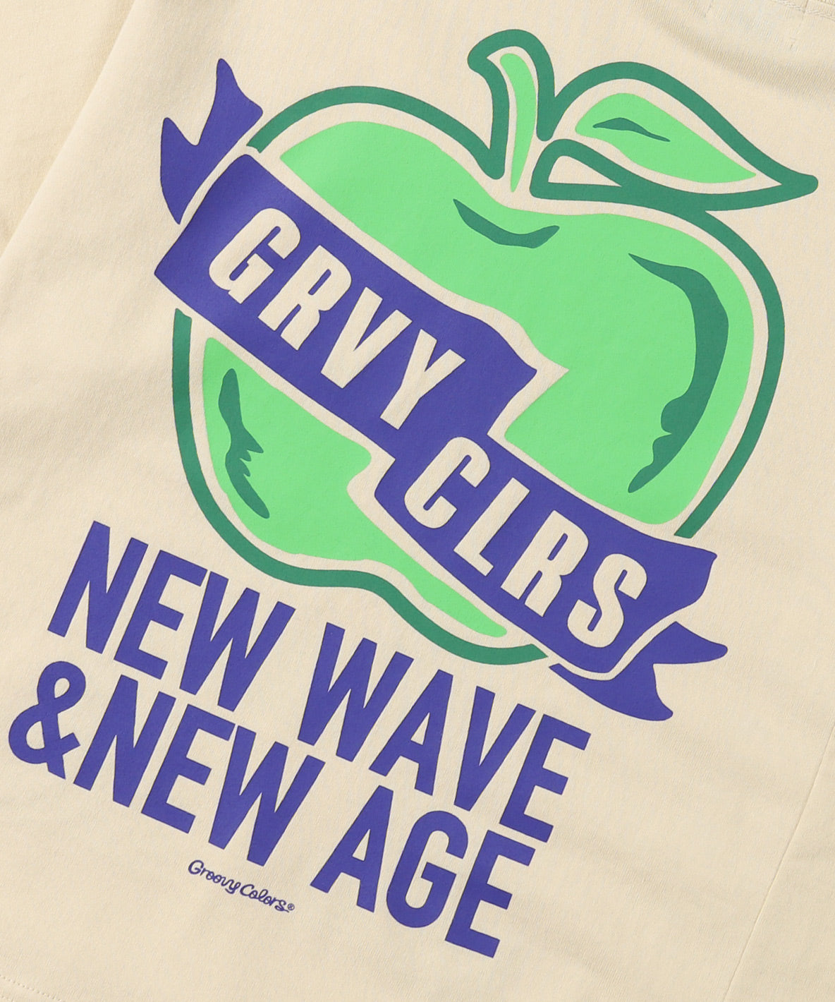 Wide silhouette TEE using 40/2 cotton jersey fabric. Completed with unique silhouette connecting sleeves to body part. Alphabet TEE collection has started from "E" in SS22. "A" for apple as GROOVY's motif. Designed with colorful and impactful apple graphic on the back.