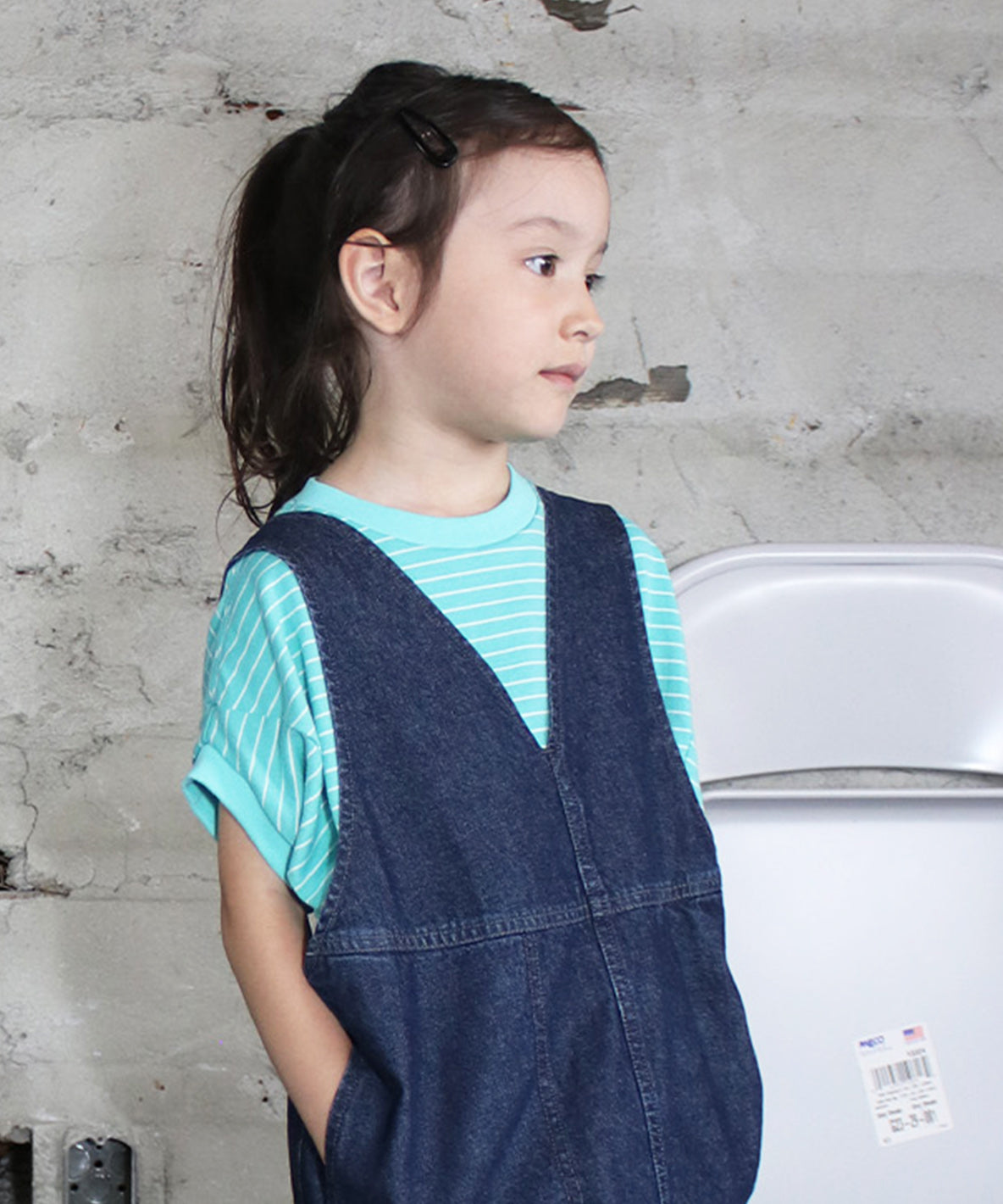 Unique silhouette T-shirt looks like a tent. It is using 40/2 cotton jersey and original striped fabric. Designed with eye-catching embroidery on the chest.