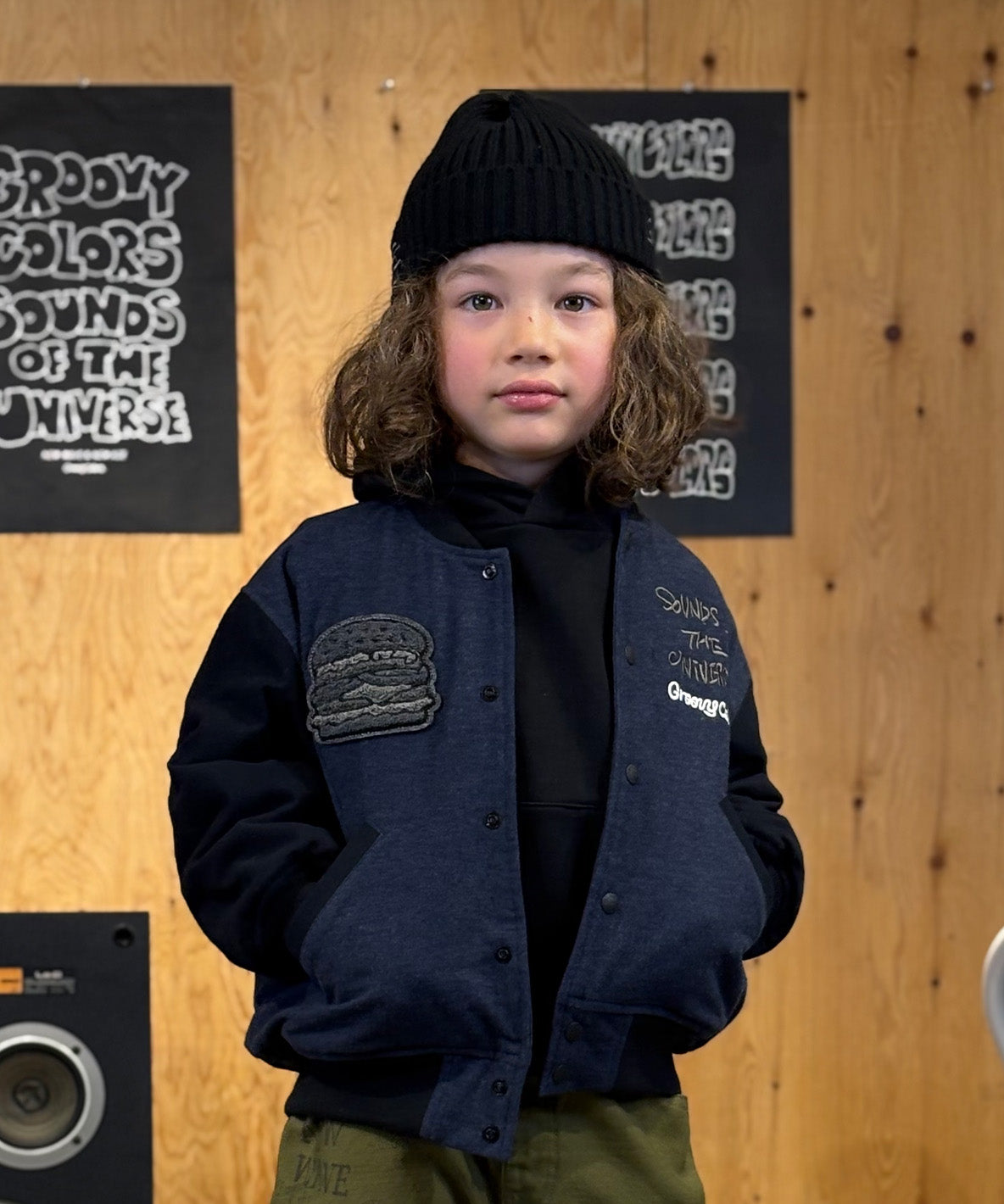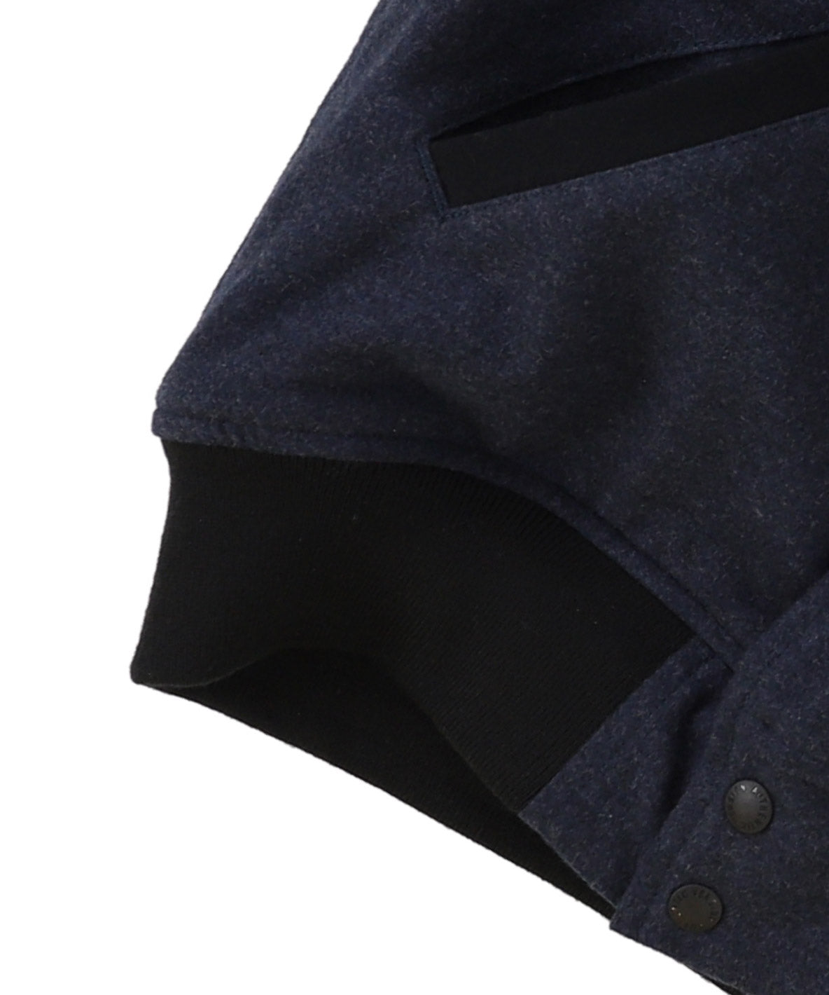 Must-try outerwear from this collection. This varsity jacket is completed with chic coloring using dark two-tone colors. The outside is completed with brushed chamois cloth using top yarns featuring sophisticated melange-like texture. This jacket is not too thick by using semi-voluminous padded material. A Sagara patch on the right chest is designed with mono-tone coloring hamburger. Our brand logo is embroidered on the left chest. The back style features the impactful graphic embroidery mixing Sagara patch and logo.