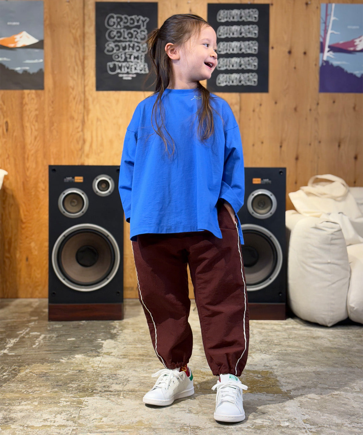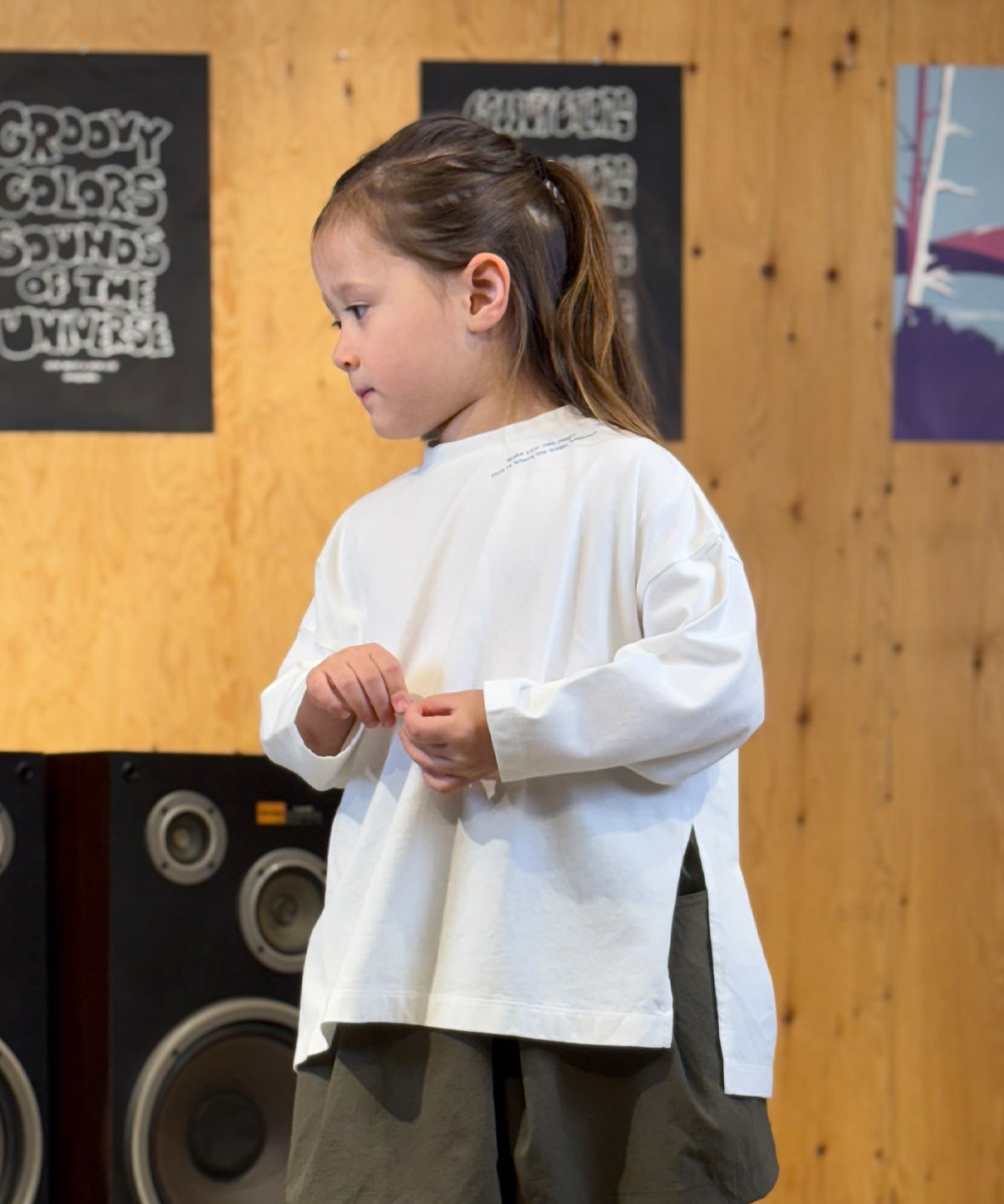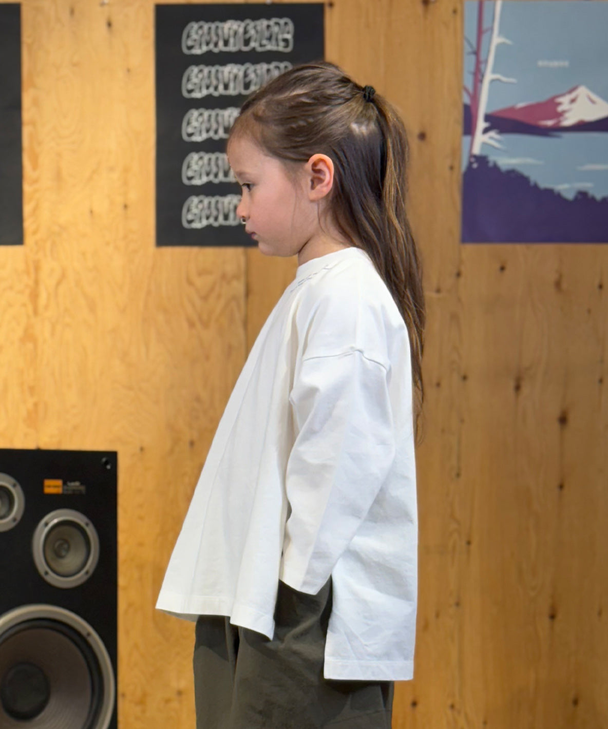 This trendy silhouette L/S T-shirt features wide width and sleeves with side long slits. It is characterized with accented design of the simple logo printing.