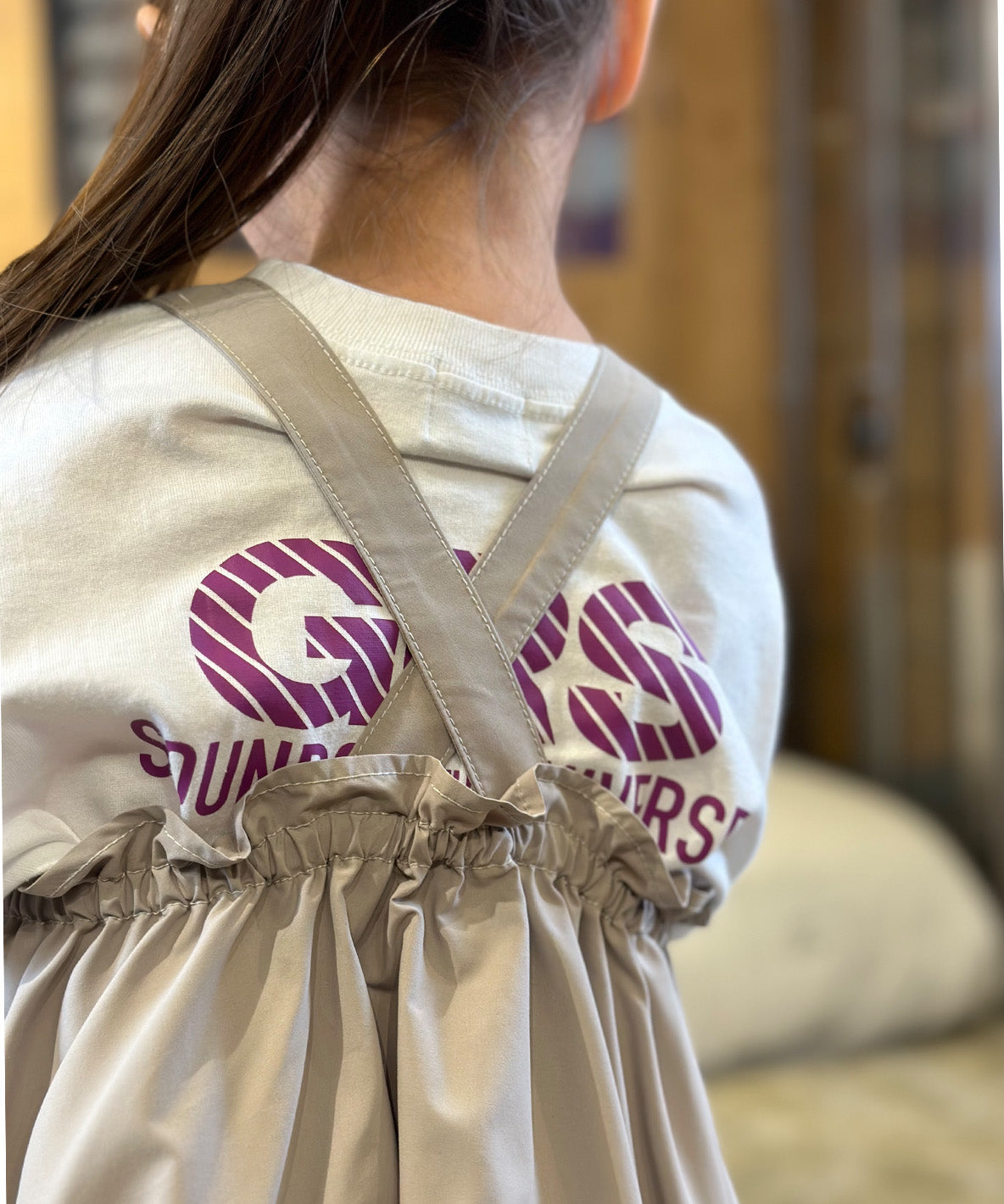 This salopette skit is designed in long length below the knee. It is detailed with frills on the waist. Active dress for your daily outfit. This dress is using the functional material combining the functional material "MINOTECH®" and recycled polyester. This eco-friendly recycled polyester is produced from used plastic bottles, fibers and textile waste. "MINOTECH®" features sliding off droplets function. It also features breathable and stretchy function.
