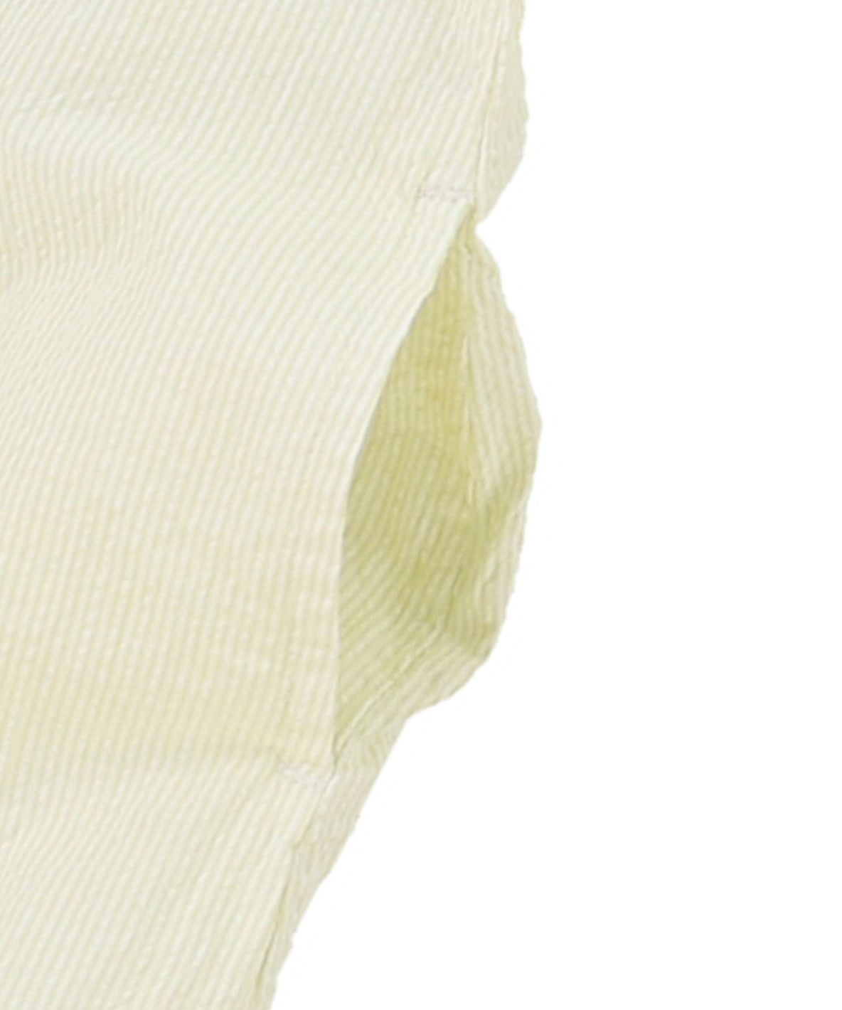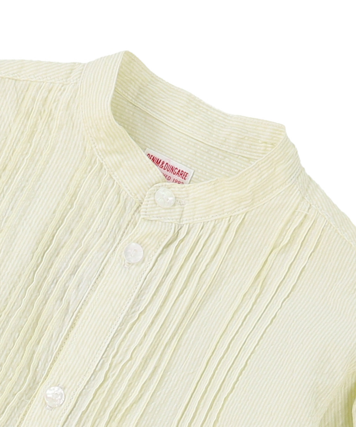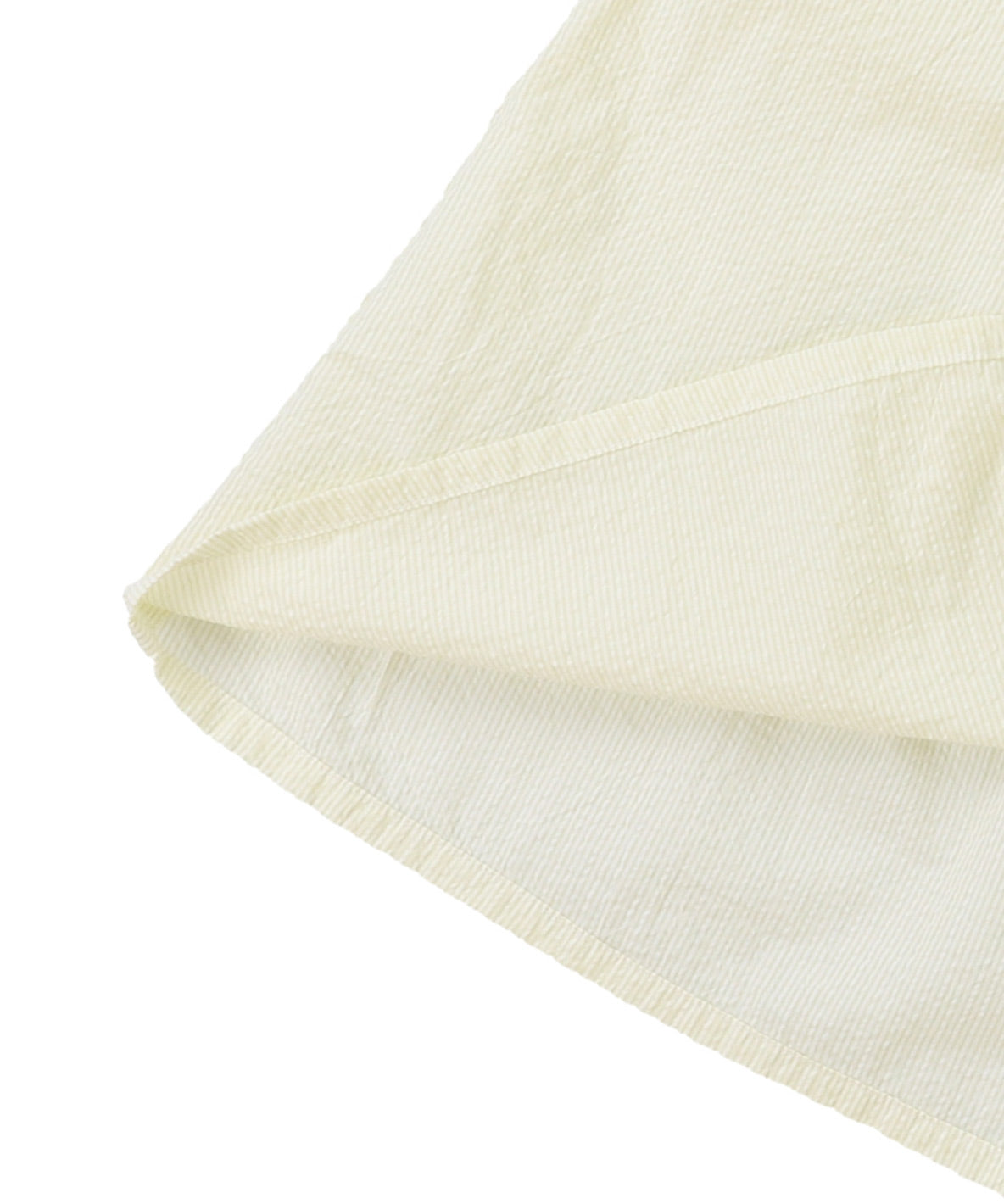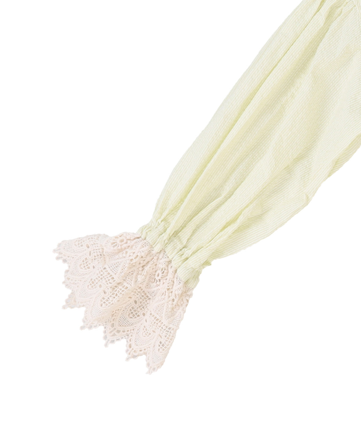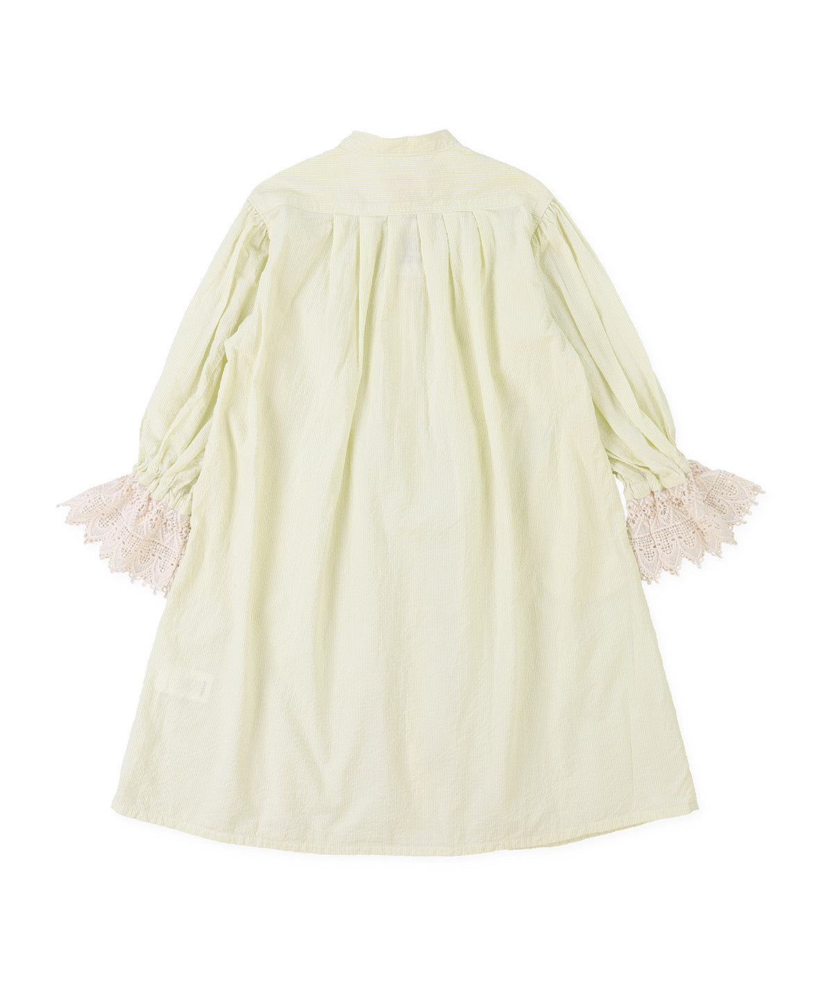 This striped dress is inspired by men's striped shirts as national costumes in Hungary. It is very light by using fabric woven with thin yarn. It is detailed with cute balancing of voluminous sleeves and lace. It is completed with different colored striped pattern in each color.