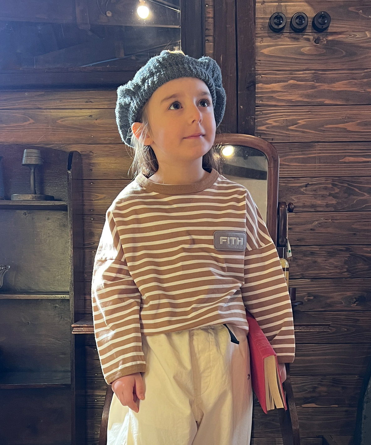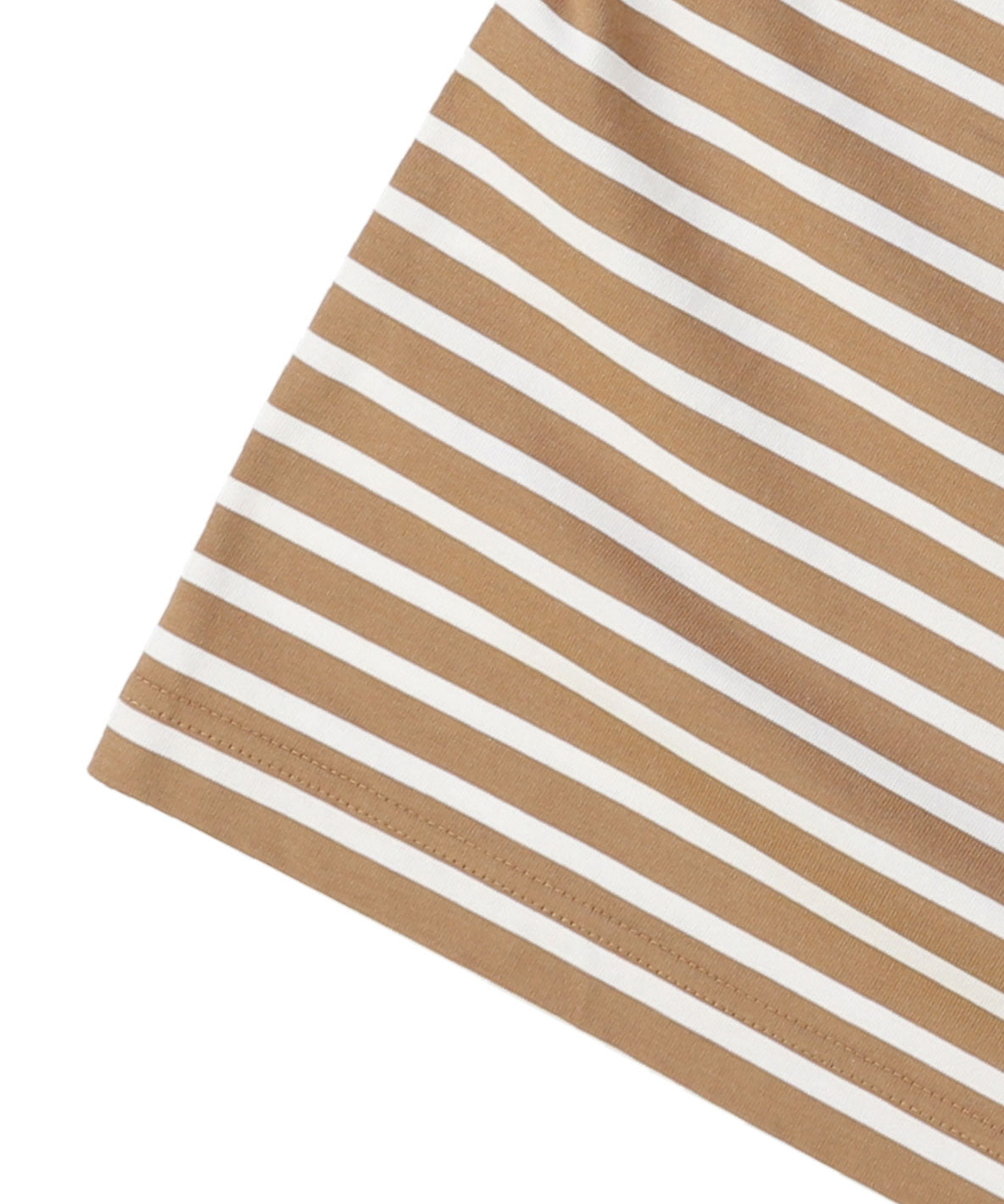 This striped L/S T-shirt is designed with big silhouette. It is woven with two-ply yarns paralleling slight strongly twisted no.32 yarns. This material features its toughness plus beautiful and smooth texture by weaving in super high gauge. Characterized with well-balanced lust. This T-shirt may keep its silhouette after repeated laundy by using the premium cotton jersey fabric. FITH logo patch is the key of this design.