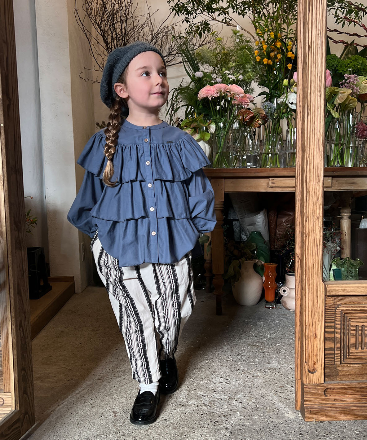 These semi high rise pants are detailed with double tucks and slightly tapered design. These pants are completed with dobby striped pattern woven by dobby weave machine. This pattern is using two kinds of yarns: no.10 and no.21 for warp. Dobby weave machine is known for unique weaving machine which can be particular about the number of yarns or thickness. This material features smooth and comfortable texture. It is perfect material for children with softness and lightness. Easy to wear. FITH original and iconic buckle has luxury FITH logo on.