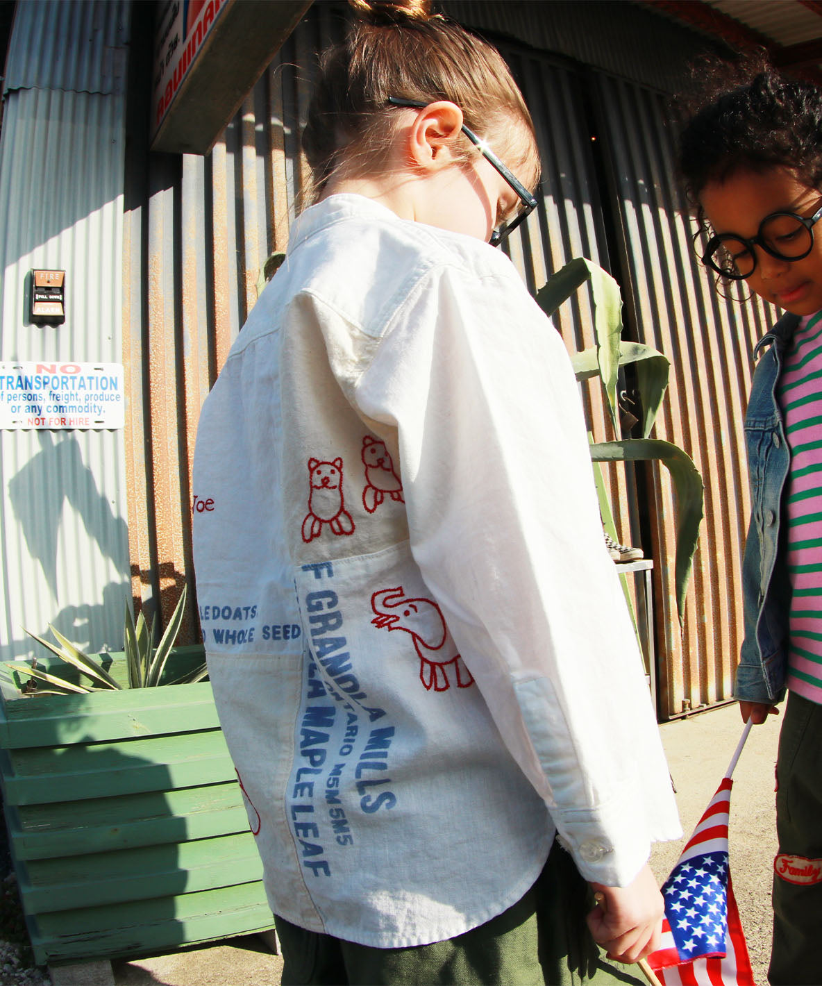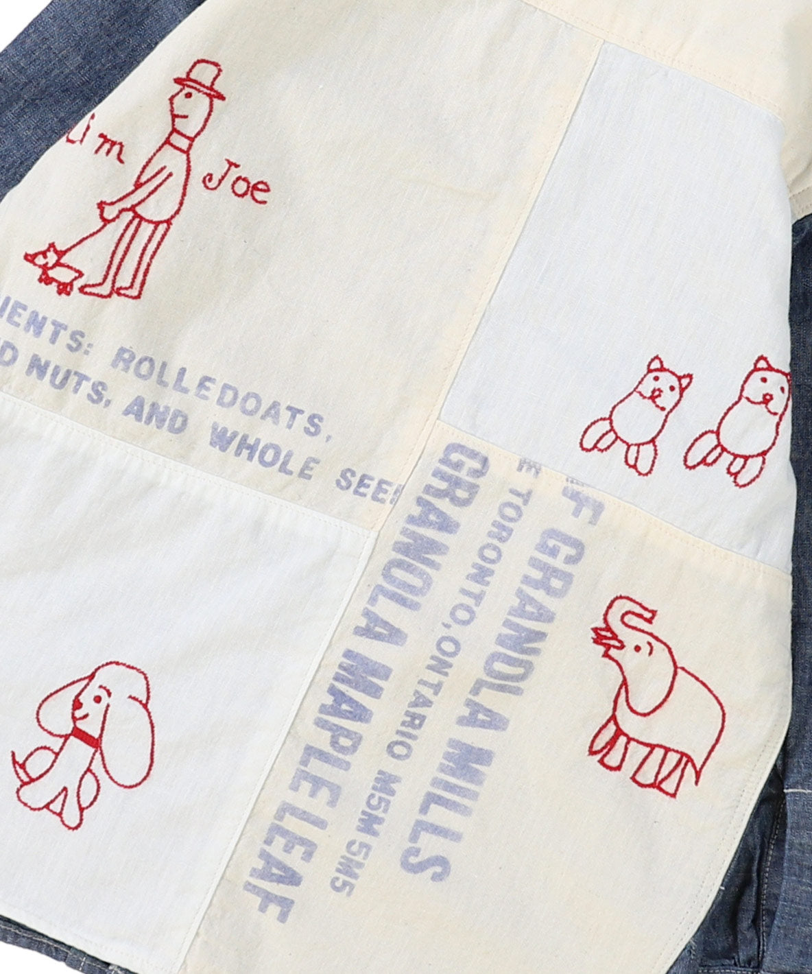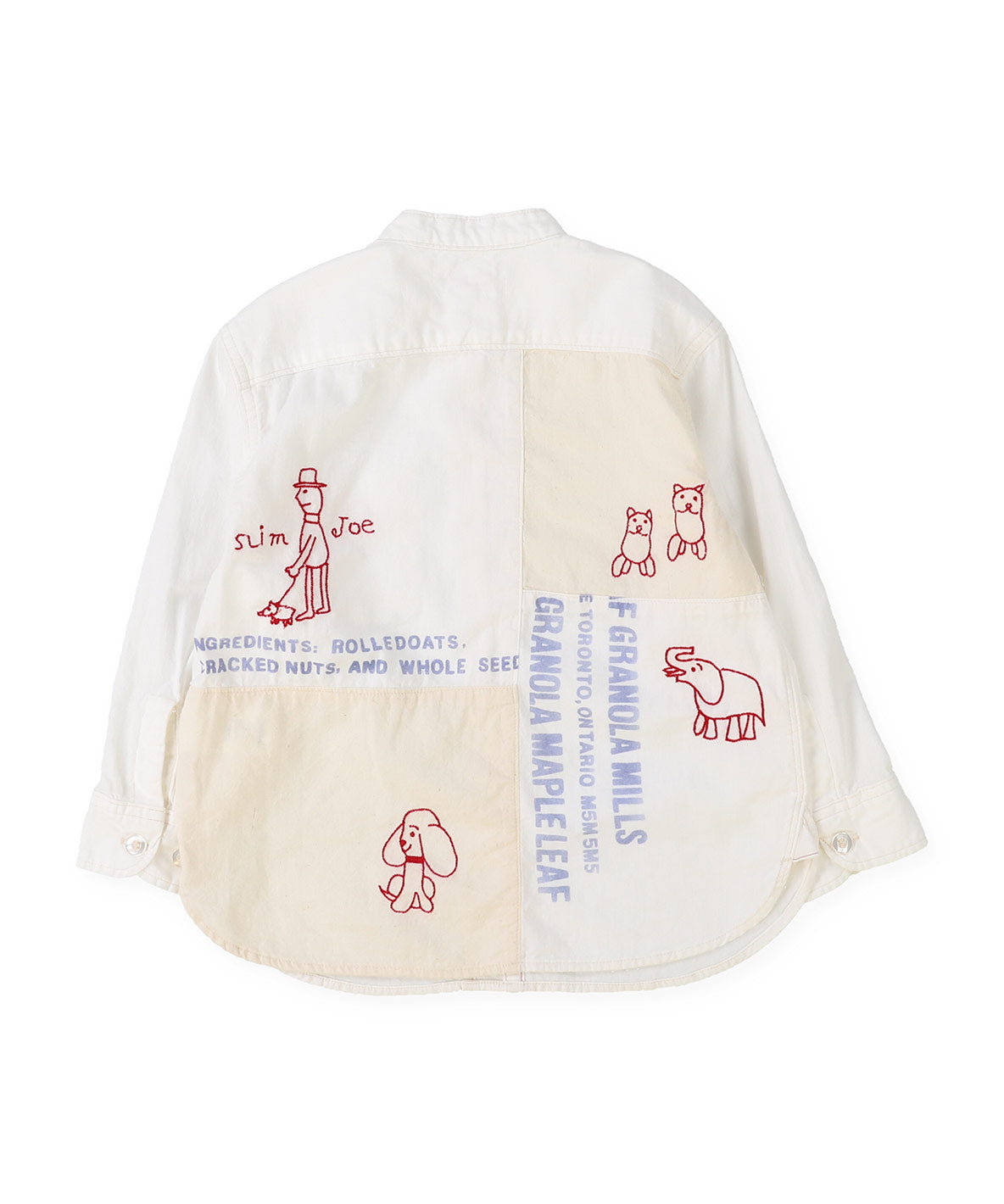 This collarless shirt is designed with playful back style. Designed like remaking the bag of an imaginary Canadian food company and embroidering over. This shirt features goofy but cute embroidering favorite items of the owner: slim neighborhood JOE and his lovely dog. It looks lovely with red of embroideries and tricolor of navy printing.