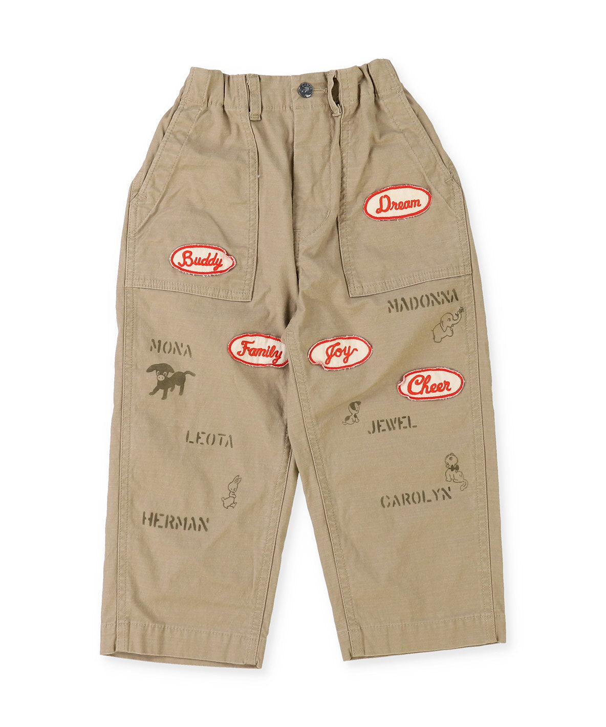 These back-satin material pants are inspired by baker pants for the armies in the 1960s as work wear designed with big pockets. These stretchy pants are using the back satin material featuring smooth texture. It has great presence with 5 patches and stencil scribbles. These pants feature the perfect color scheme with écru, embroidered patched in red and olive. They match well with grandrelle gray and oatmeal coloring sweatshirt. Complete fashionable look by wearing these pants with a cute coloring knitted cap.