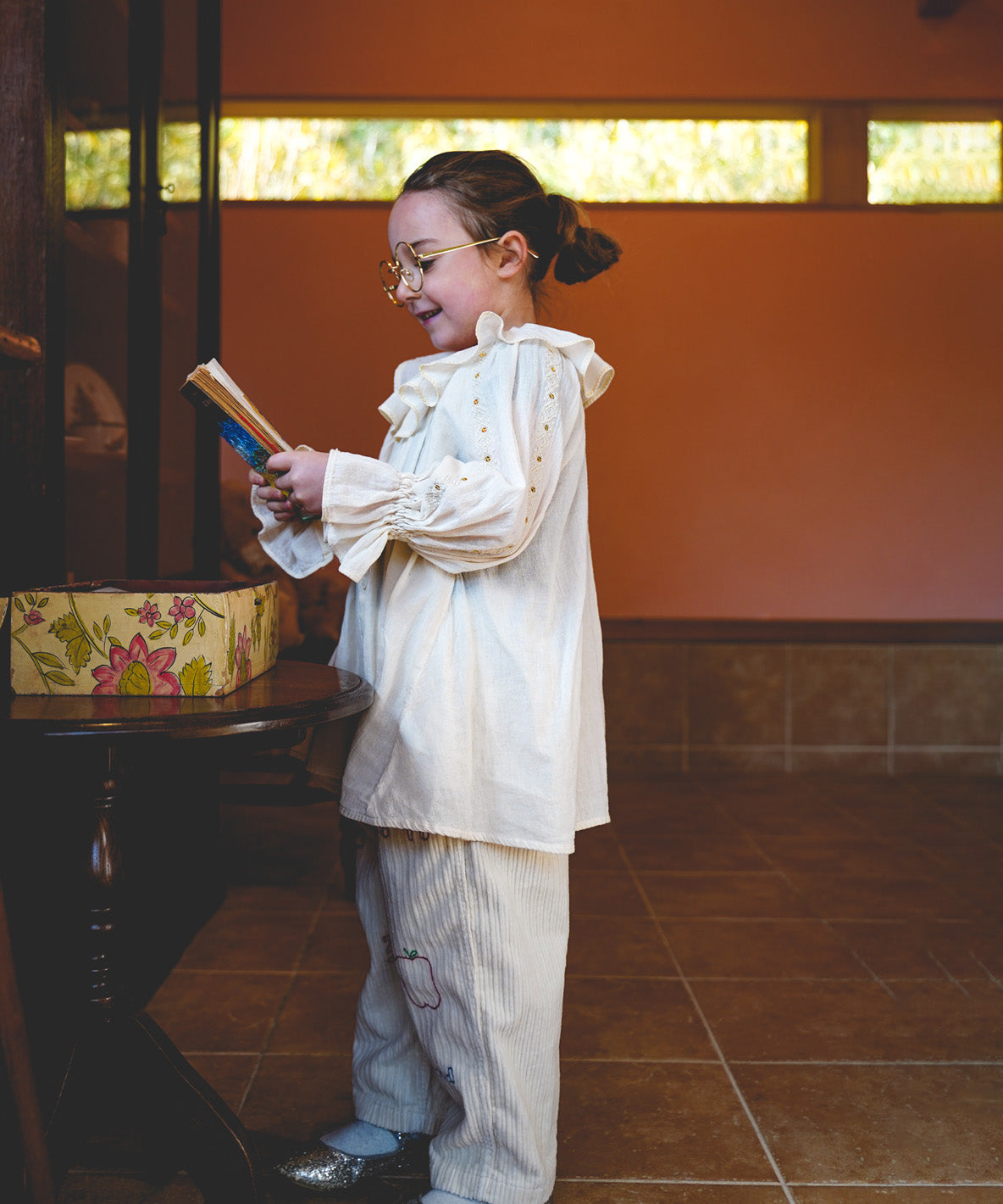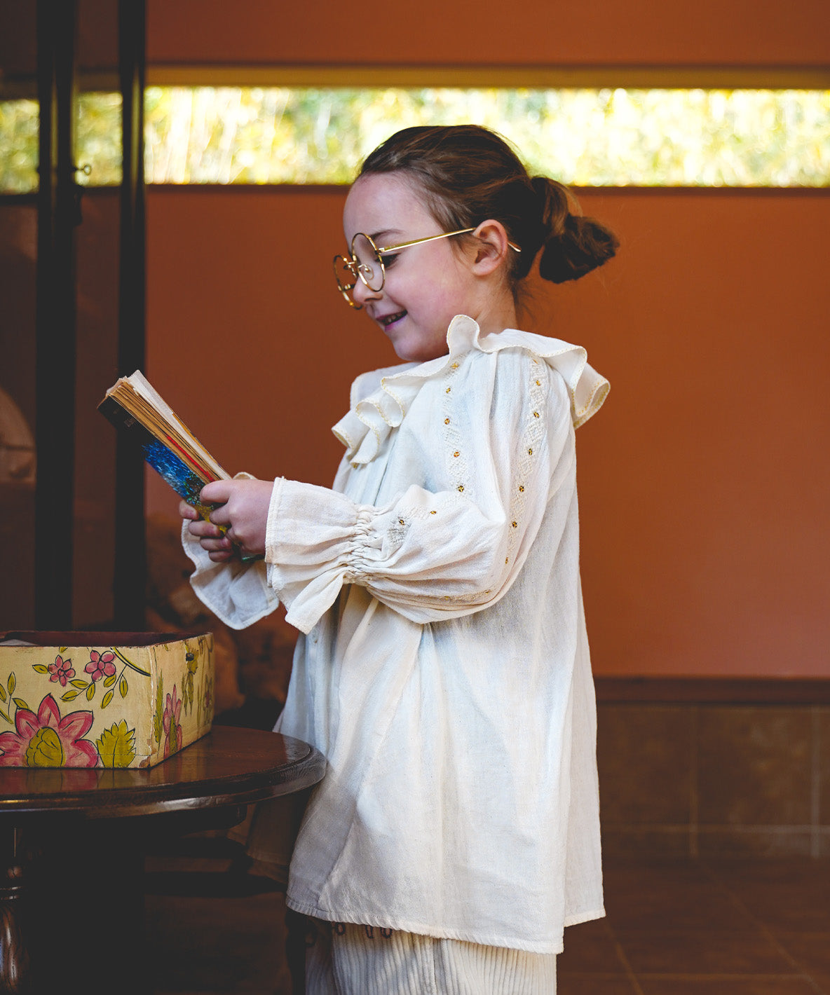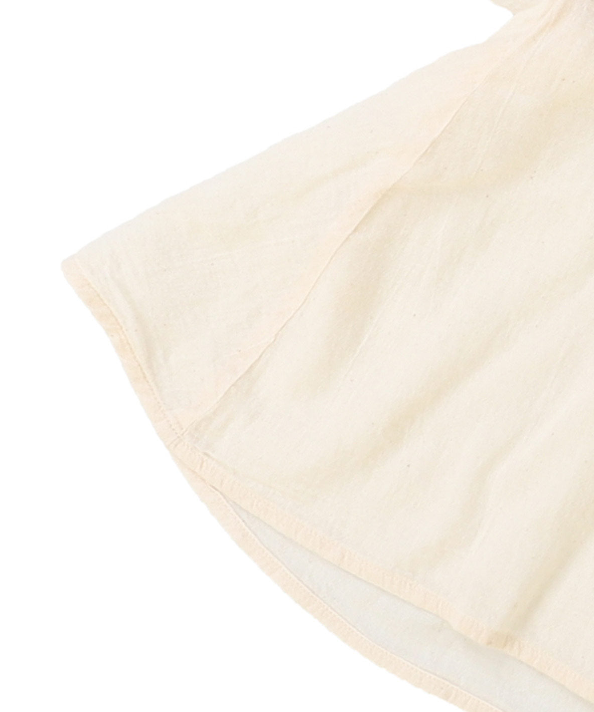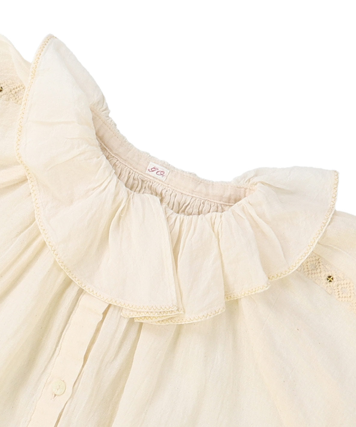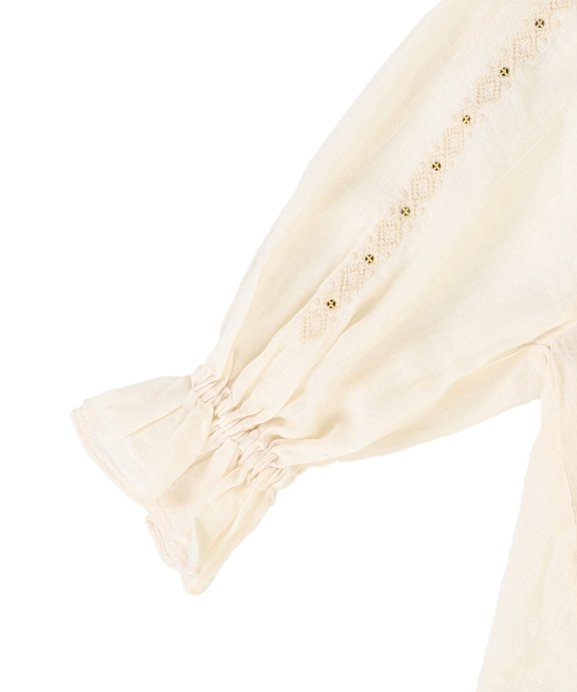 This blouse looks cute with voluminous silhouette and shiny golden stitches on the edge of ruffles. It is characterized with white embroidery and golden sequin embroidery. This blouse is using thin fabric and recommended for a light outer wear. Wear this blouse as an inner wear in the cold season.