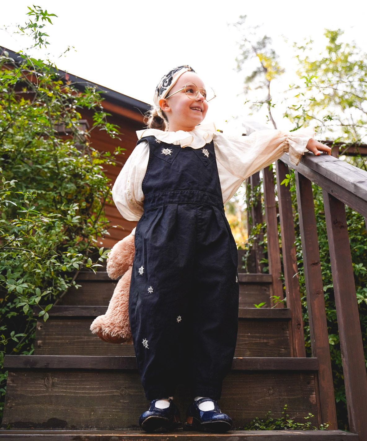 These apron pants are inspired by antique apron skirts. They are completed with unique silhouette. They look casual by pairing these pants with a sweatshirt. Enjoy romantic look with a blouse./ look sweet but accented design with anchor buttons on side They look not too feminine with these accented side anchor buttons. For toddler size, they are designed with crossed shoulder straps on the back to prevent from sliding off. For adult size, you can wear these pants with straight shoulder straps.