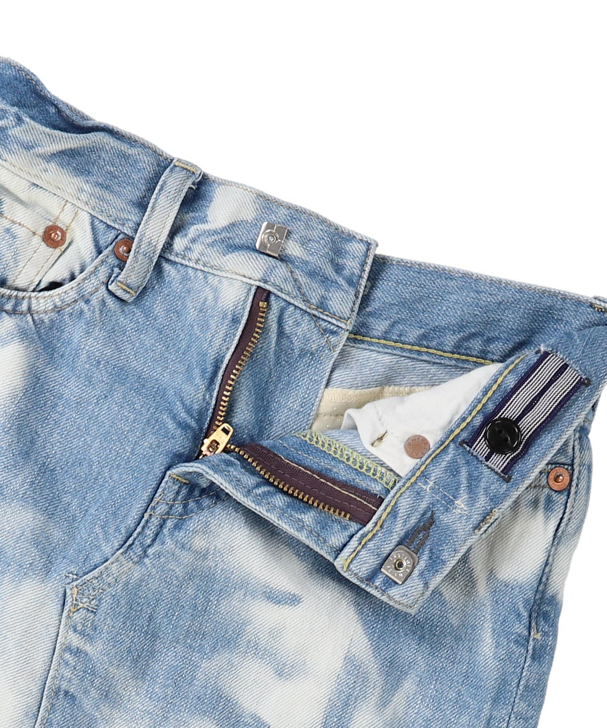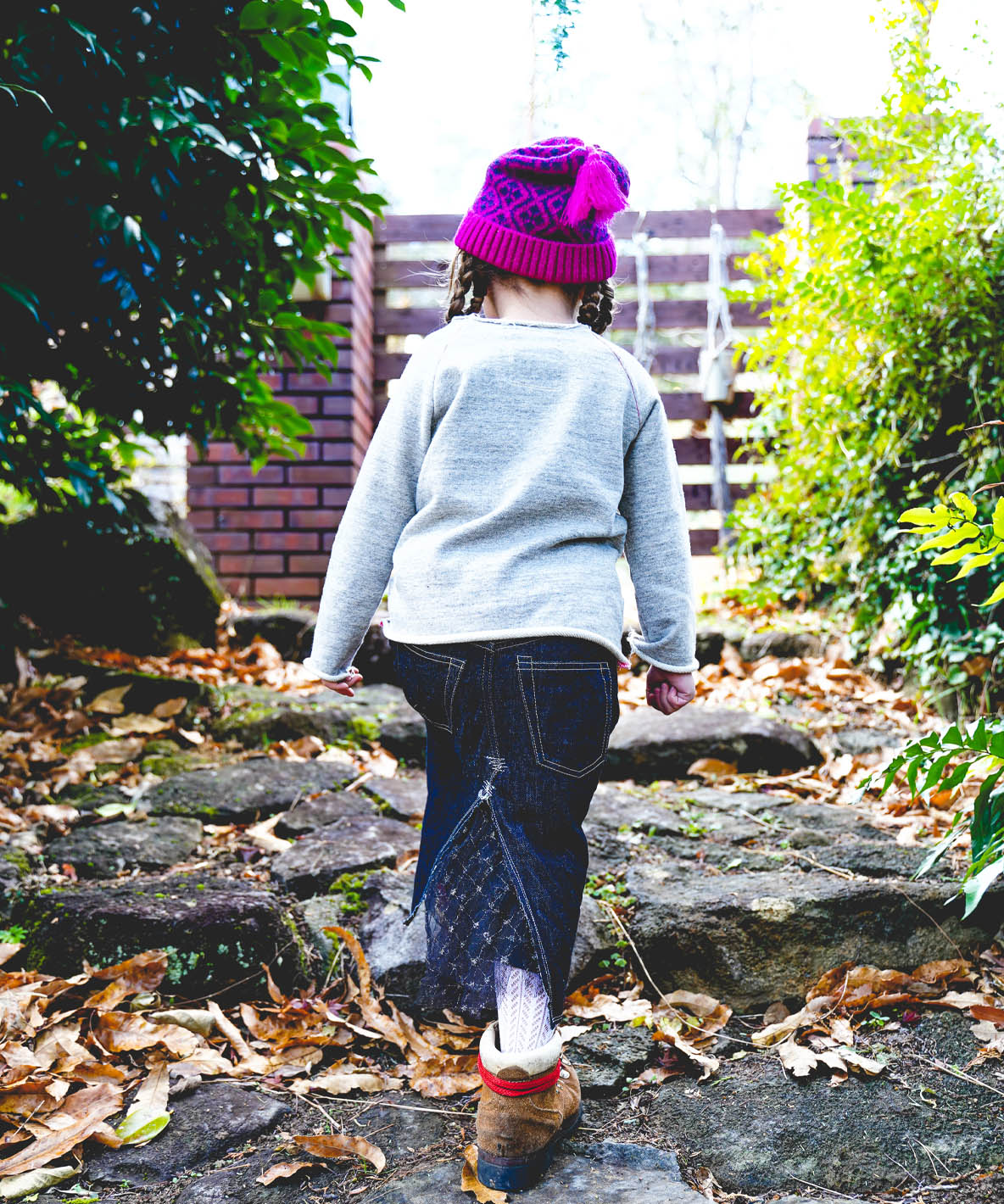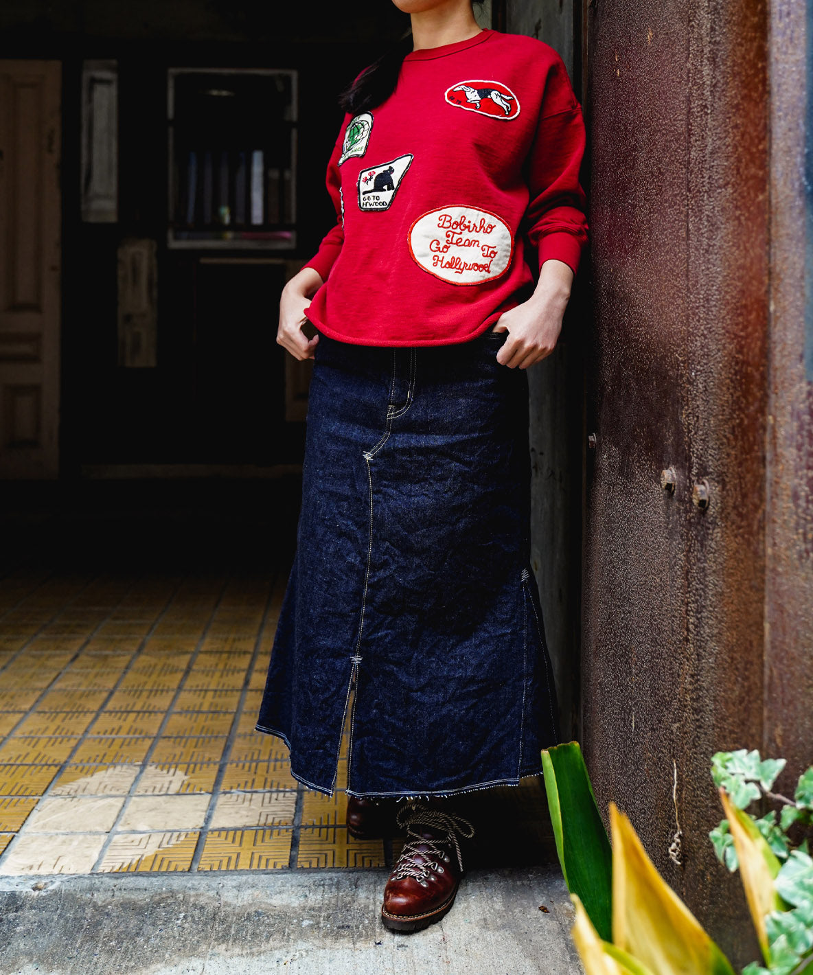 This denim skirt is designed like remaking with the 5-pocket denim pants. This long length skirt is popular revival design for mant times. It looks charming with the different impression on the front and back. New design with wild texture NAVY. It is using the G2H original sparkle lace material for the tulle on the back.