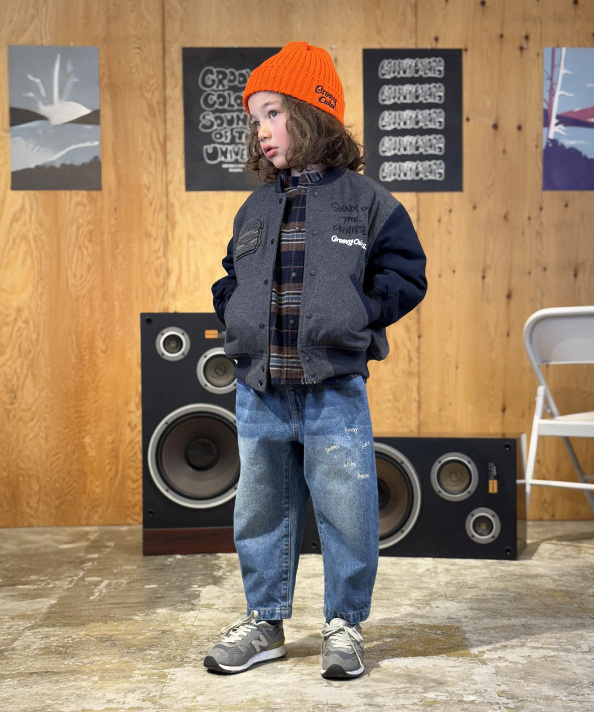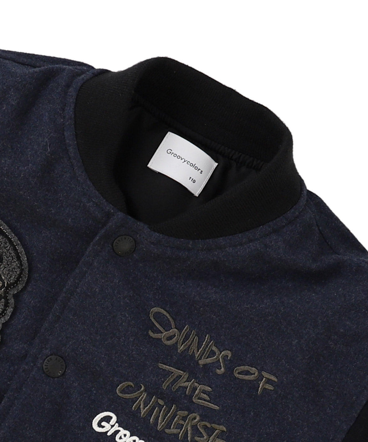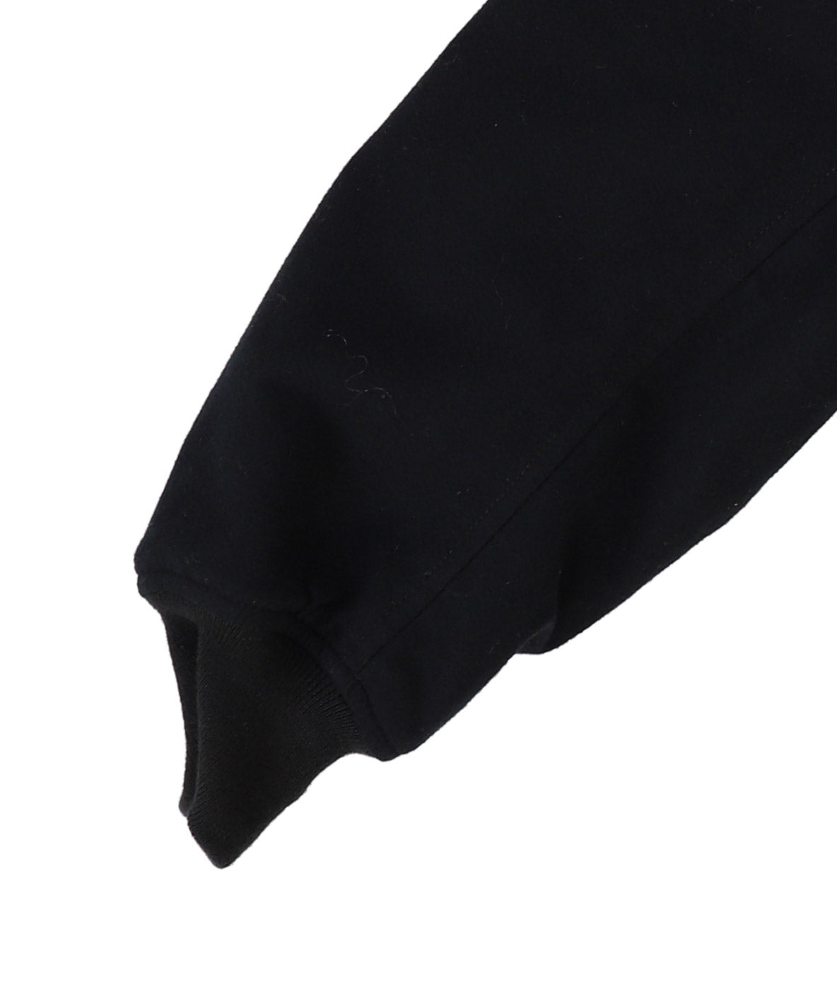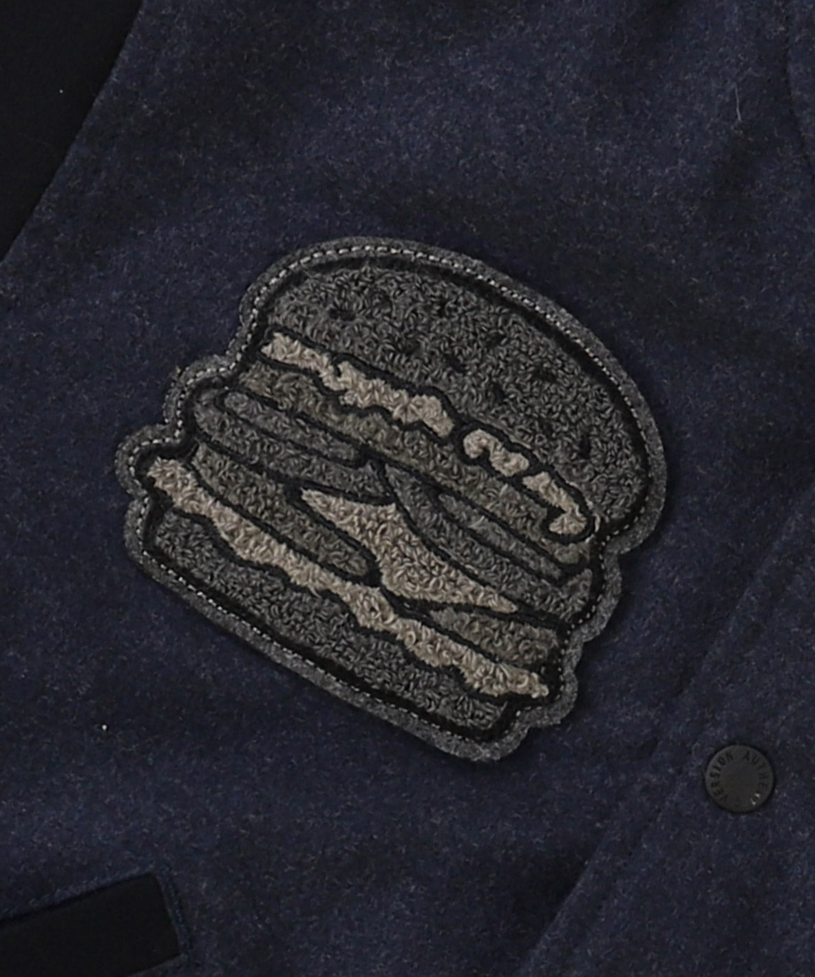Must-try outerwear from this collection. This varsity jacket is completed with chic coloring using dark two-tone colors. The outside is completed with brushed chamois cloth using top yarns featuring sophisticated melange-like texture. This jacket is not too thick by using semi-voluminous padded material. A Sagara patch on the right chest is designed with mono-tone coloring hamburger. Our brand logo is embroidered on the left chest. The back style features the impactful graphic embroidery mixing Sagara patch and logo.