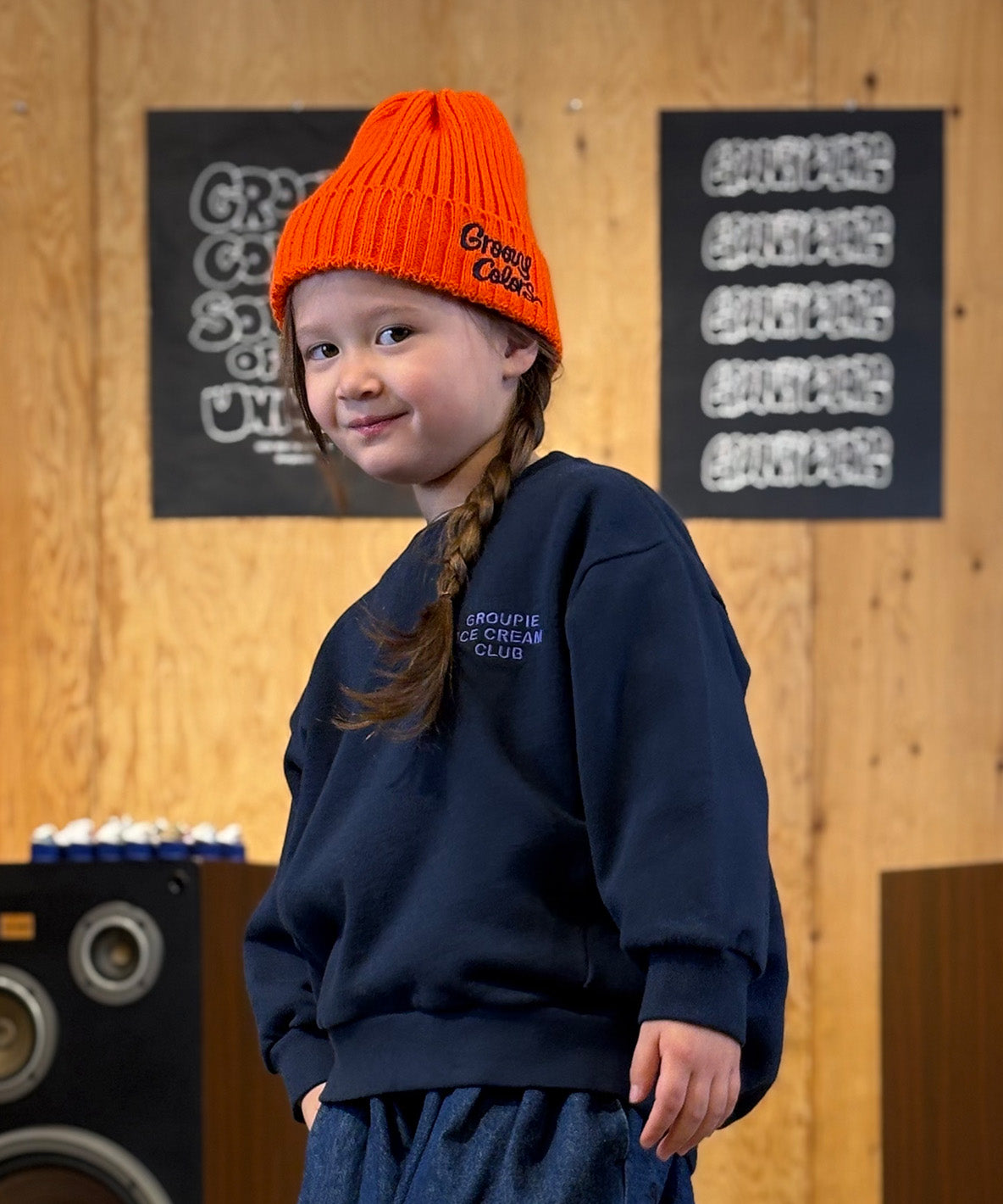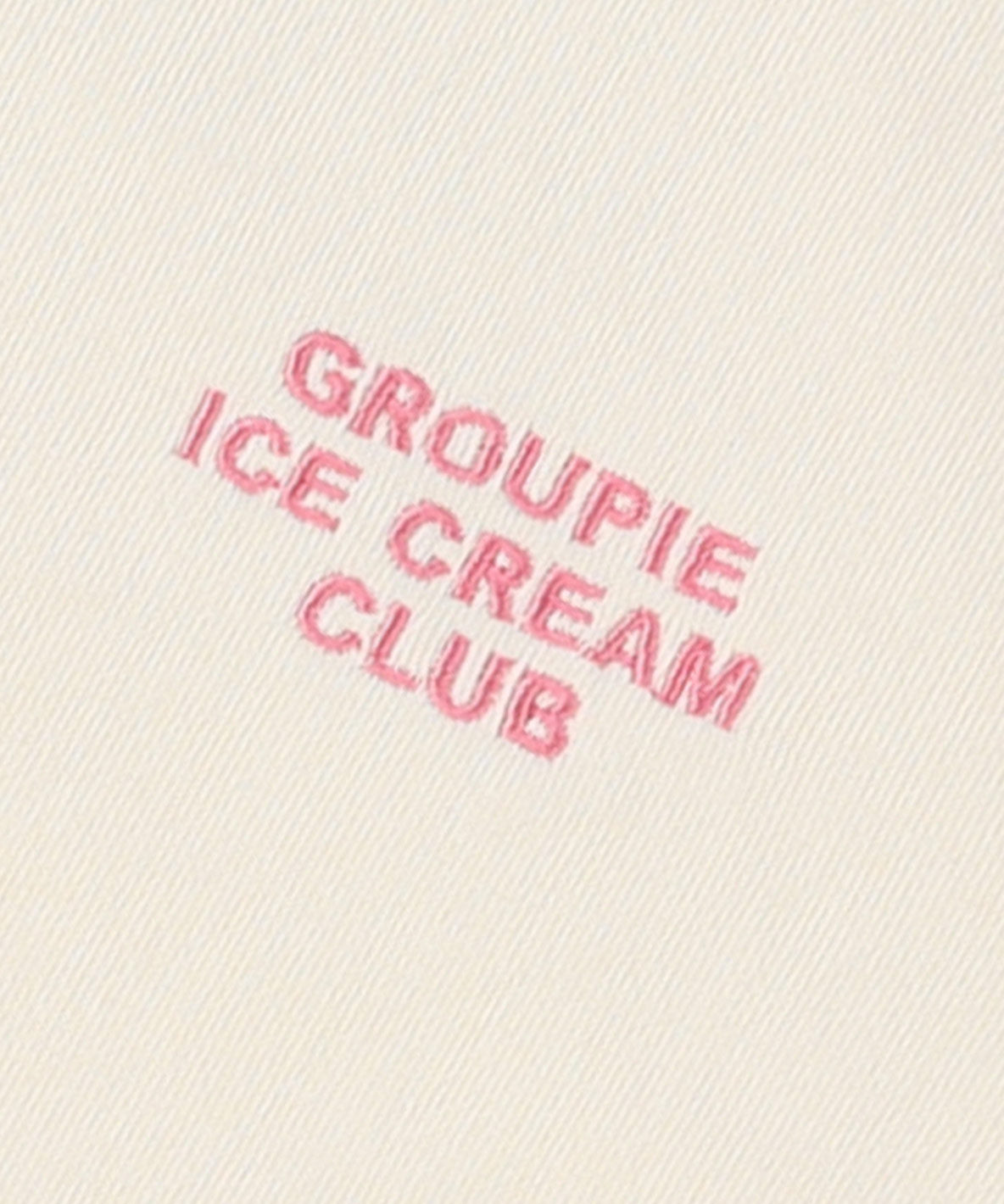 This rounded silhouette sweatshirt is using soft pile material. This silhouette features 3D design around hips with tucks and gathers. The back style is characterized with the line art of ice cream sandae printed bigly.