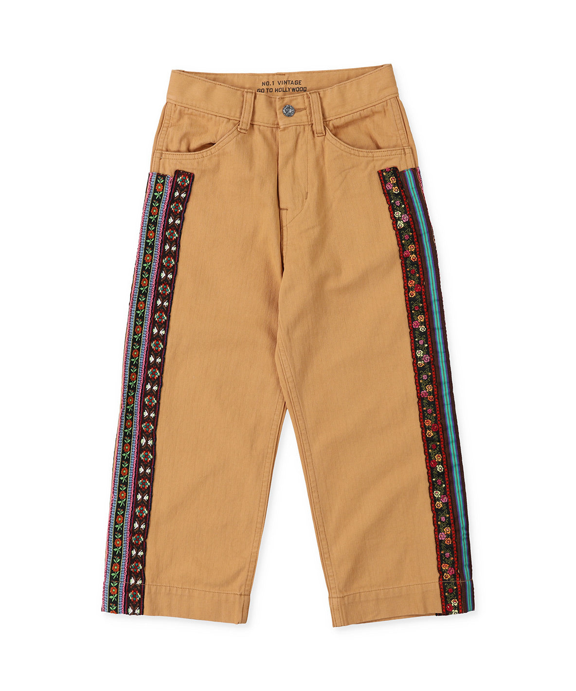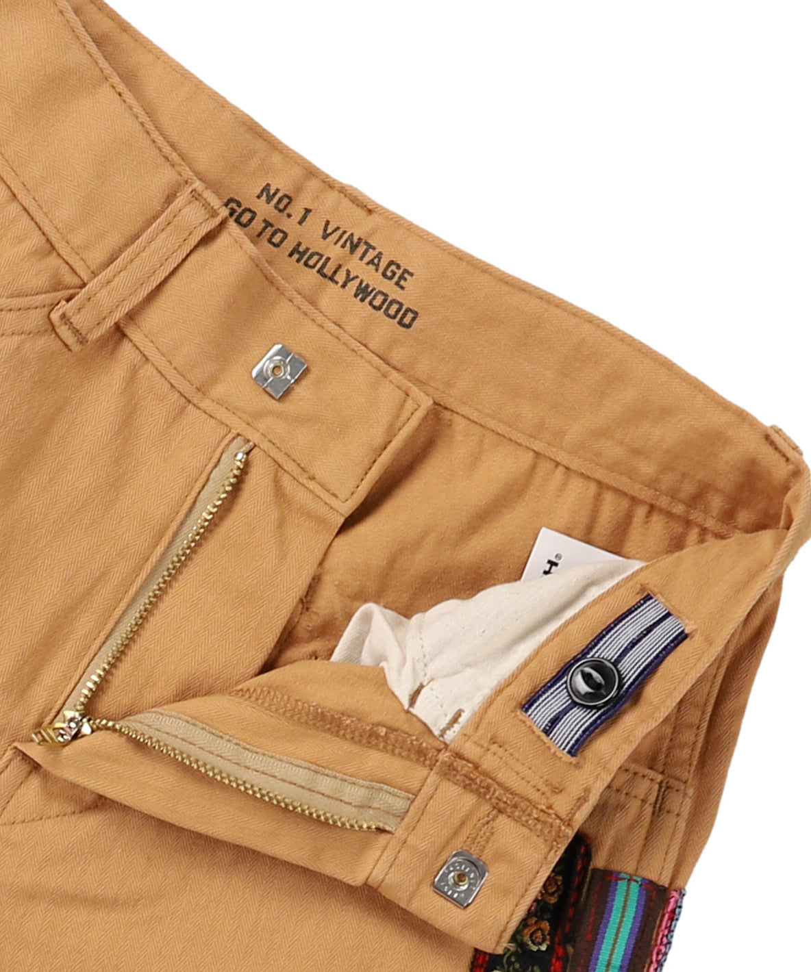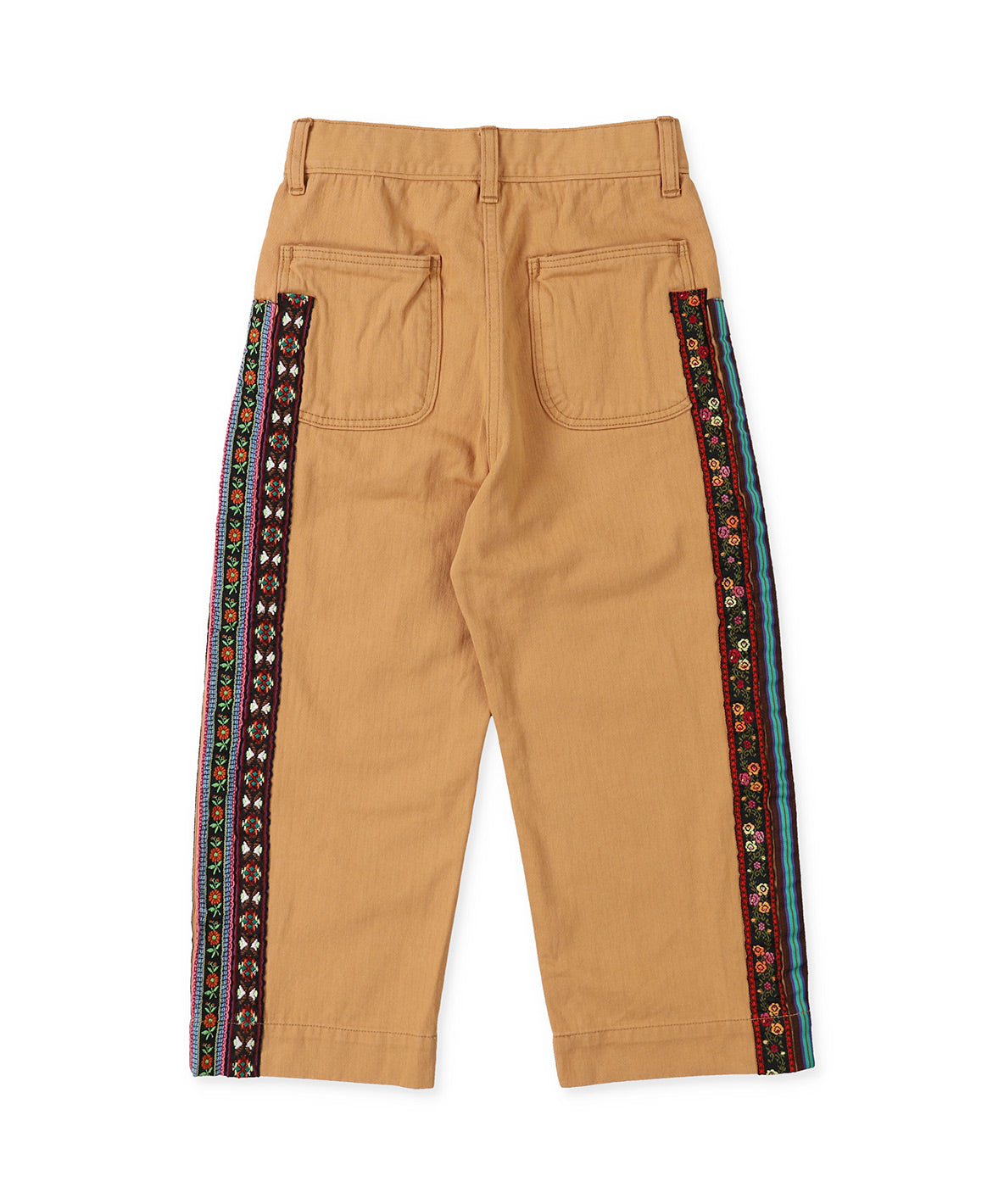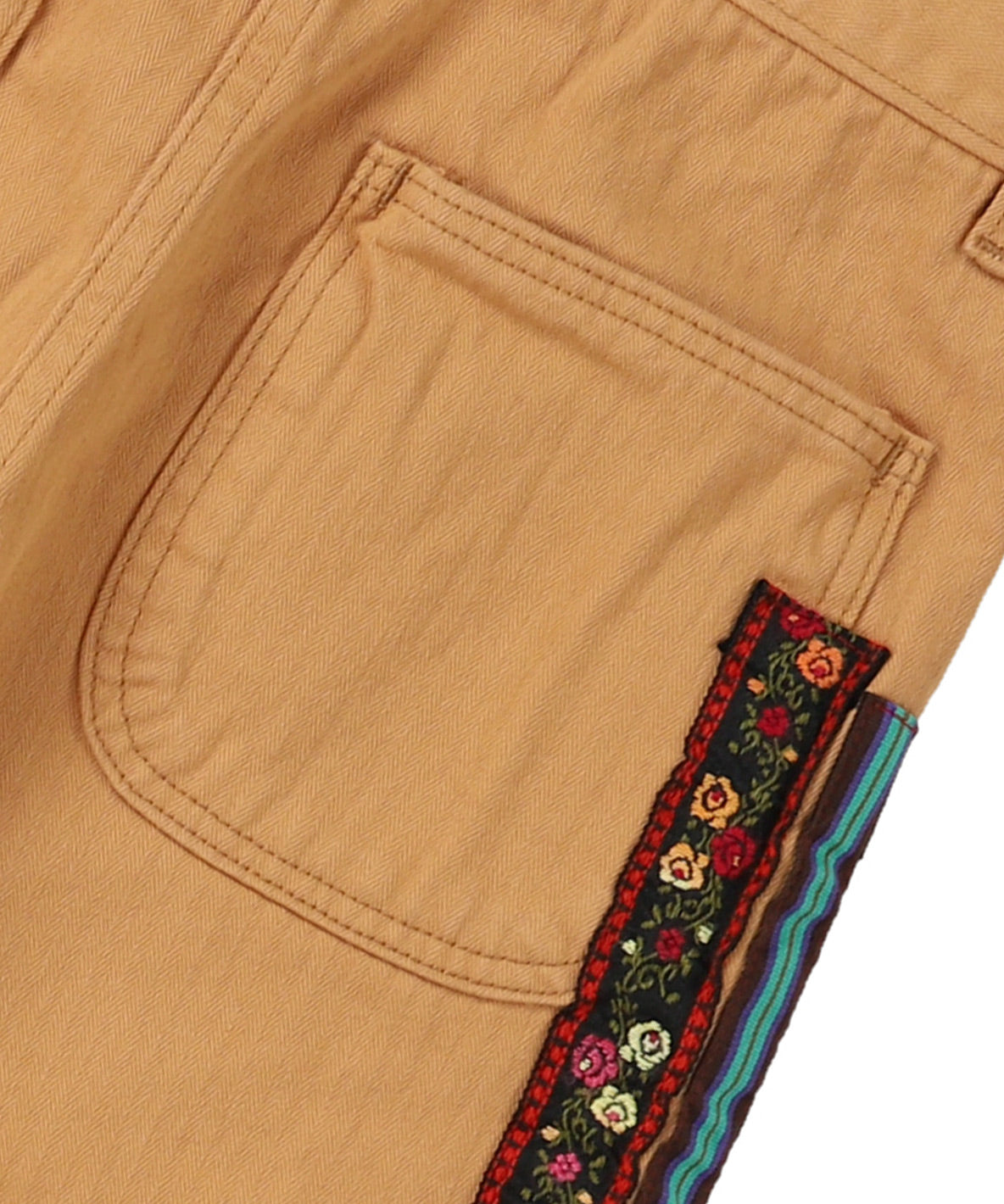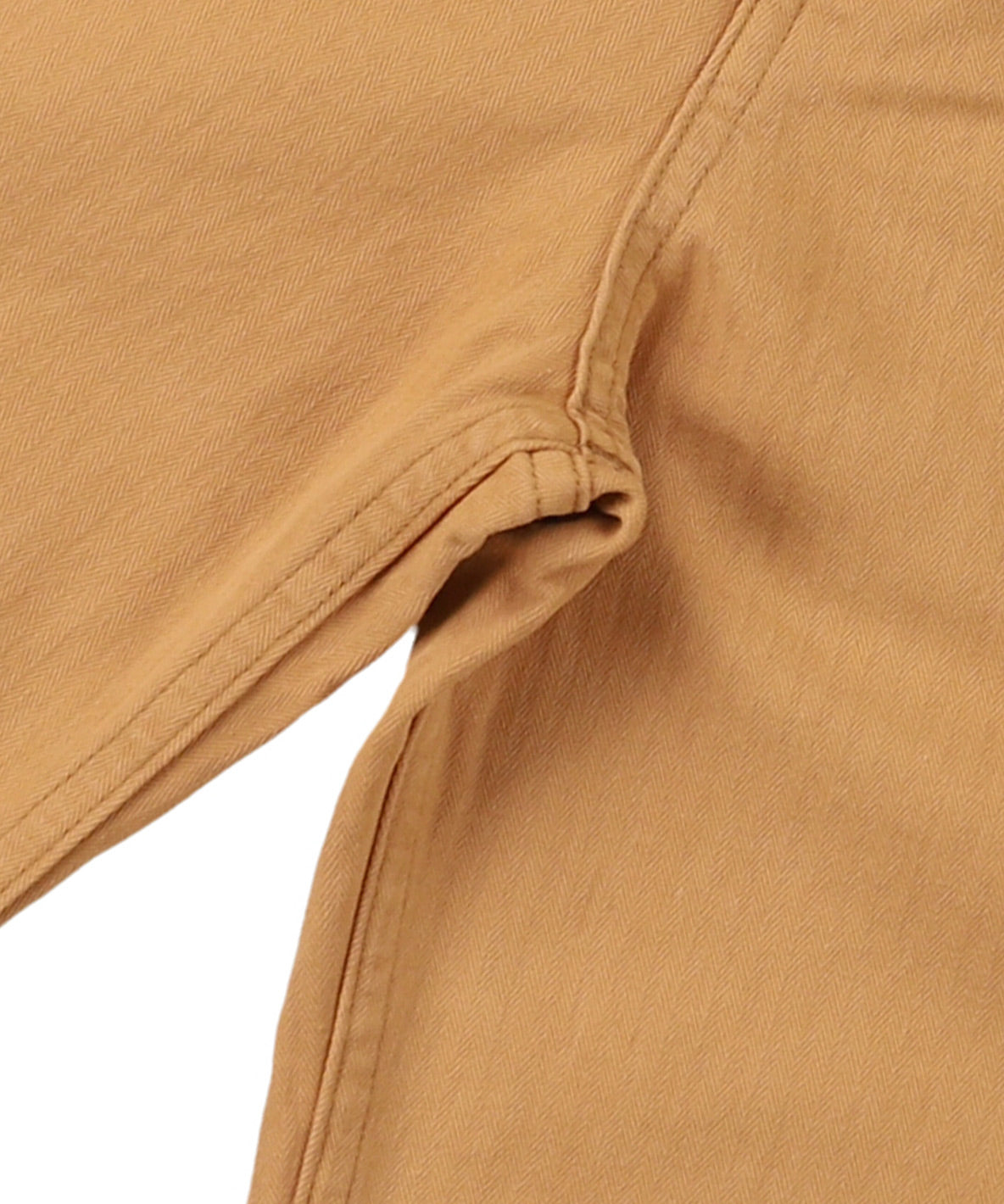 These wide long pants are using herringbone fabric with firm twill weave. It is arranging details of US NAVY N-3 trousers in the 40-50s. They are detailed with different pattern tyrolean tapes on sides. They may look slim by bold side lines and the beautiful silhouette with dropping vertically. It goes well with any clothes by designed in basic size. It is comfortable and loose to wear with clean-shaped hip line. Top-and-bottom set outfit with the jacket ref no. 1242202.