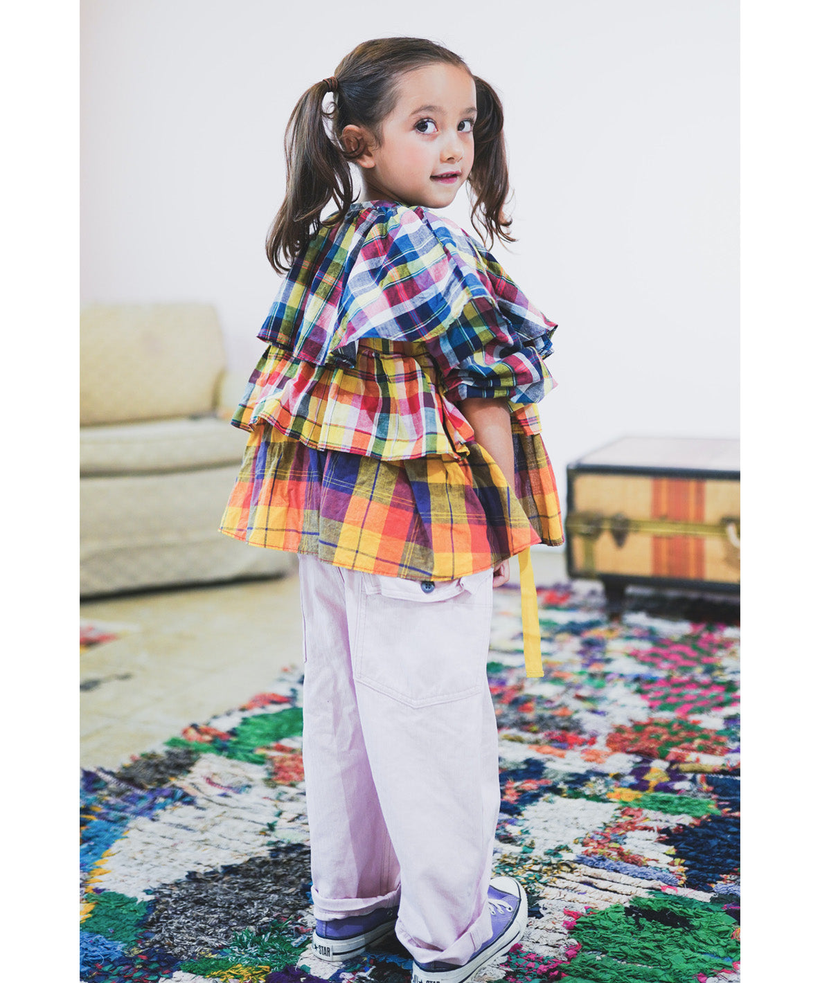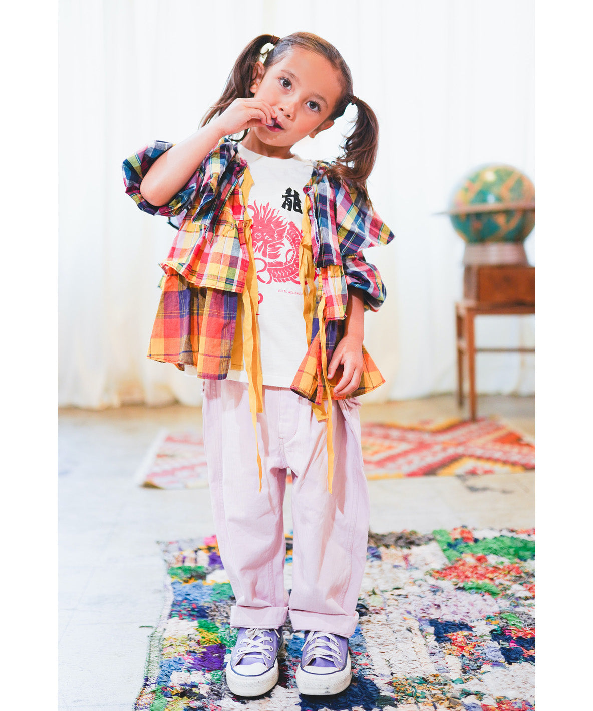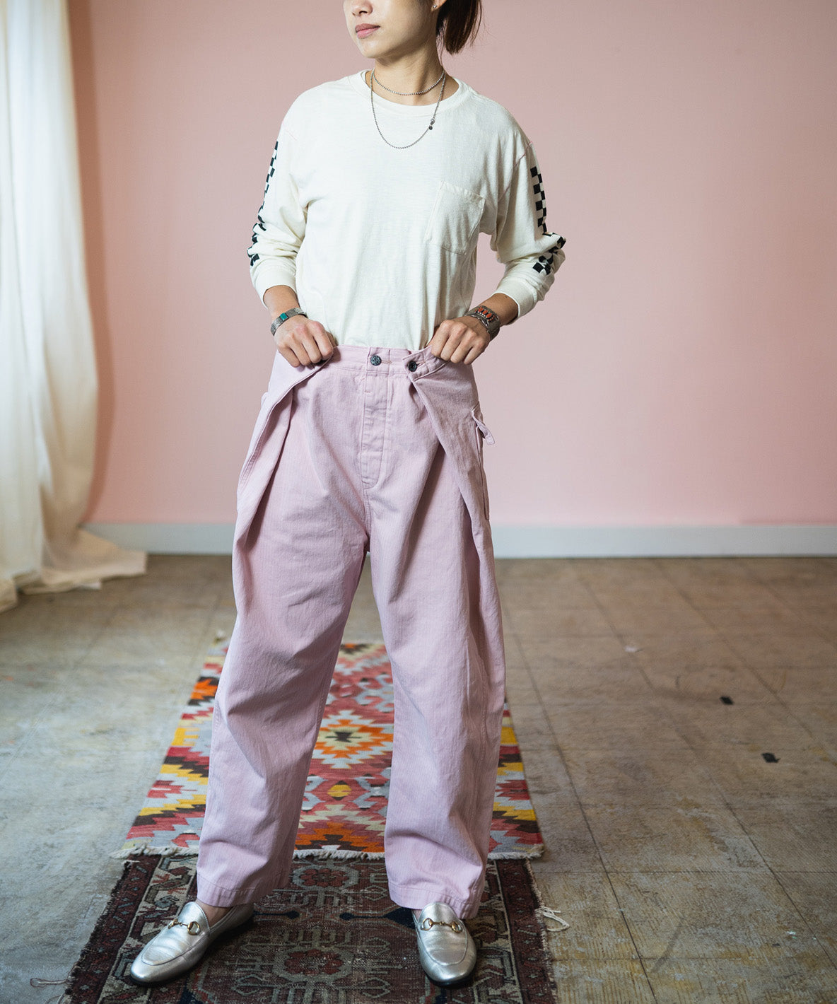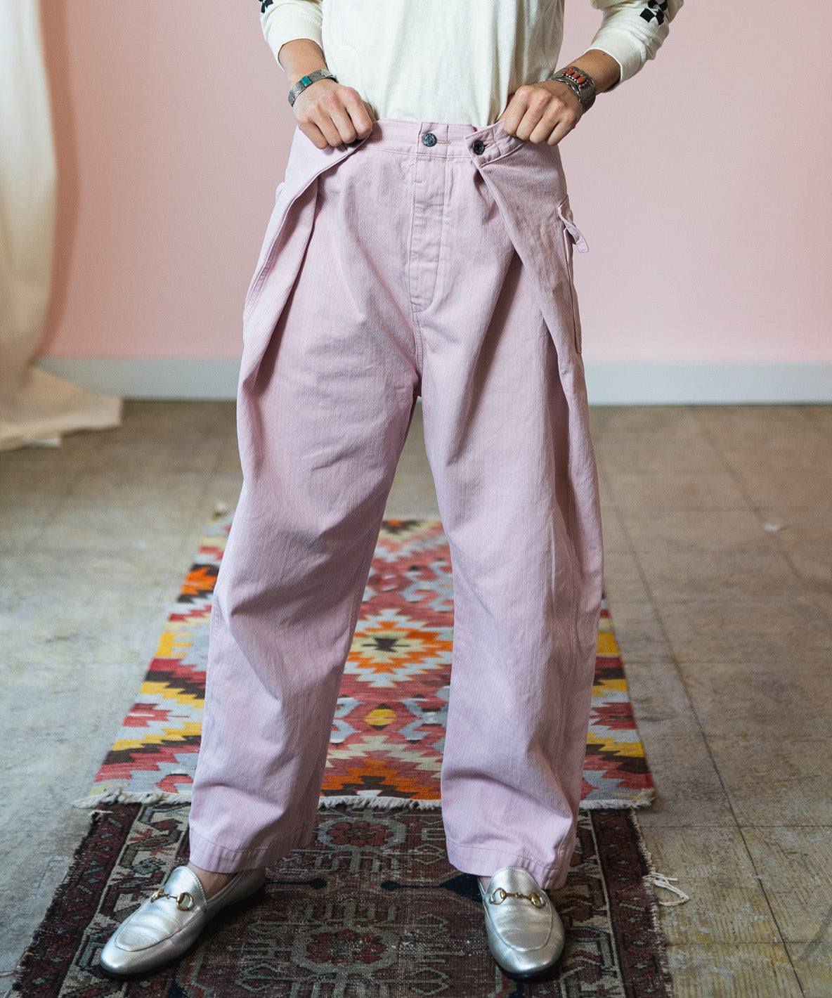 These wrapped pants are using herringbone fabric with firm twill weave. They are designed with the details of simple baker pants like worn by the old armies. You can change its silhouette of big sized pants freely with buttons on the waist.