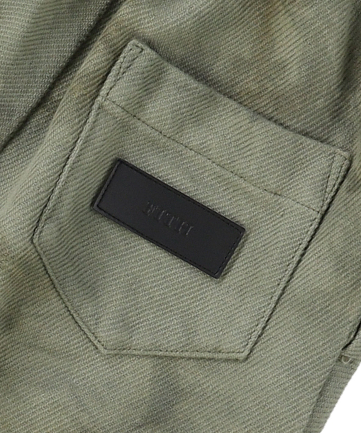 Re-product of vintage work wear pants. This material is completed with the mordern technology after analyzing vintage work wear. Completed with basket dyeing. Basket dyeing is the method dyed unevenly in a part which attaches to the iron basket or not. There are nothing same by handicraft with craftmen's skills. Enjoy this gradation completed with the basket dyeing which is the Japanese craftsmanship we proudly present to the world. Designed with side tucks. They are easy to wear with the elasticated waist.