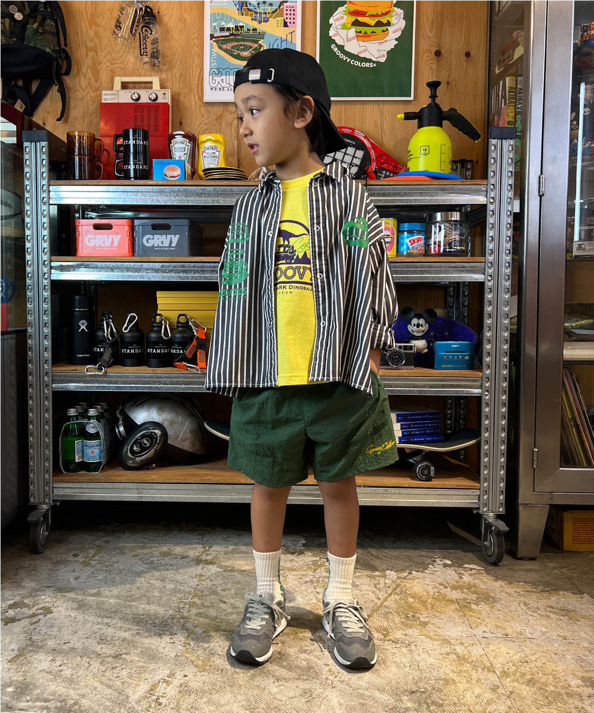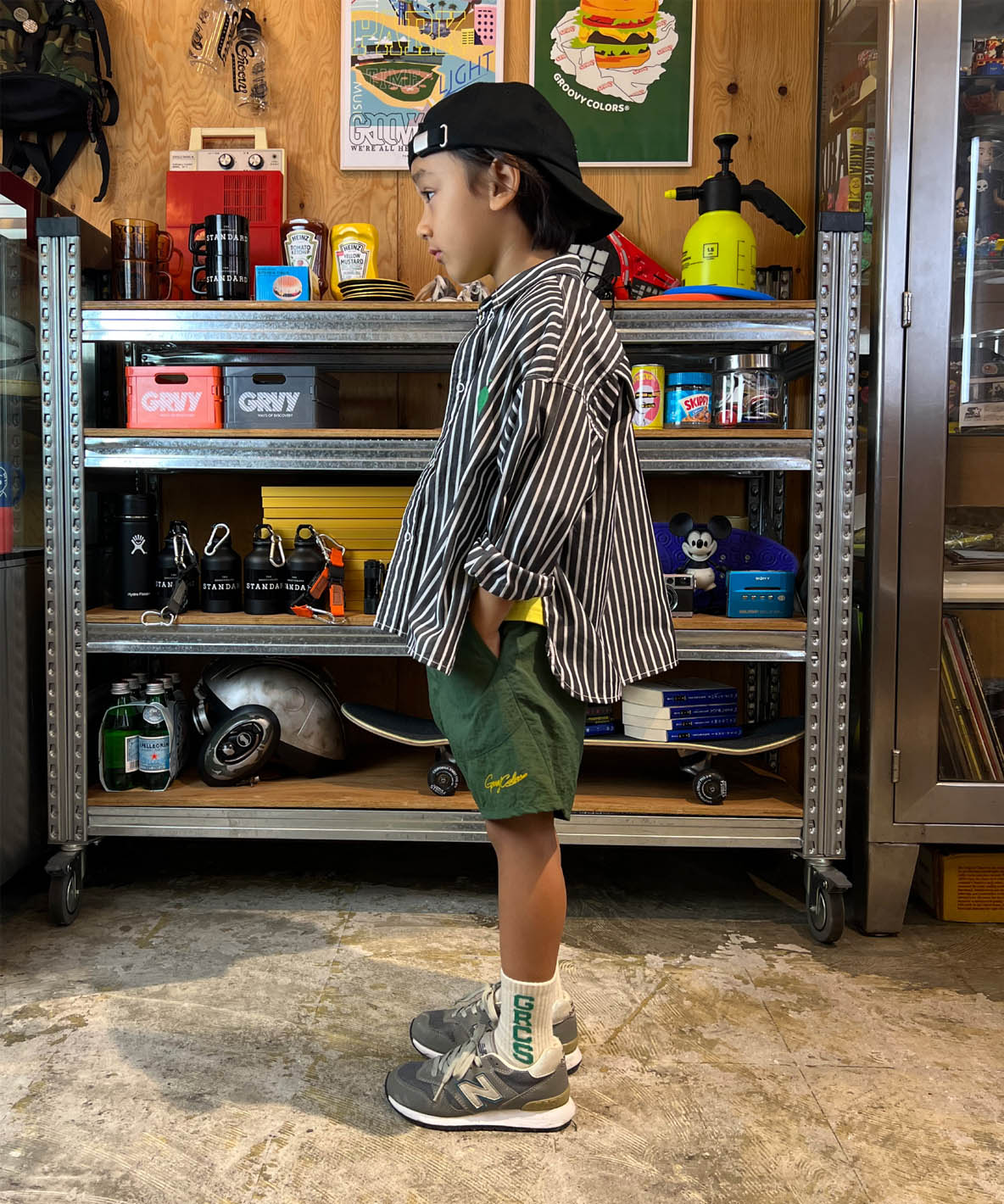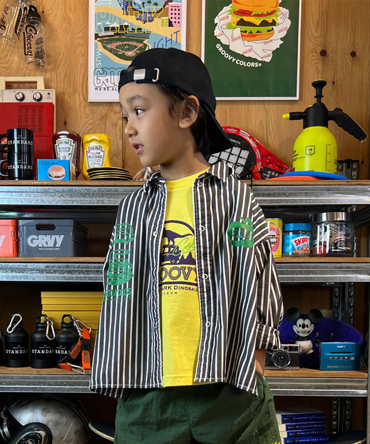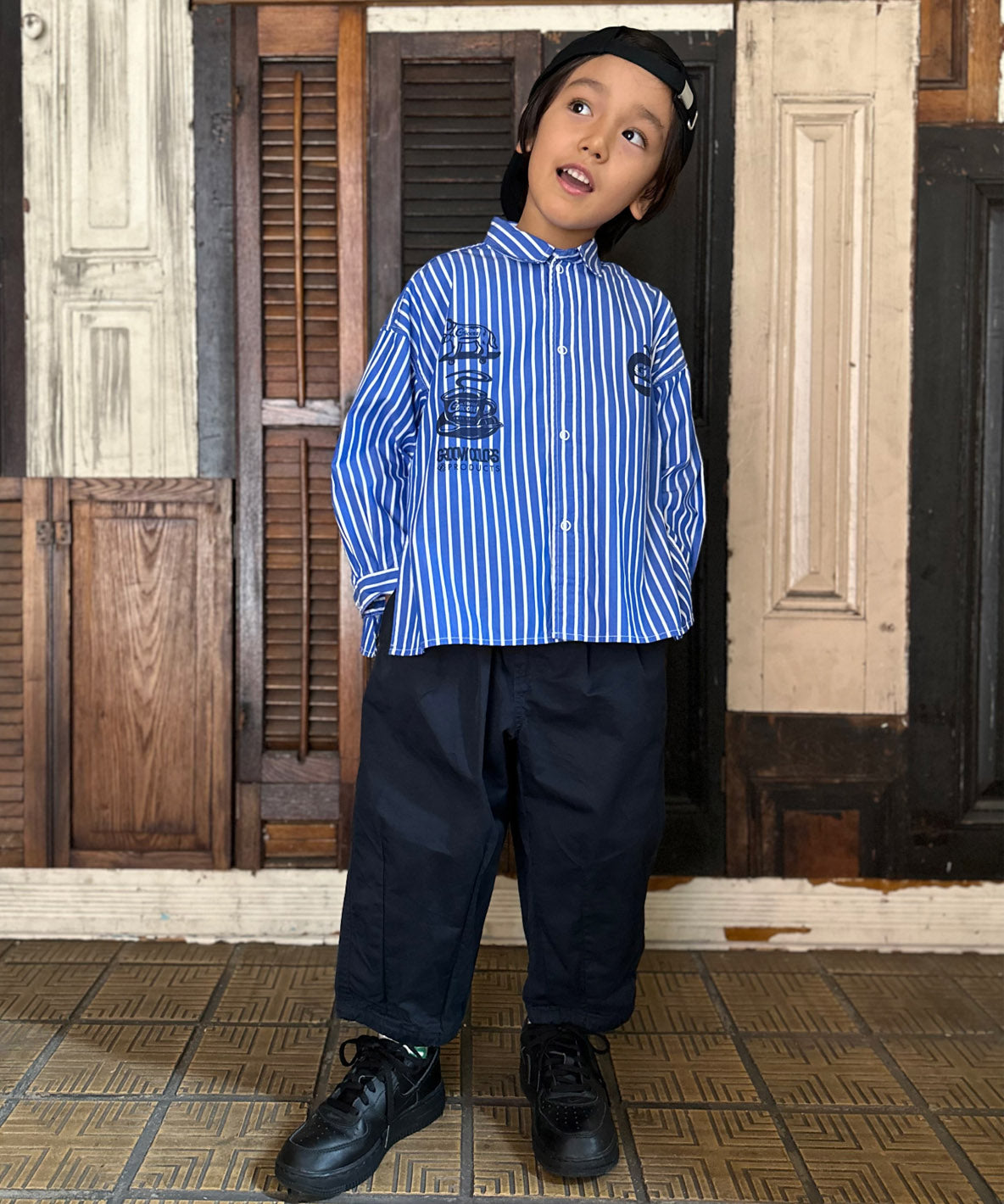 This wide silhouette shirt is using the chic striped fabric. It is detailed with big slits on both sides. The front design is completed with the graphic printing inspired by "PARK".