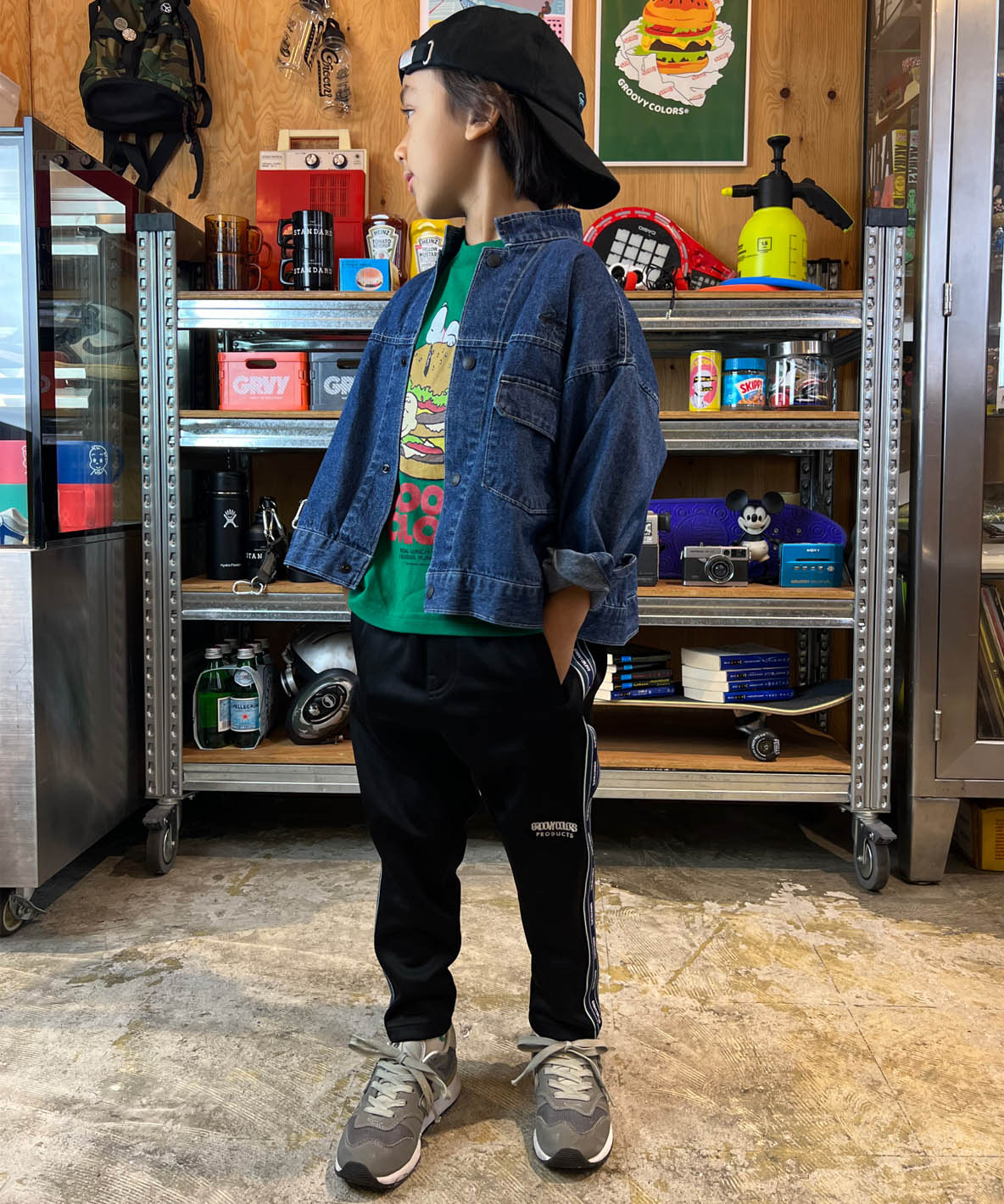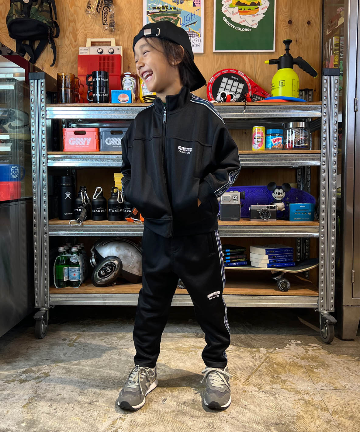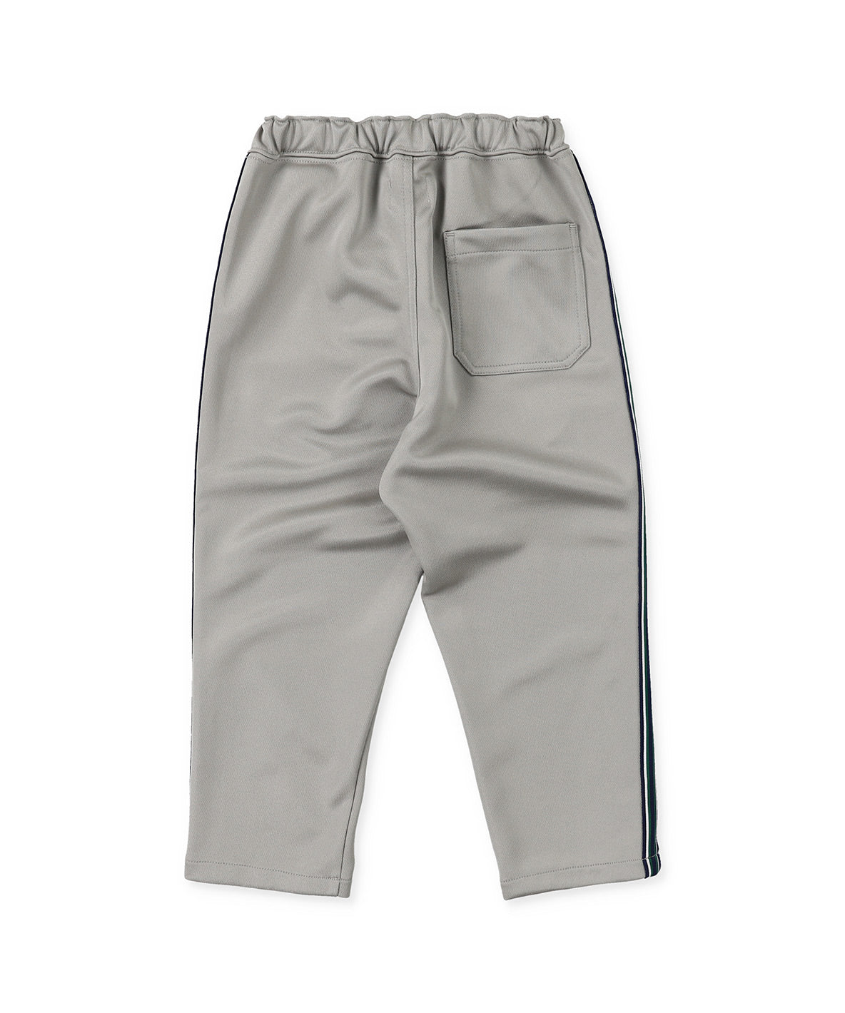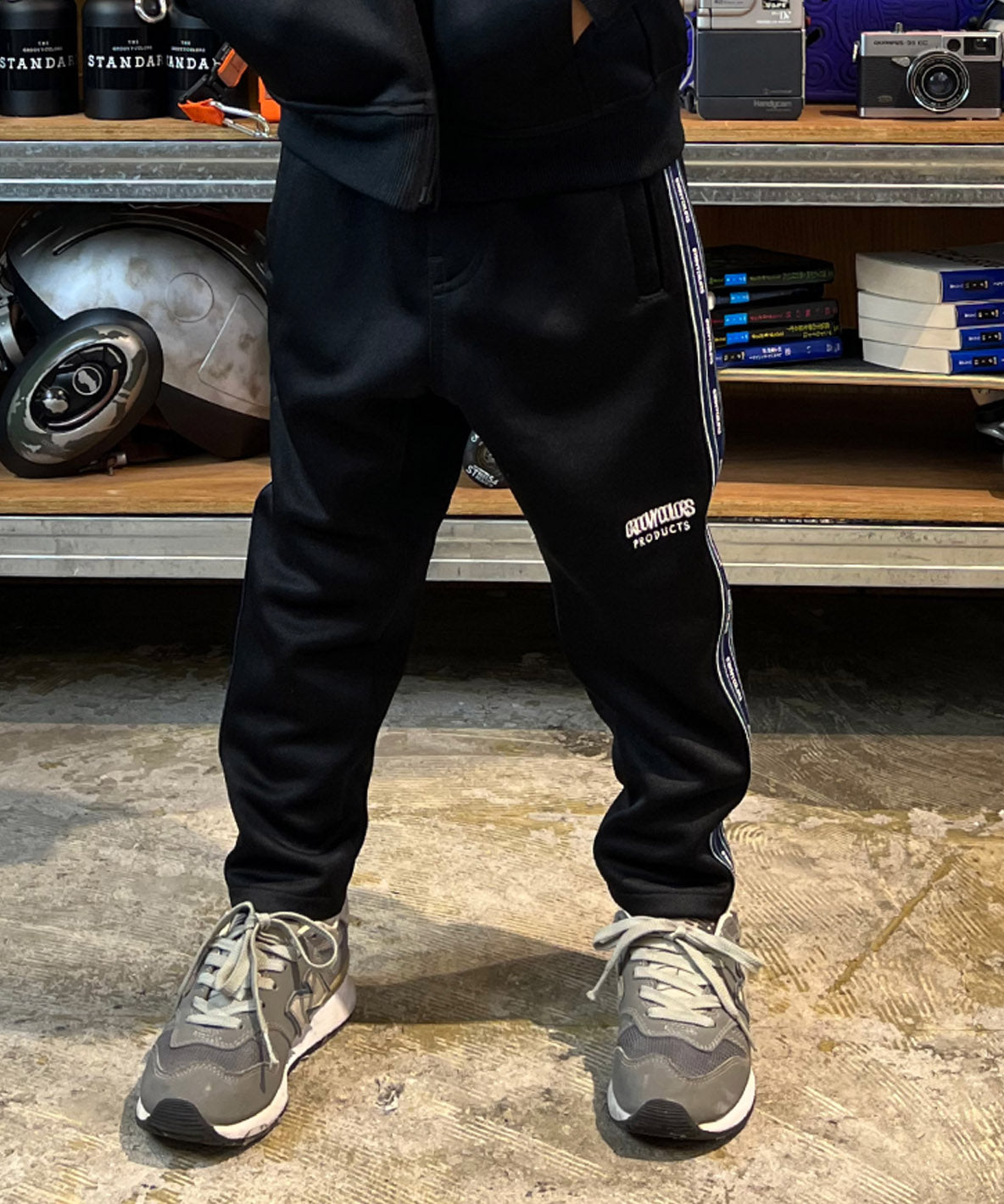 These stylish truck pants are completed with the elasticated polyester fabric. It is designed as the loose silhouette around hips. They are getting skinnier from knees to hem. Recommended for the town and sports scenes. It is detailed with the original line tapes on both sides. The embroidered brand logo is placed on the left knee.